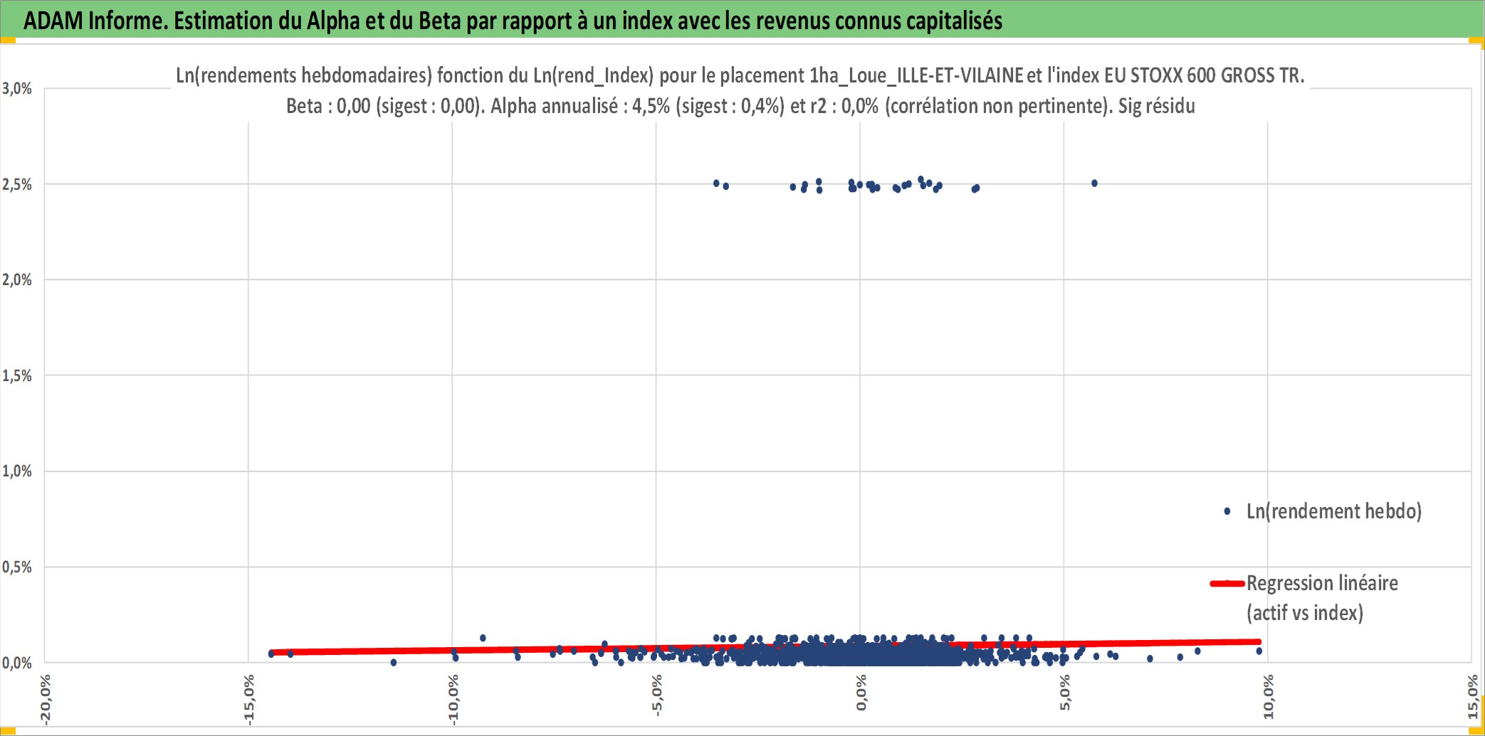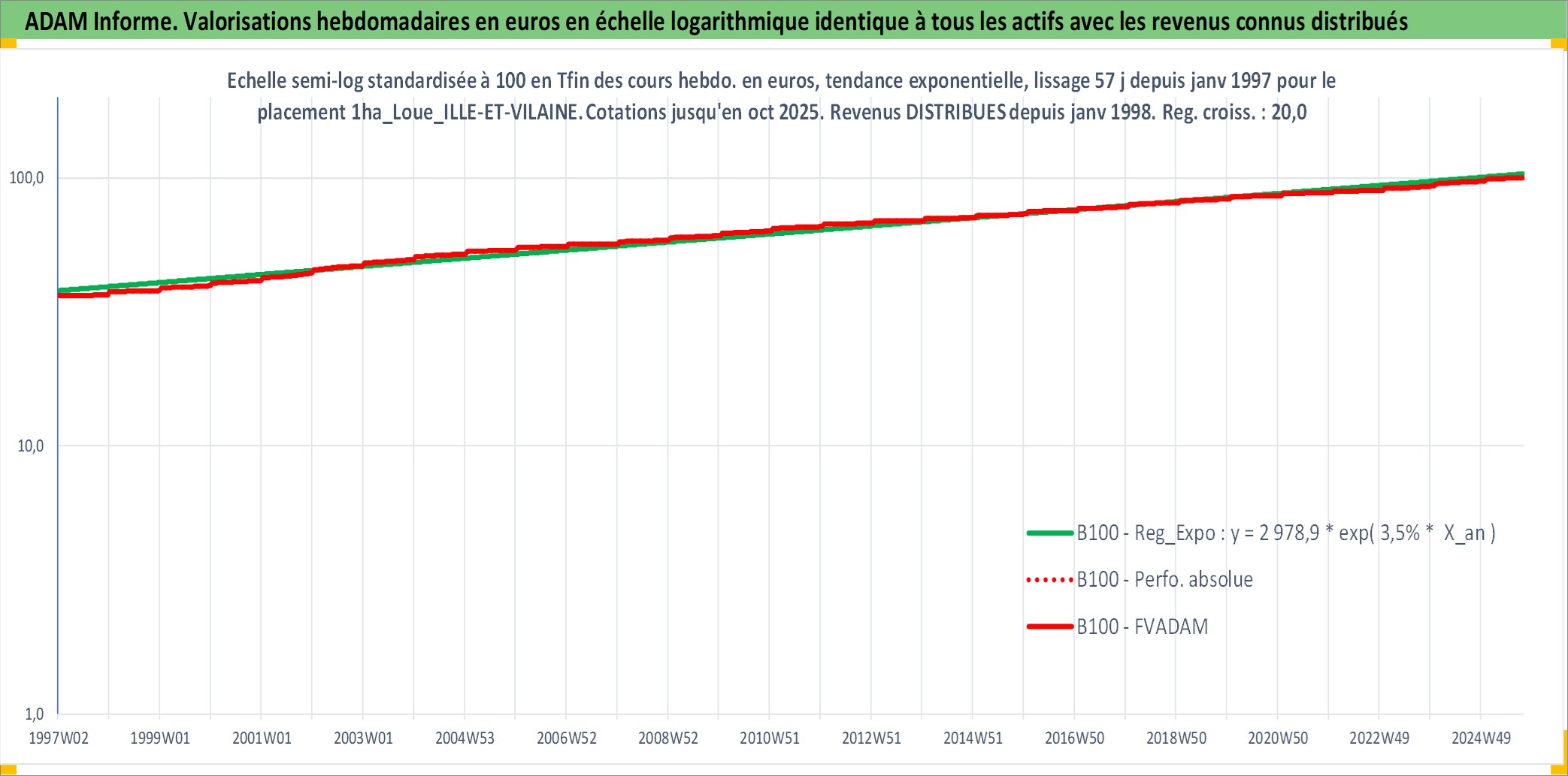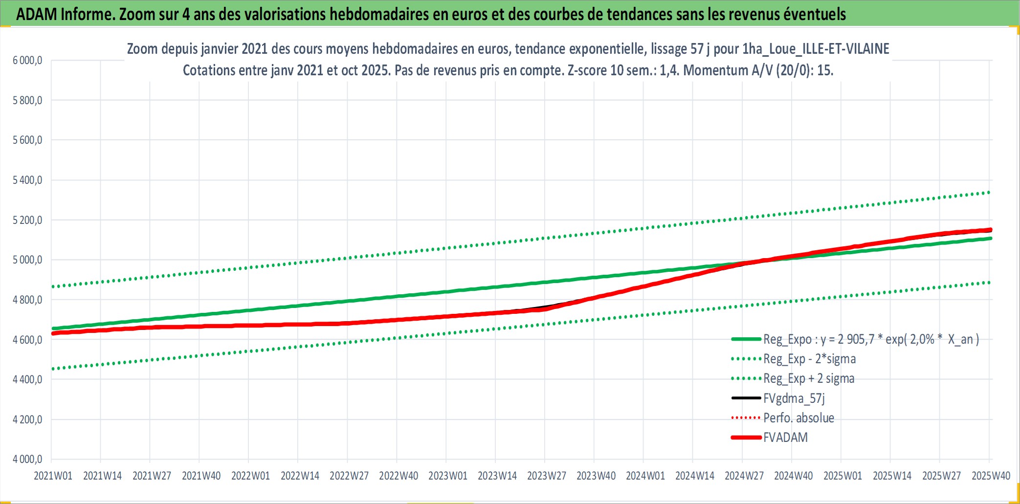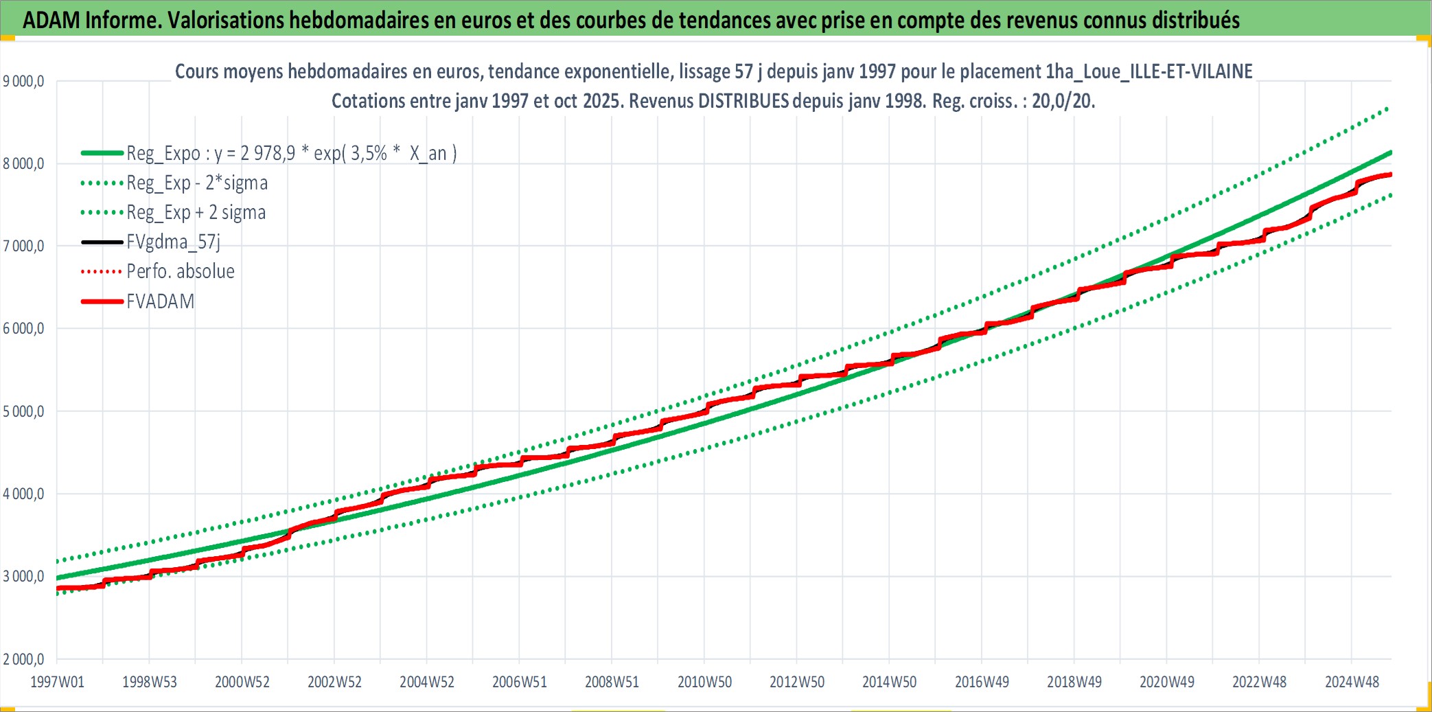 Site dédié aux investisseursPage dédiée sur site financeAnalyse des valorisations hebdomadaires de l'actif 1ha_Loue_ILLE-ET-VILAINE. Cet actif est cote en EUR. Les valorisations couvrent les semaines 1997W01 a 2025W40. Les fermages de ce bien foncier sont pris egaux a 2,5% annuels de la valeur venale du bien.