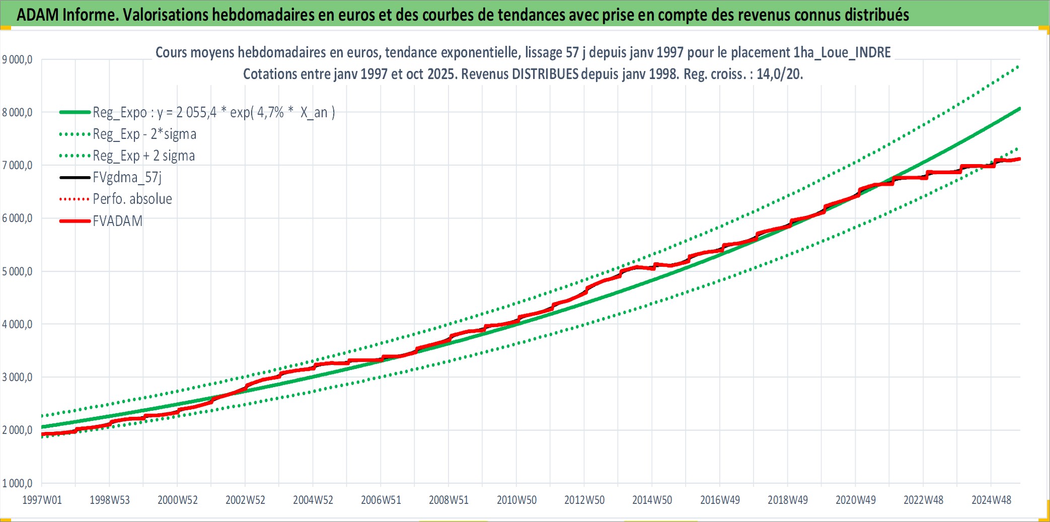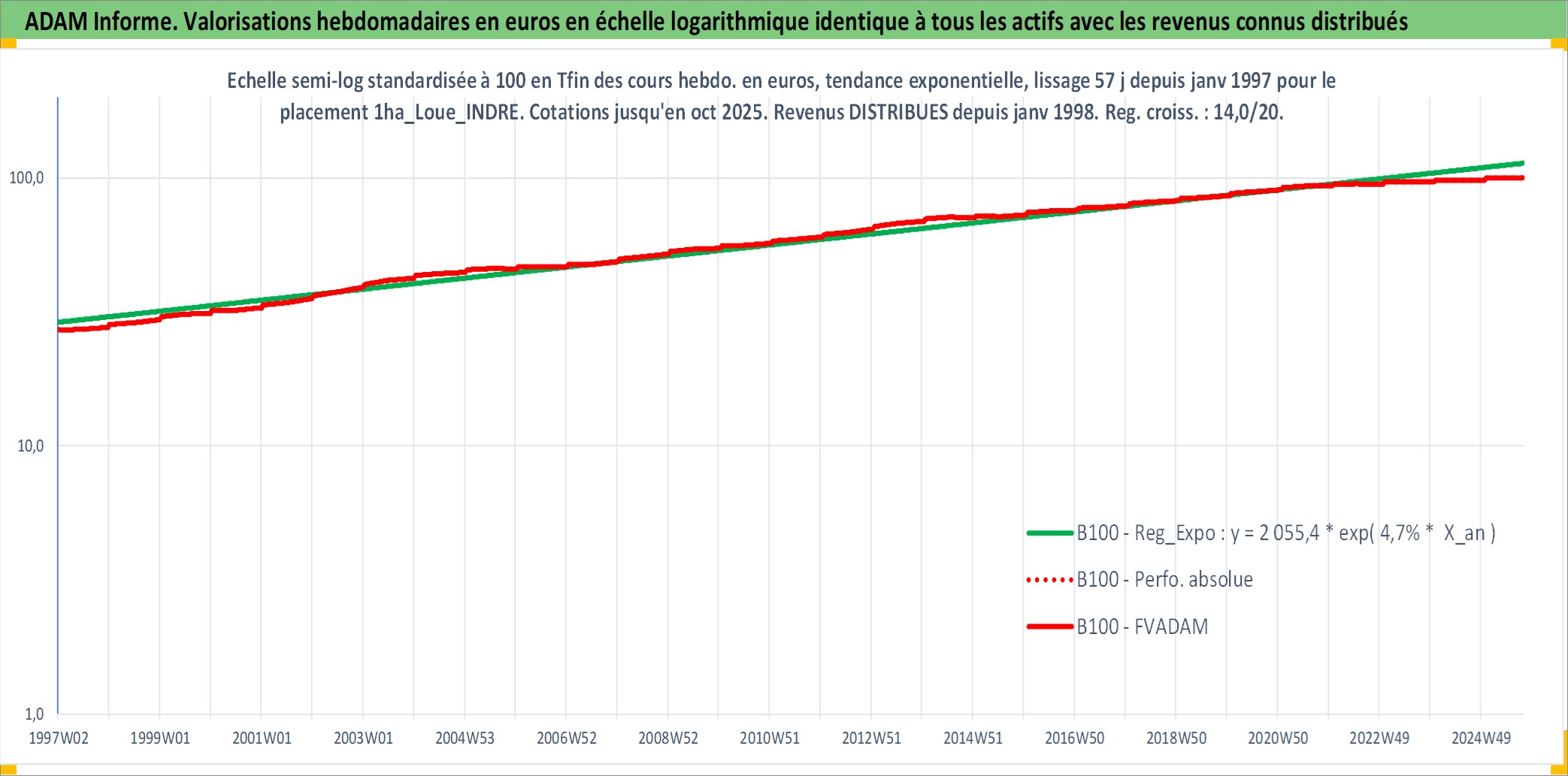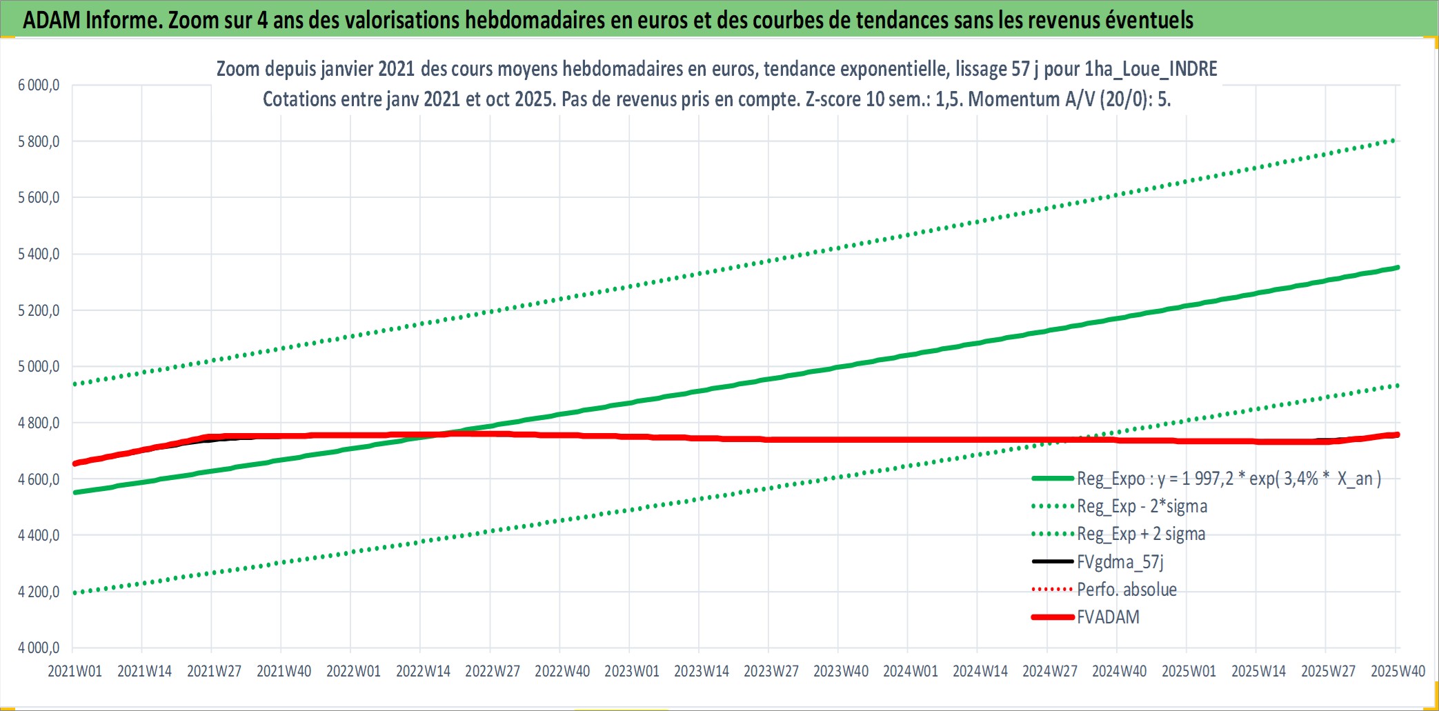 Site dédié aux investisseursPage dédiée sur site financeAnalyse des valorisations hebdomadaires de l'actif 1ha_Loue_INDRE. Cet actif est cote en EUR. Les valorisations couvrent les semaines 1997W01 a 2025W40. Les fermages de ce bien foncier sont pris egaux a 2,5% annuels de la valeur venale du bien.