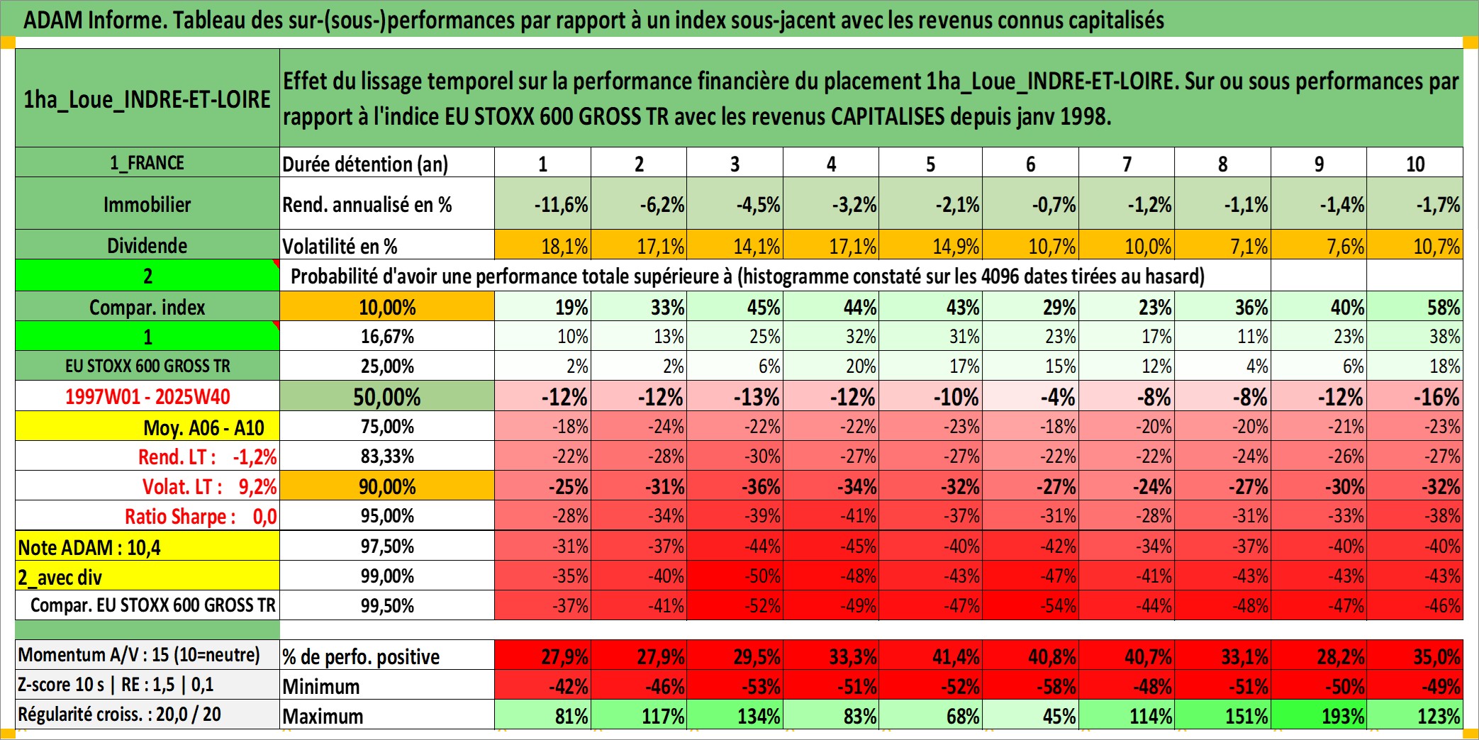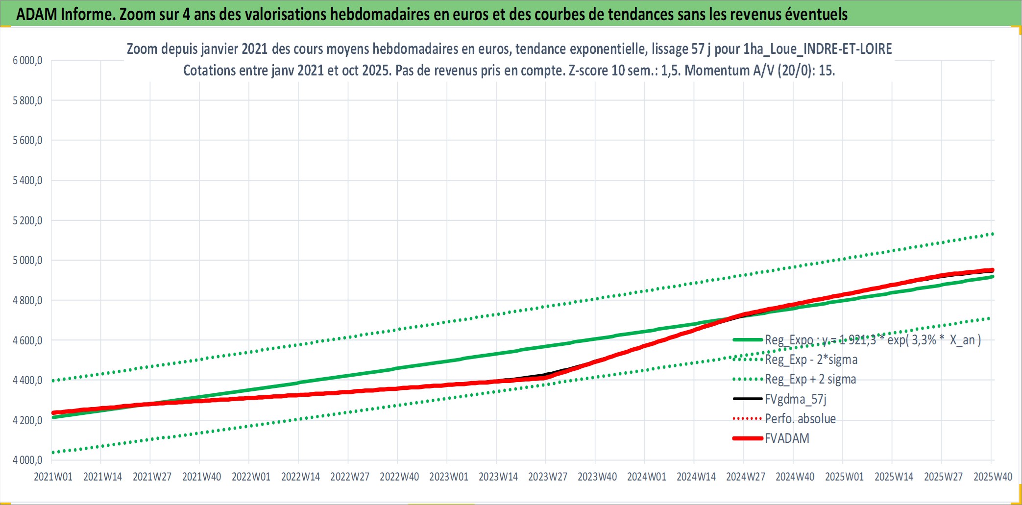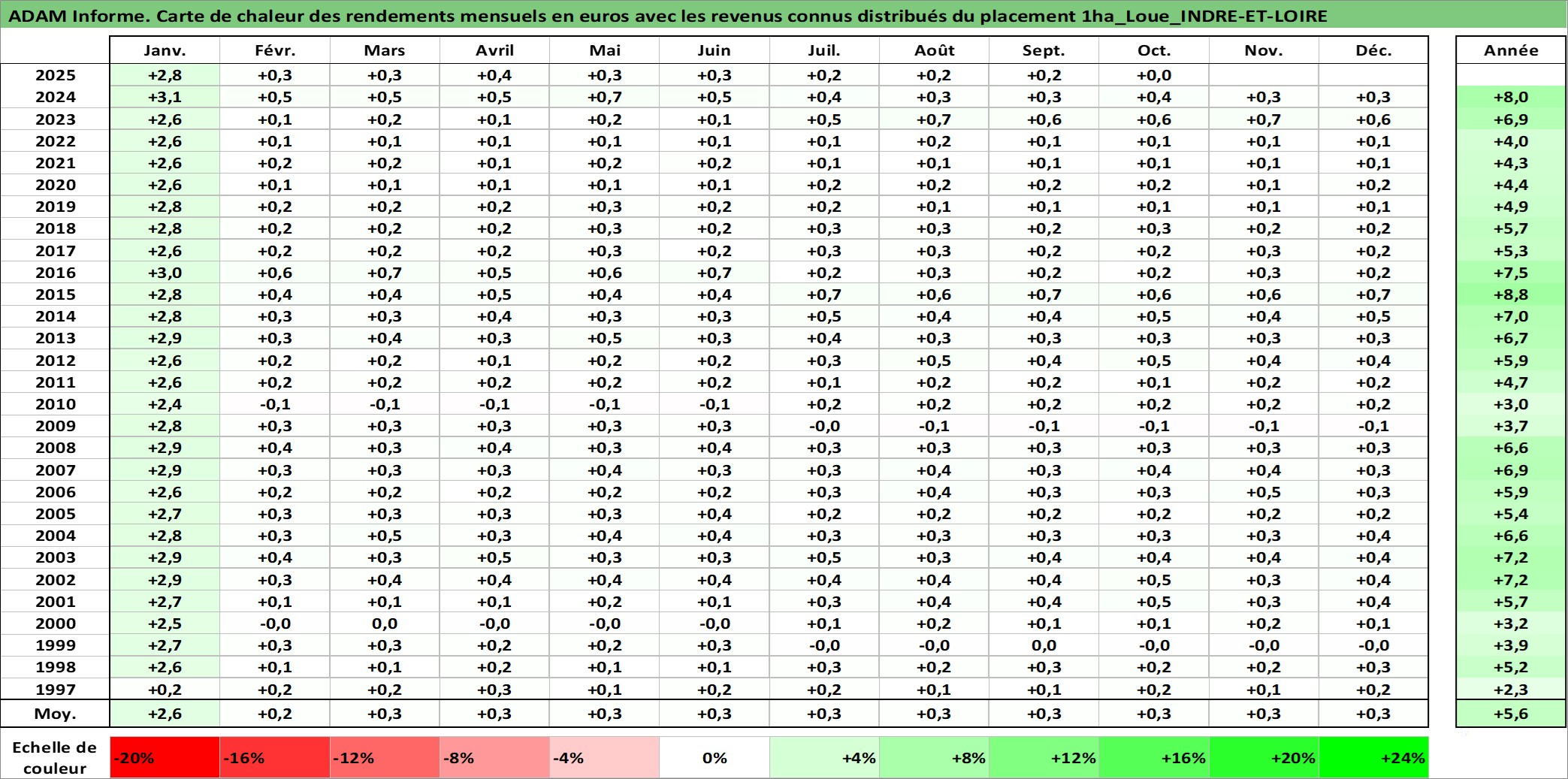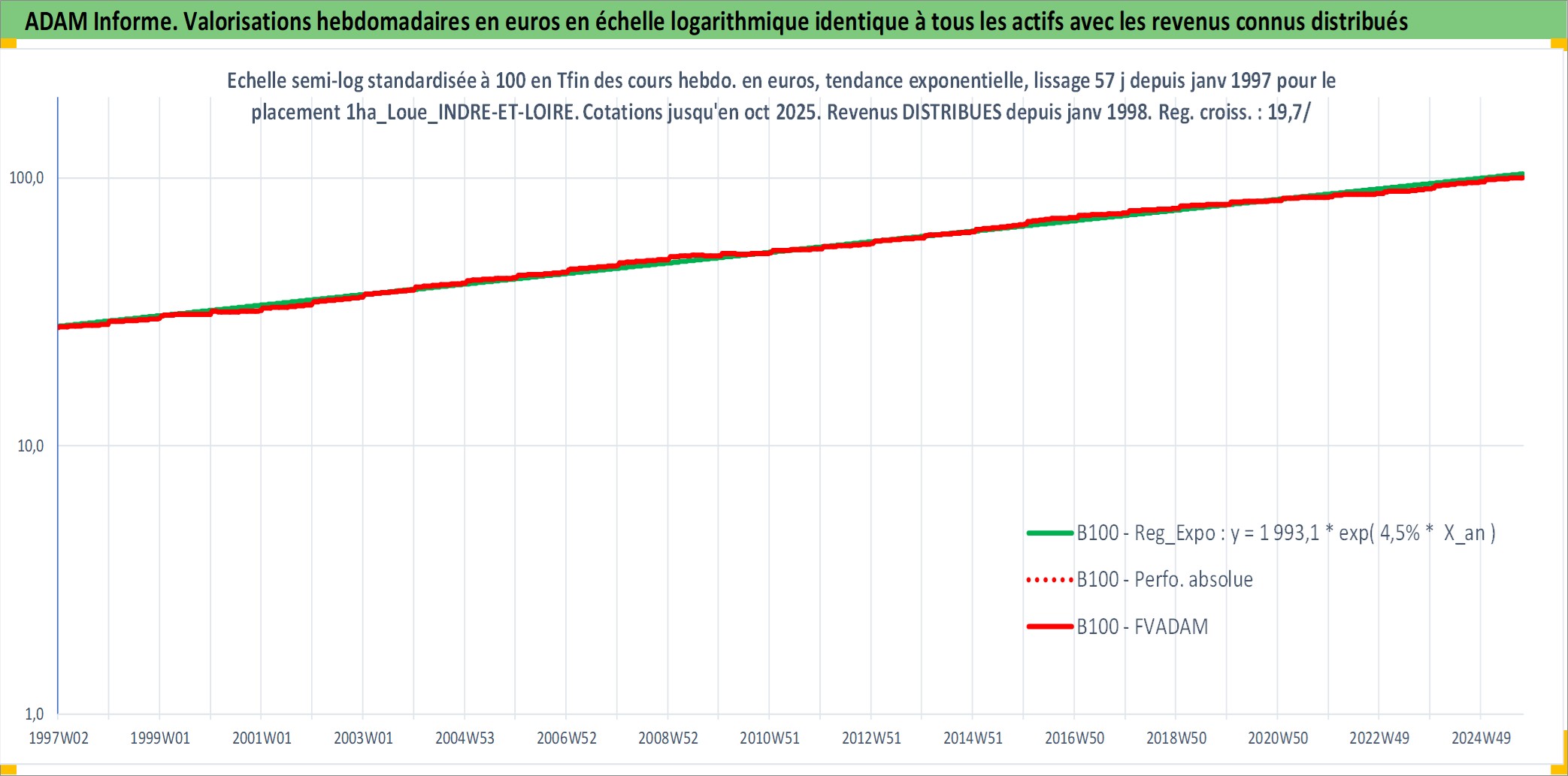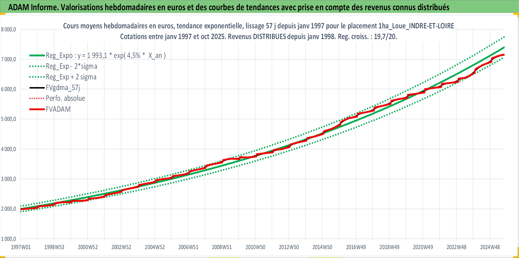 Site dédié aux investisseursPage dédiée sur site financeAnalyse des valorisations hebdomadaires de l'actif 1ha_Loue_INDRE-ET-LOIRE. Cet actif est cote en EUR. Les valorisations couvrent les semaines 1997W01 a 2025W40. Les fermages de ce bien foncier sont pris egaux a 2,5% annuels de la valeur venale du bien.