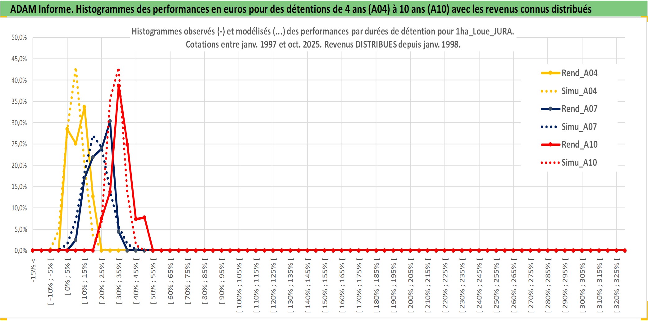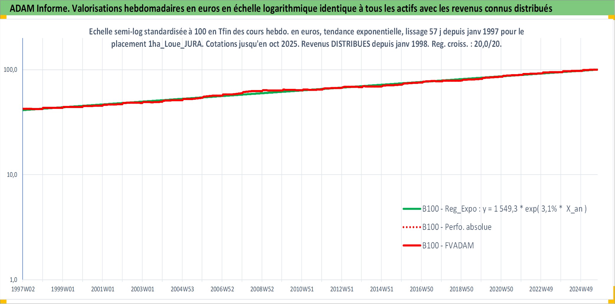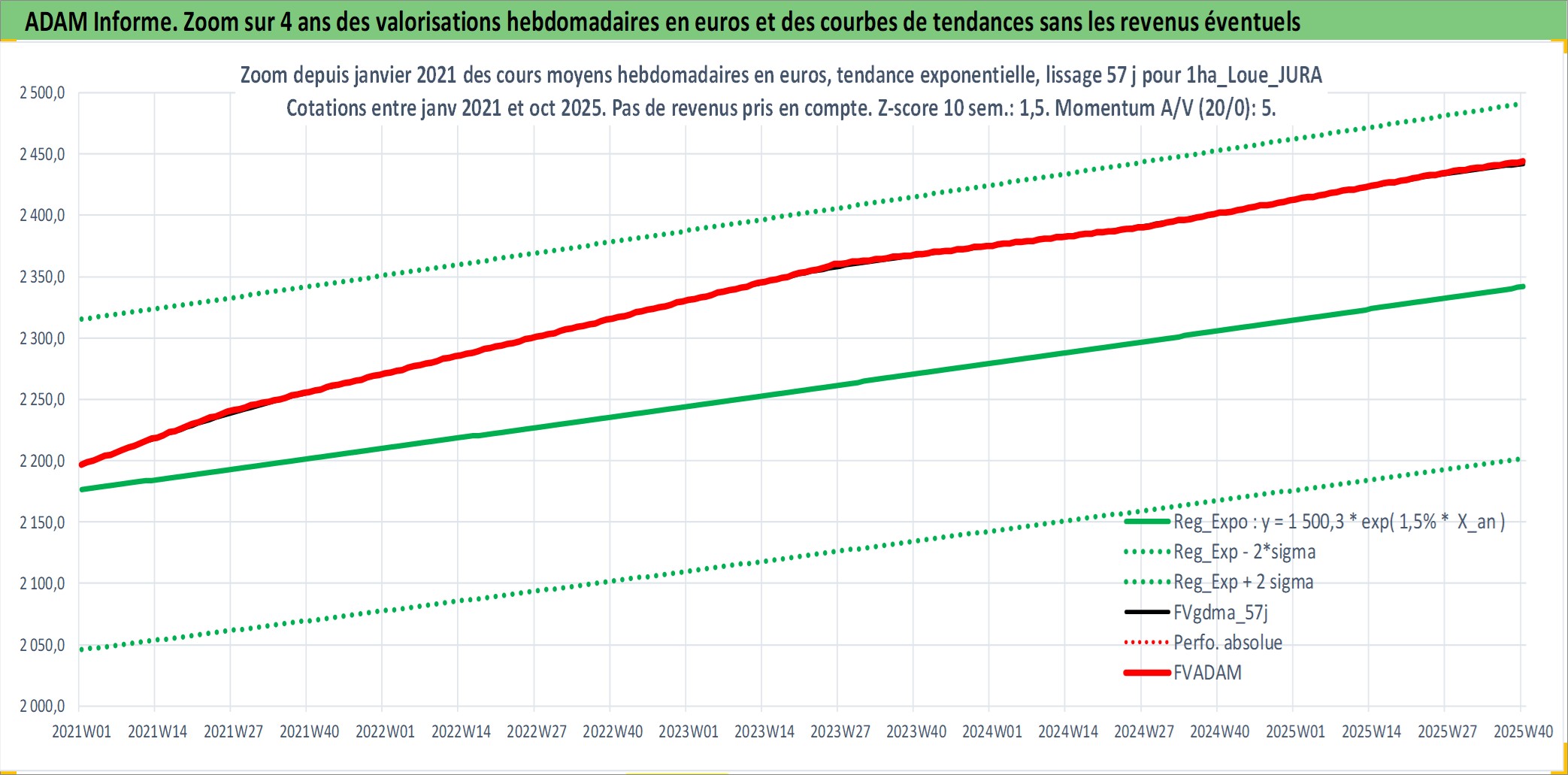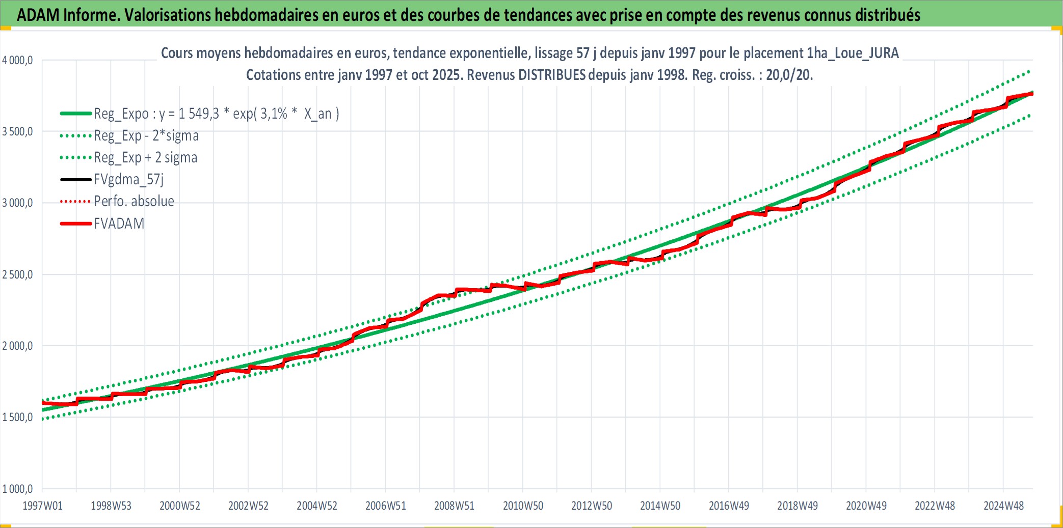 Site dédié aux investisseursPage dédiée sur site financeAnalyse des valorisations hebdomadaires de l'actif 1ha_Loue_JURA. Cet actif est cote en EUR. Les valorisations couvrent les semaines 1997W01 a 2025W40. Les fermages de ce bien foncier sont pris egaux a 2,5% annuels de la valeur venale du bien.