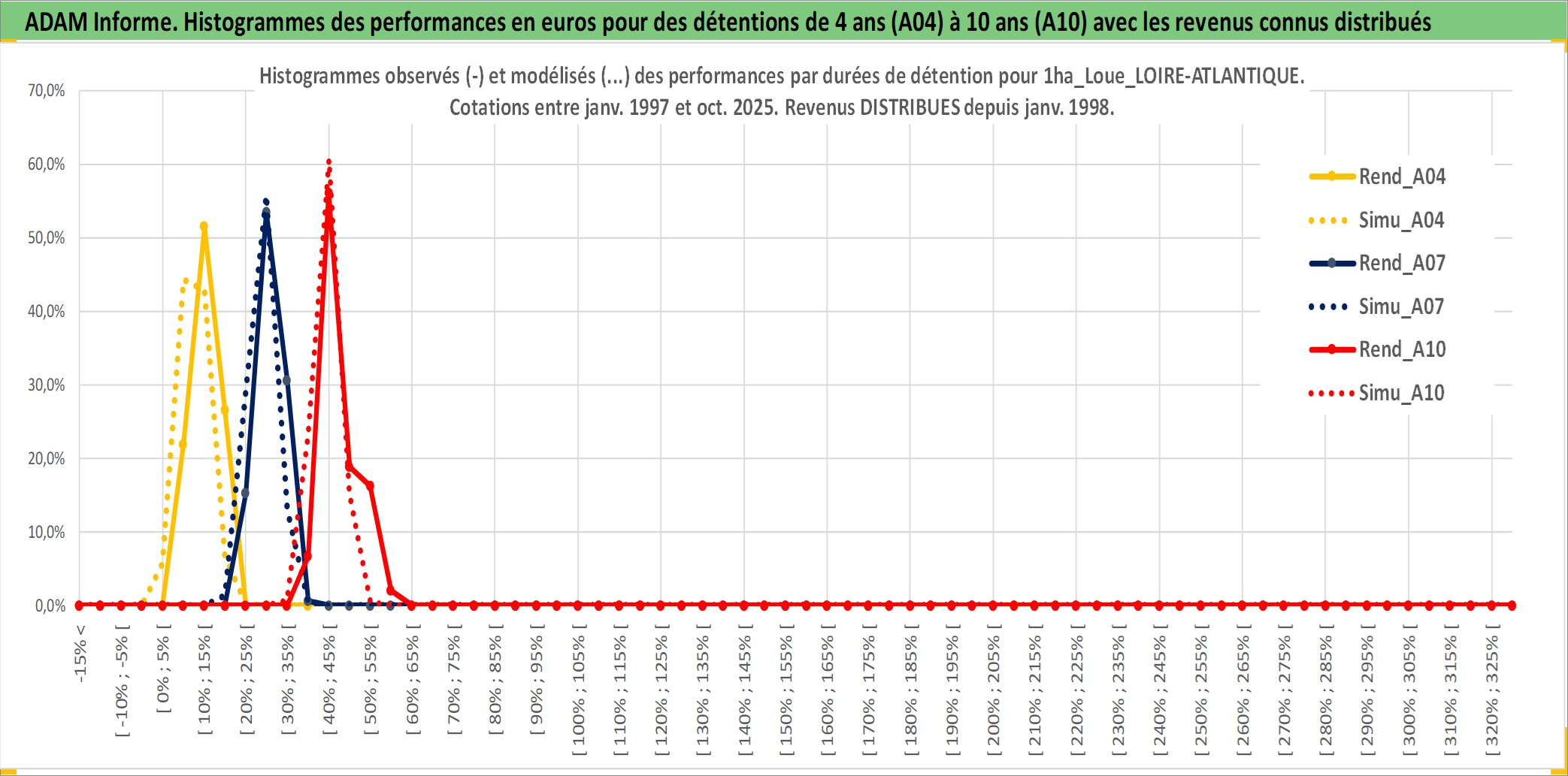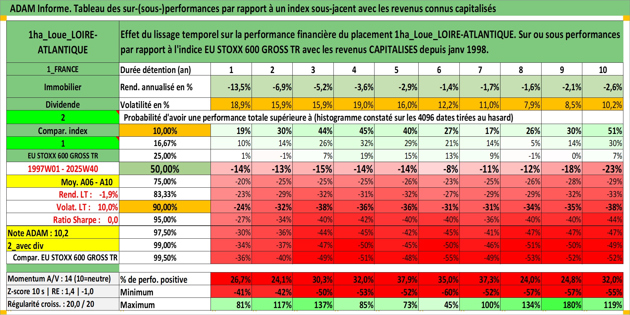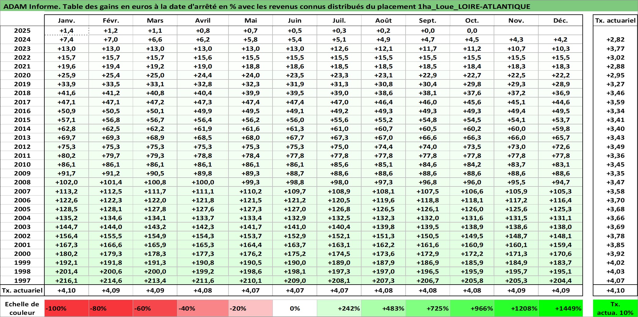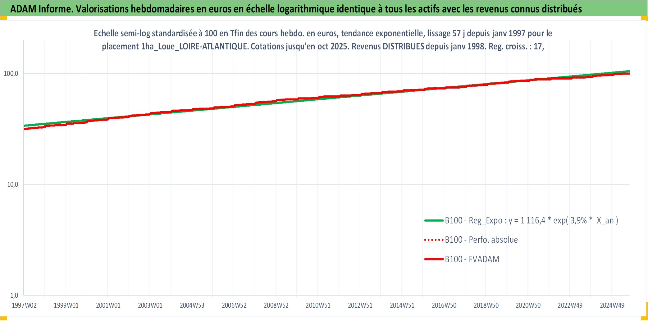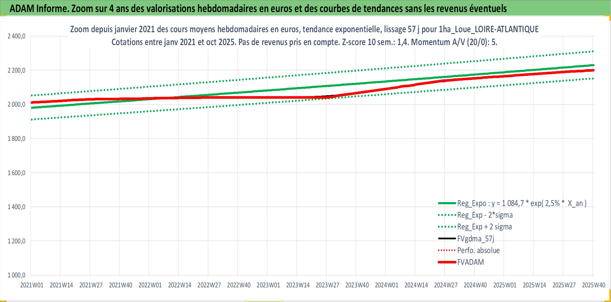 Site dédié aux investisseursPage dédiée sur site financeAnalyse des valorisations hebdomadaires de l'actif 1ha_Loue_LOIRE-ATLANTIQUE. Cet actif est cote en EUR. Les valorisations couvrent les semaines 1997W01 a 2025W40. Les fermages de ce bien foncier sont pris egaux a 2,5% annuels de la valeur venale du bien.