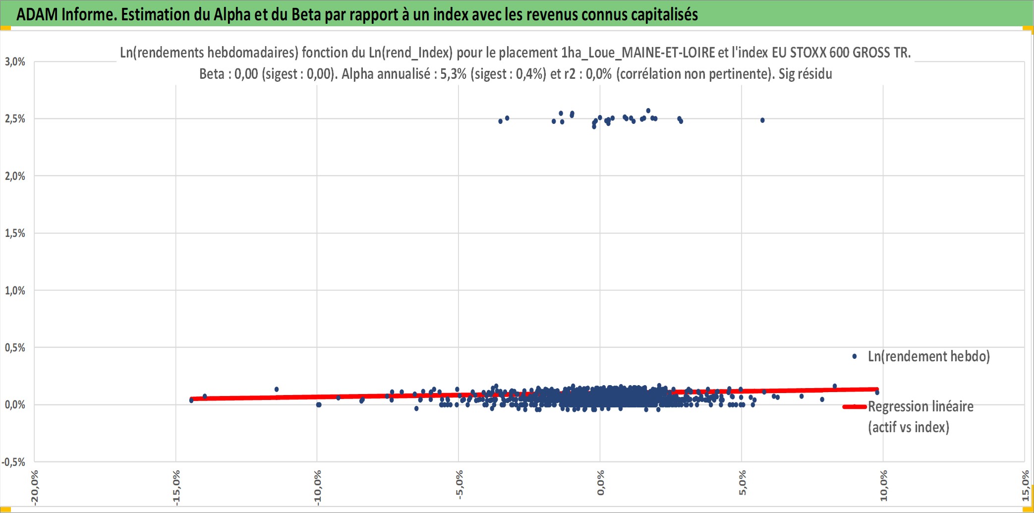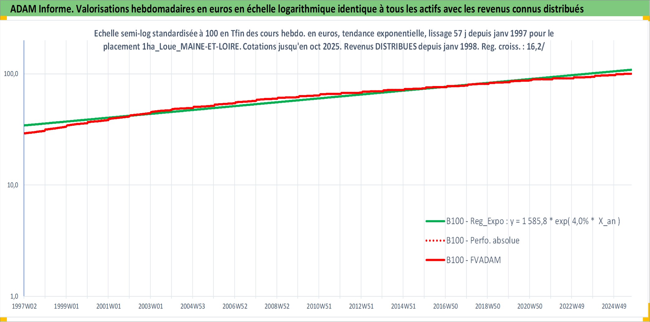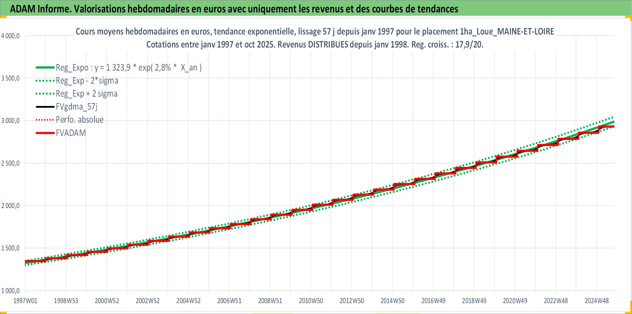 Site dédié aux investisseursPage dédiée sur site financeAnalyse des valorisations hebdomadaires de l'actif 1ha_Loue_MAINE-ET-LOIRE. Cet actif est cote en EUR. Les valorisations couvrent les semaines 1997W01 a 2025W40. Les fermages de ce bien foncier sont pris egaux a 2,5% annuels de la valeur venale du bien.