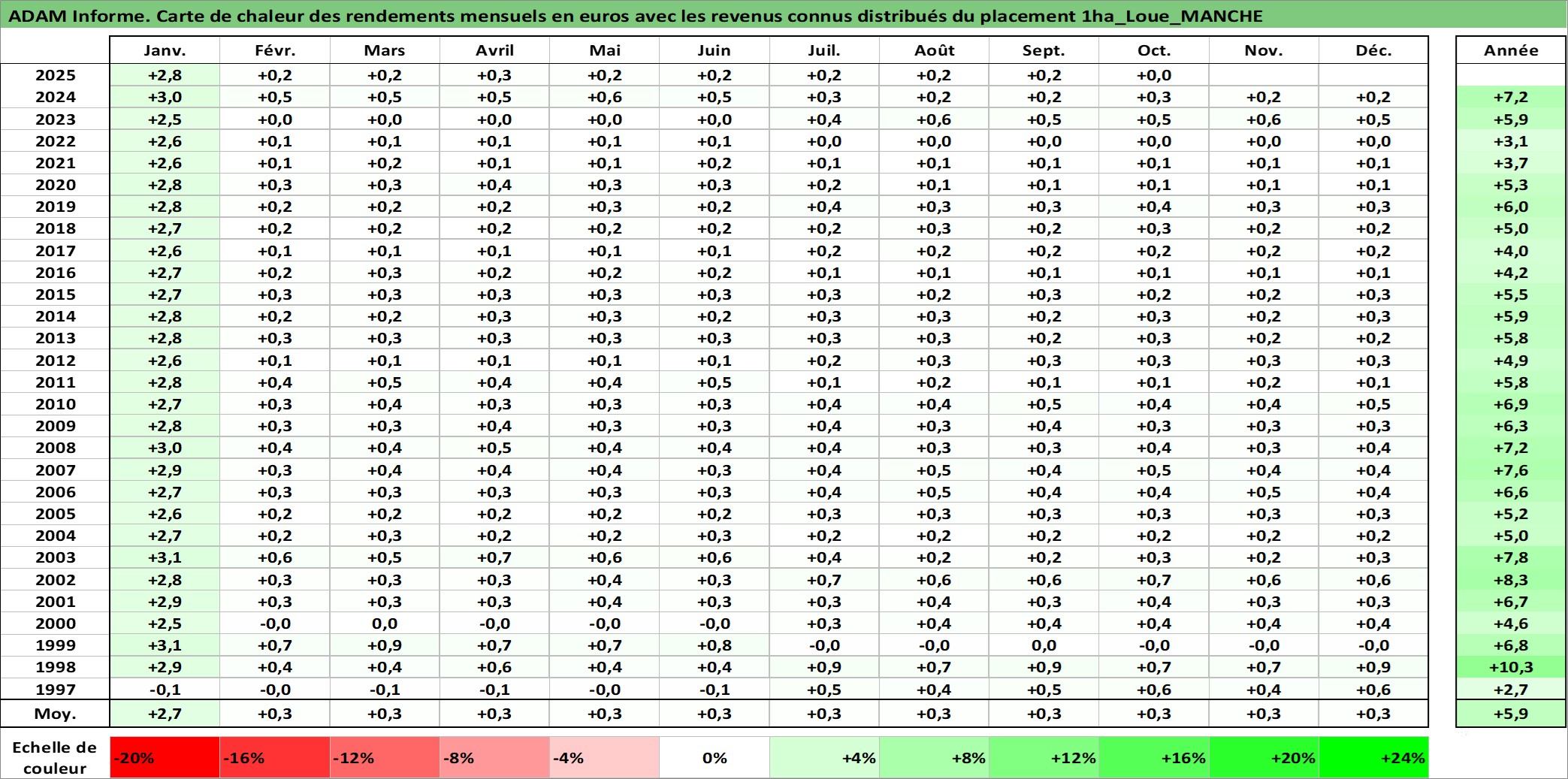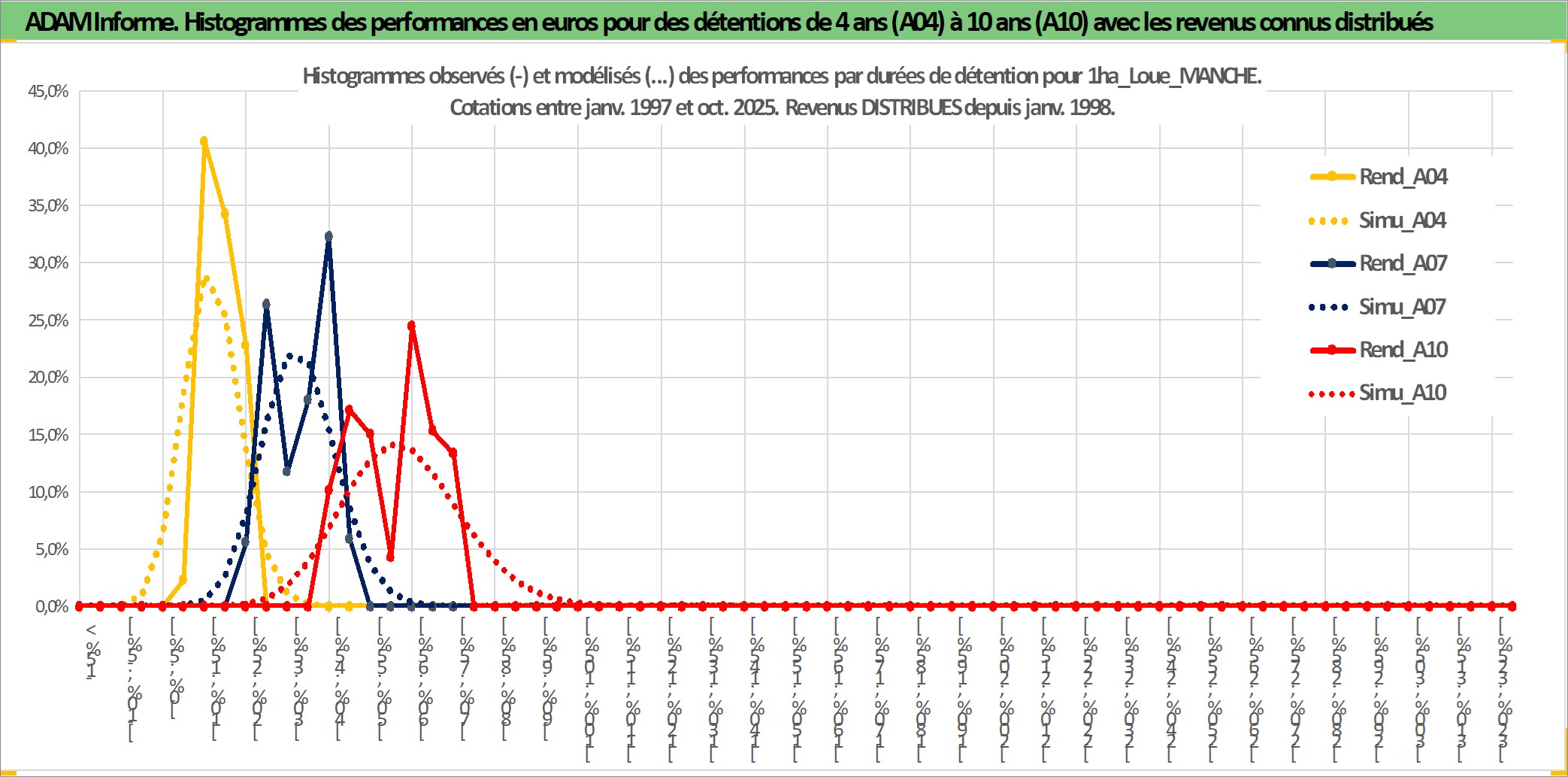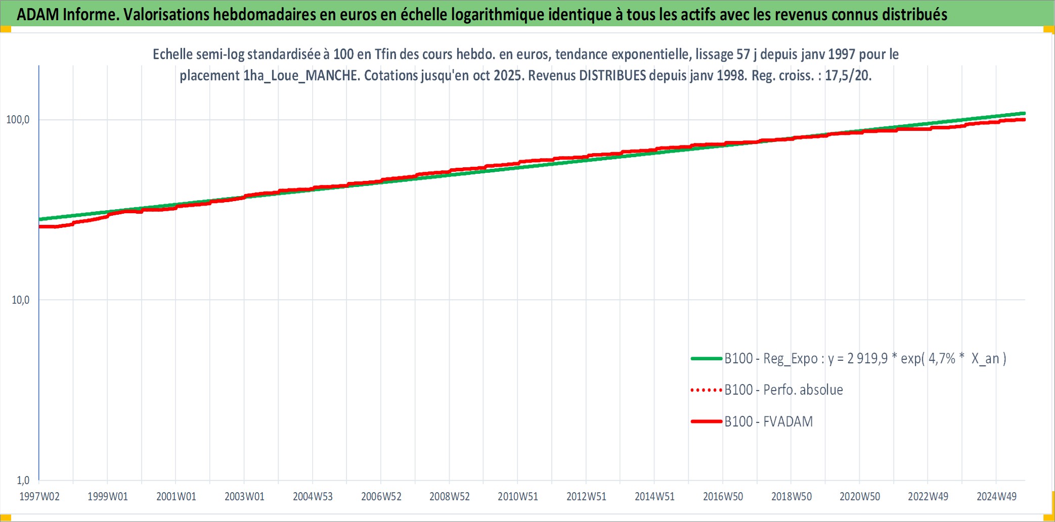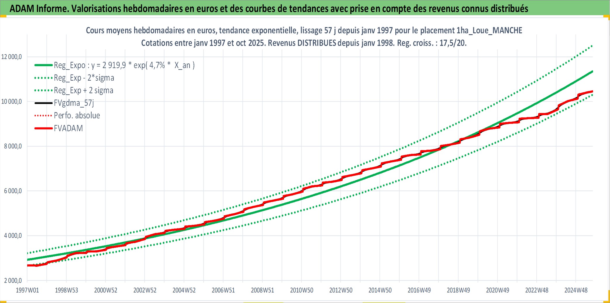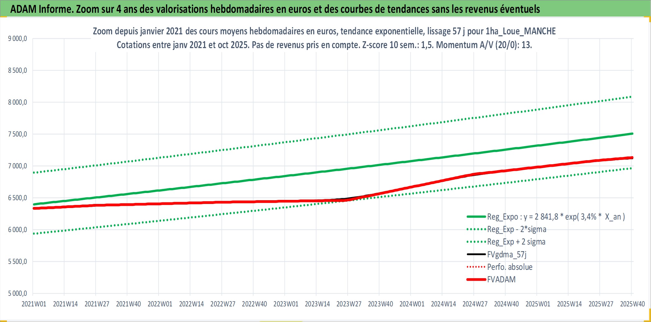 Site dédié aux investisseursPage dédiée sur site financeAnalyse des valorisations hebdomadaires de l'actif 1ha_Loue_MANCHE. Cet actif est cote en EUR. Les valorisations couvrent les semaines 1997W01 a 2025W40. Les fermages de ce bien foncier sont pris egaux a 2,5% annuels de la valeur venale du bien.