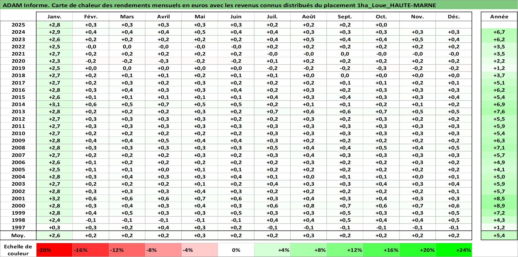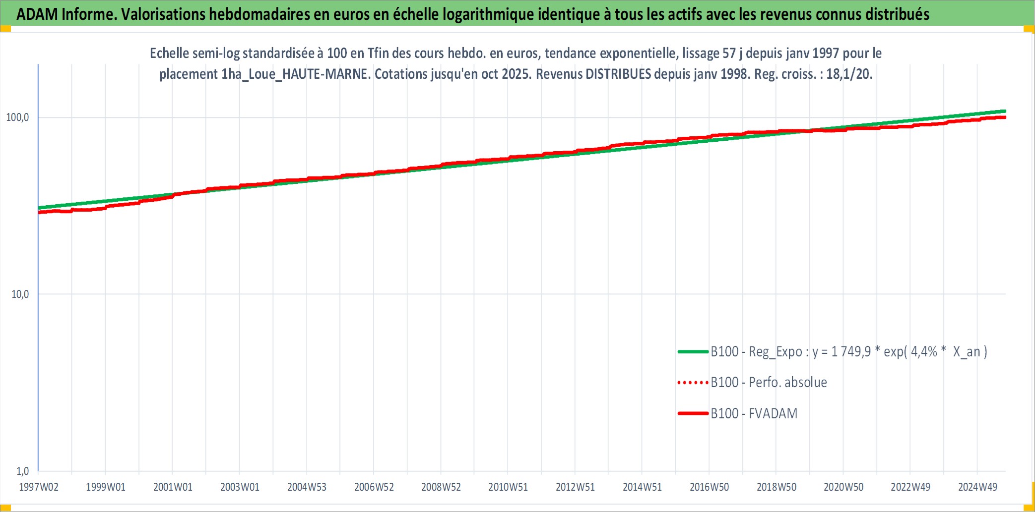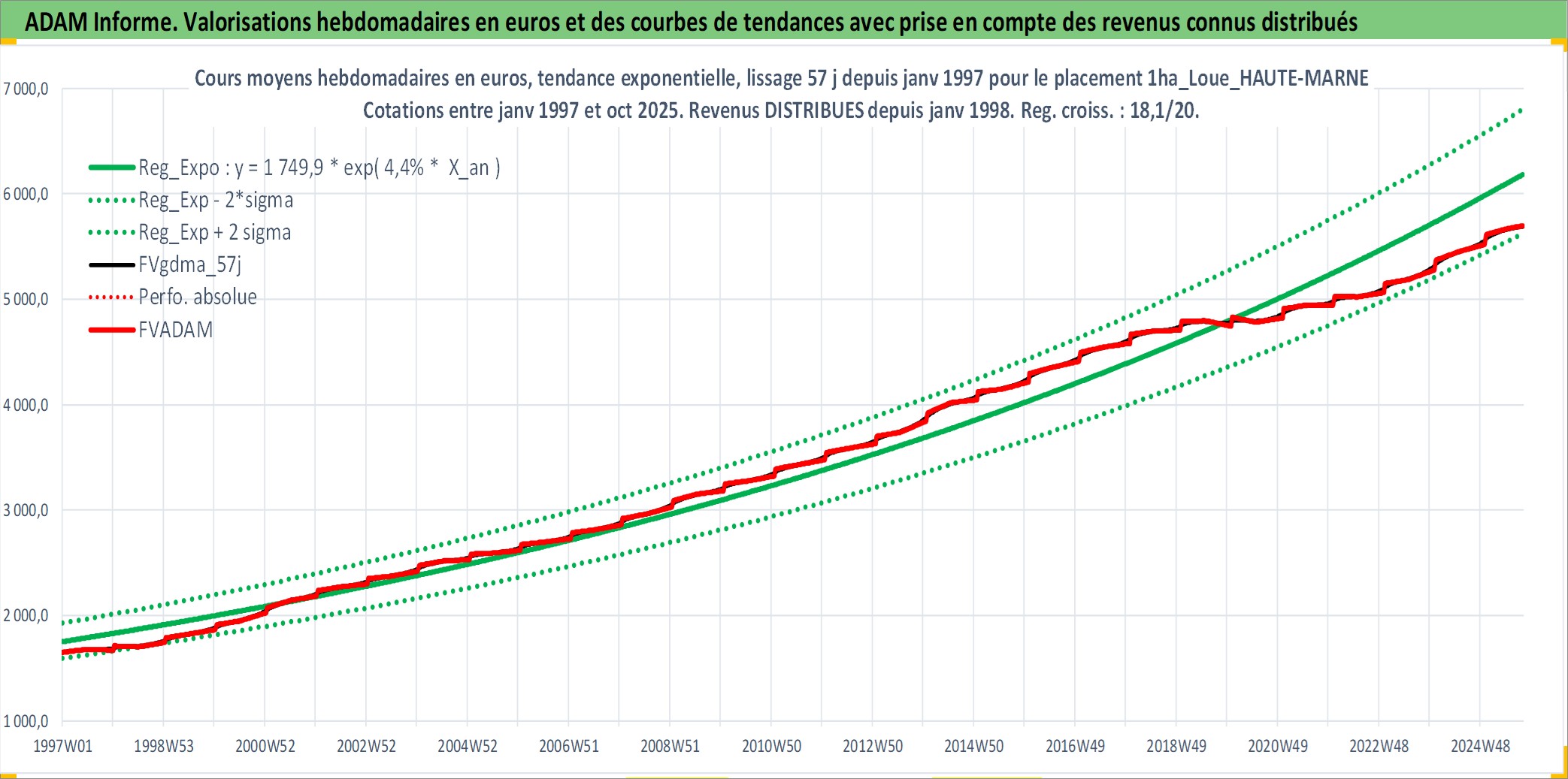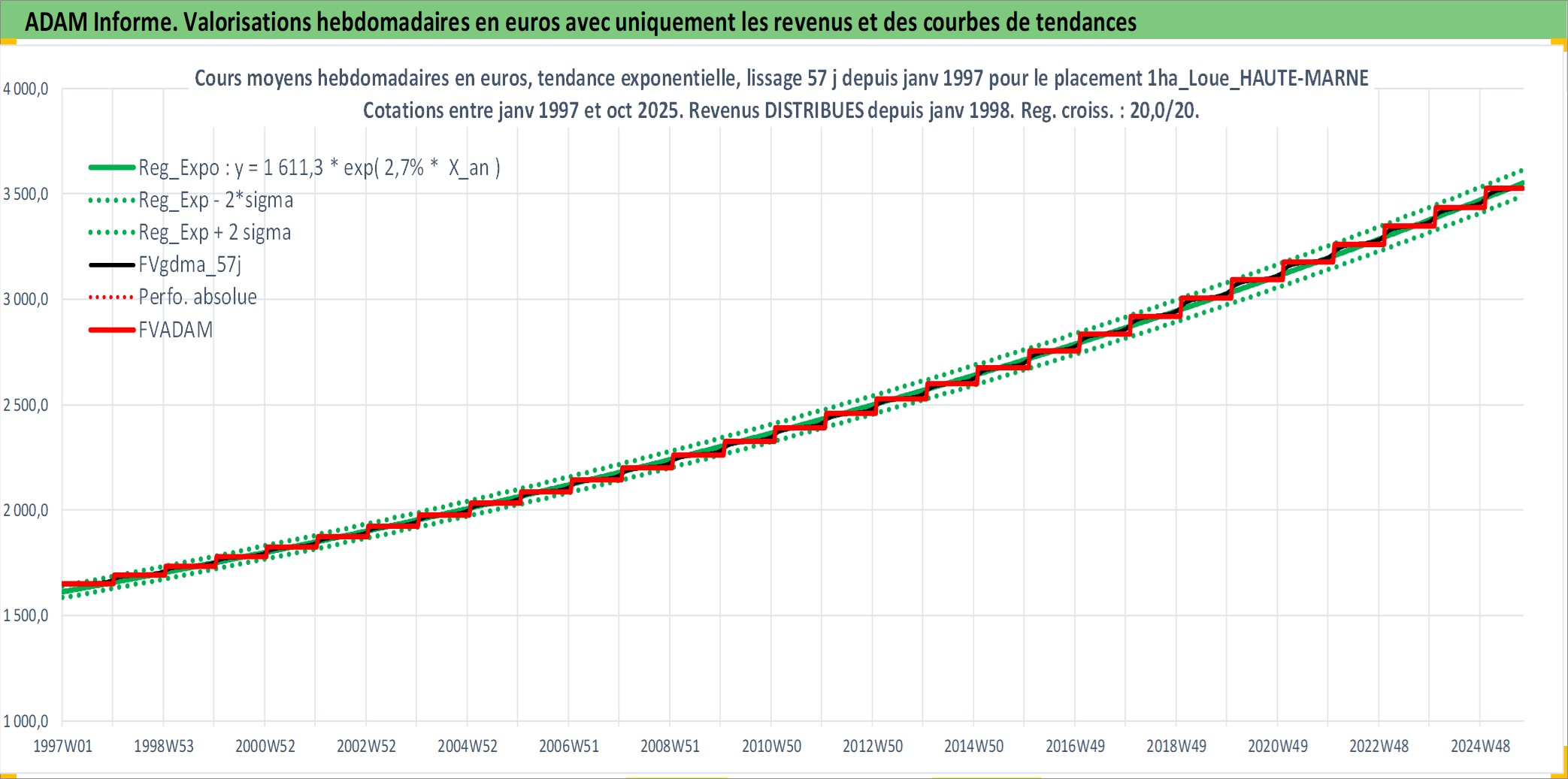 Site dédié aux investisseursPage dédiée sur site financeAnalyse des valorisations hebdomadaires de l'actif 1ha_Loue_HAUTE-MARNE. Cet actif est cote en EUR. Les valorisations couvrent les semaines 1997W01 a 2025W40. Les fermages de ce bien foncier sont pris egaux a 2,5% annuels de la valeur venale du bien.