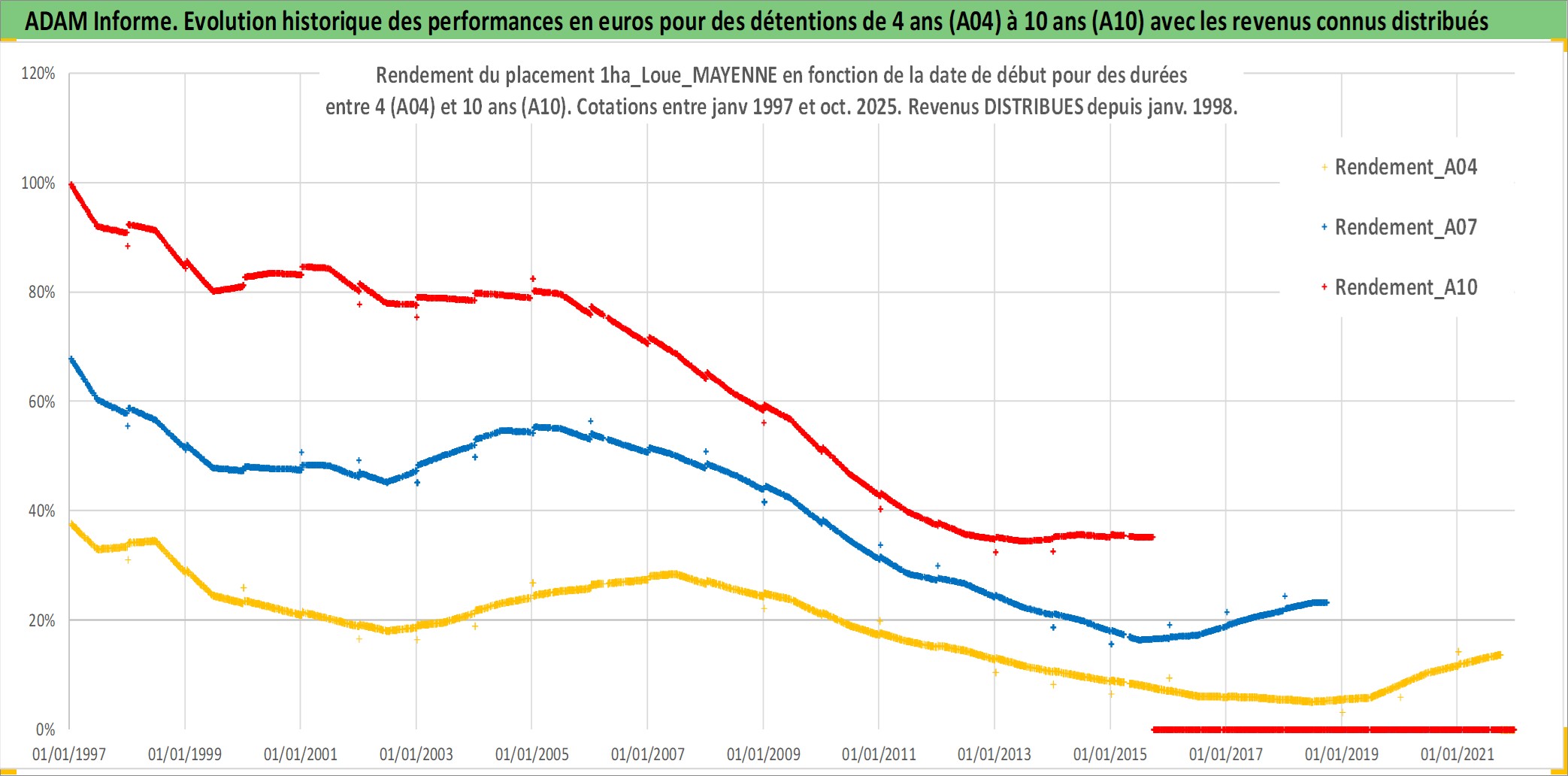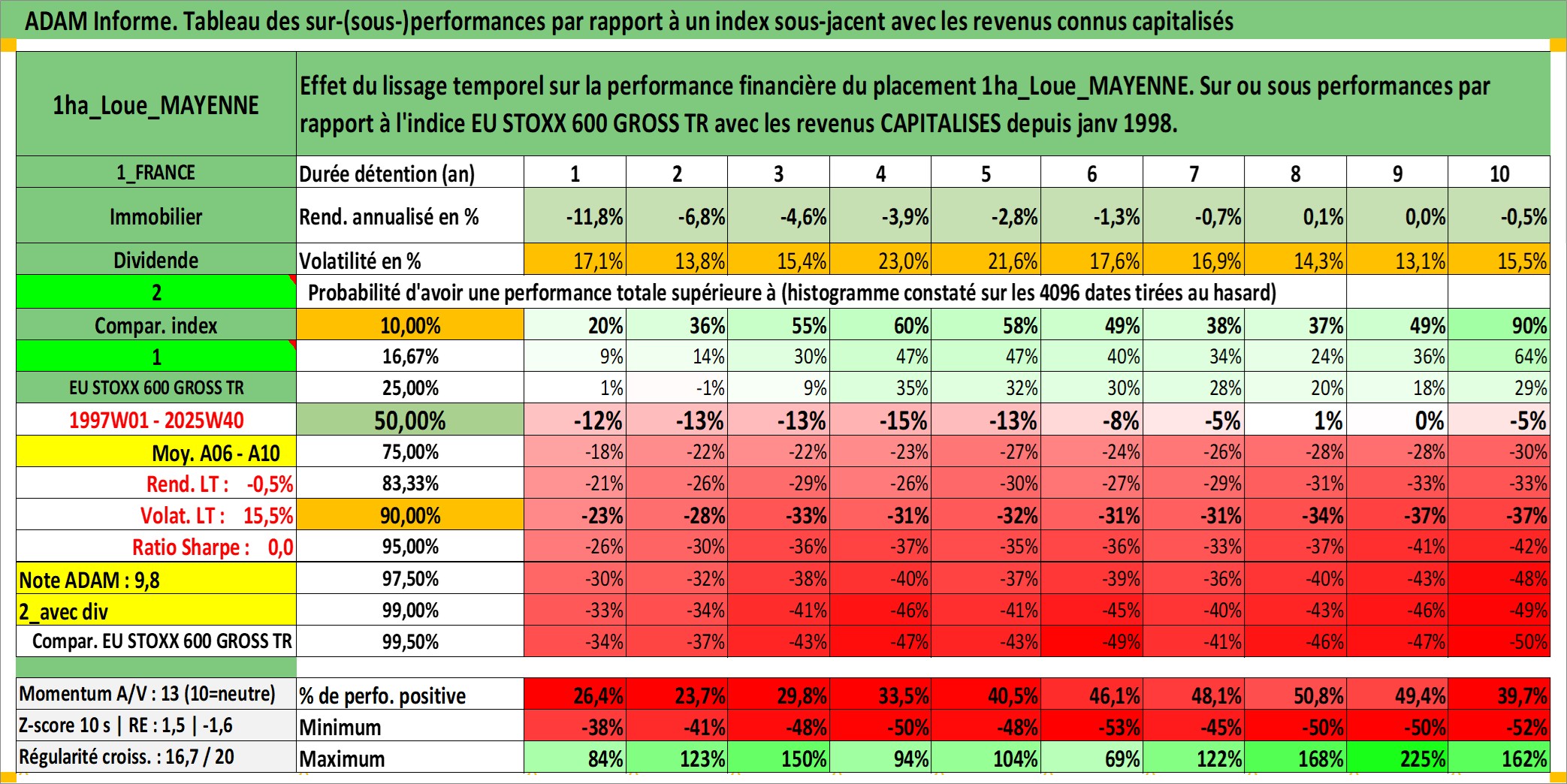Site dédié aux investisseursPage dédiée sur site financeAnalyse des valorisations hebdomadaires de l'actif 1ha_Loue_MAYENNE. Cet actif est cote en EUR. Les valorisations couvrent les semaines 1997W01 a 2025W40. Les fermages de ce bien foncier sont pris egaux a 2,5% annuels de la valeur venale du bien.