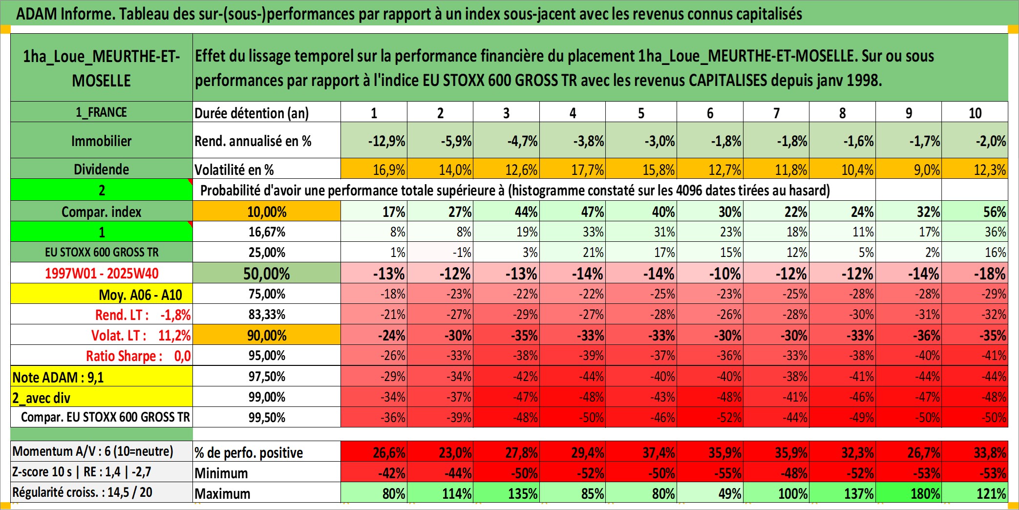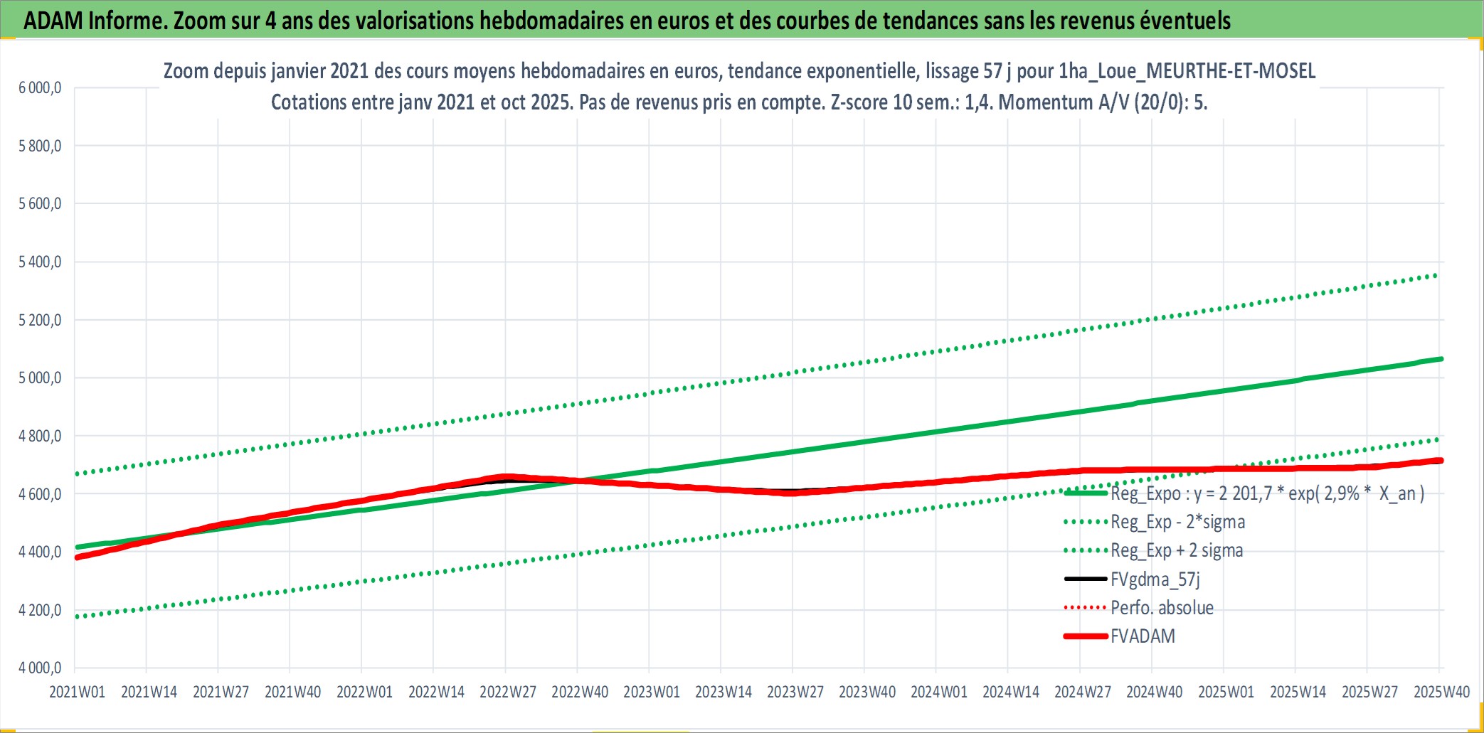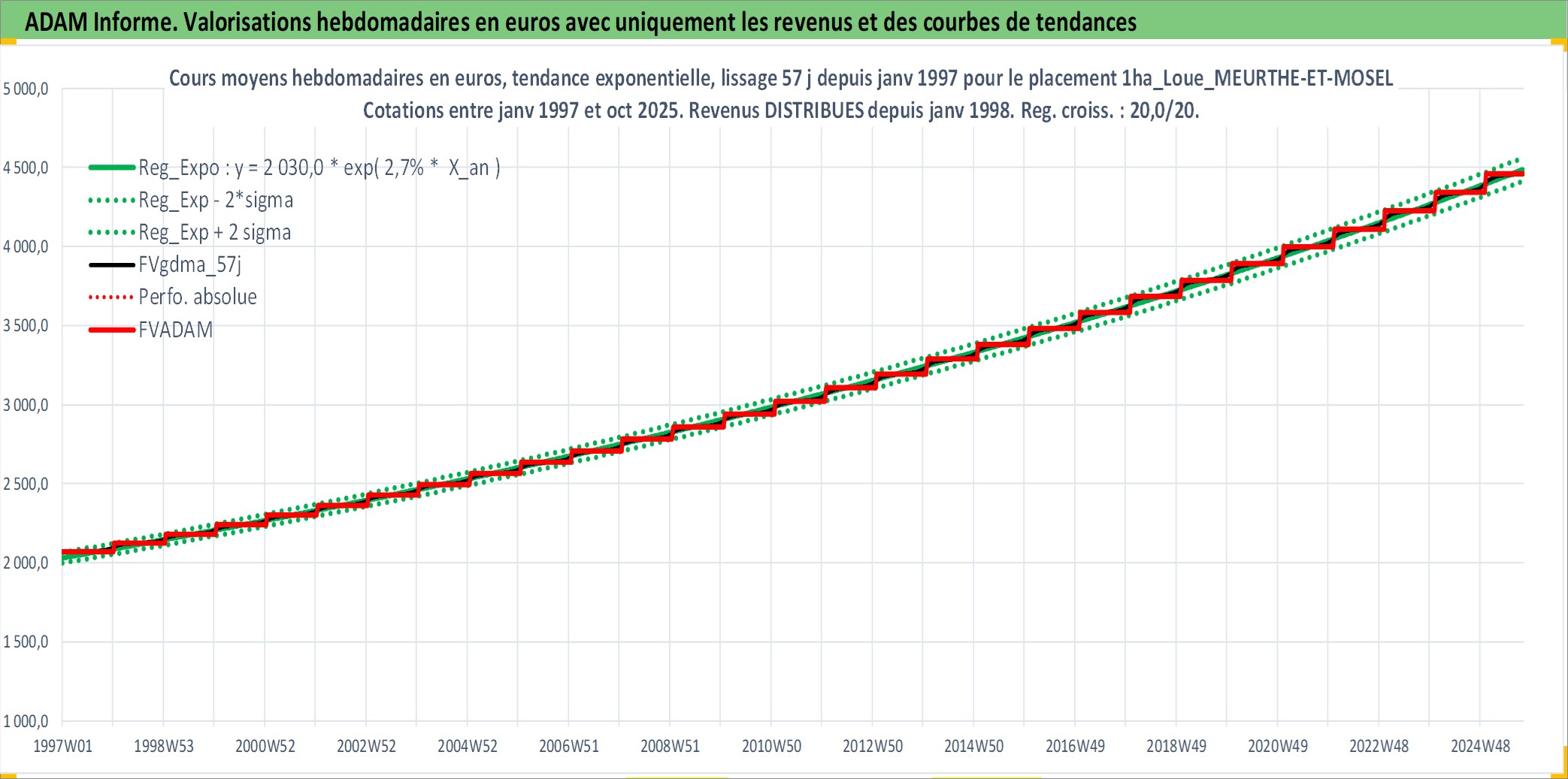 Site dédié aux investisseursPage dédiée sur site financeAnalyse des valorisations hebdomadaires de l'actif 1ha_Loue_MEURTHE-ET-MOSELLE. Cet actif est cote en EUR. Les valorisations couvrent les semaines 1997W01 a 2025W40. Les fermages de ce bien foncier sont pris egaux a 2,5% annuels de la valeur venale du bien.