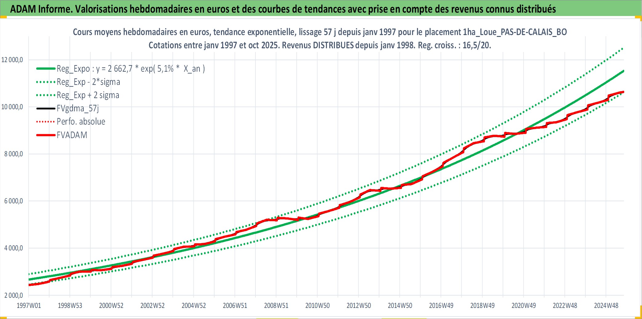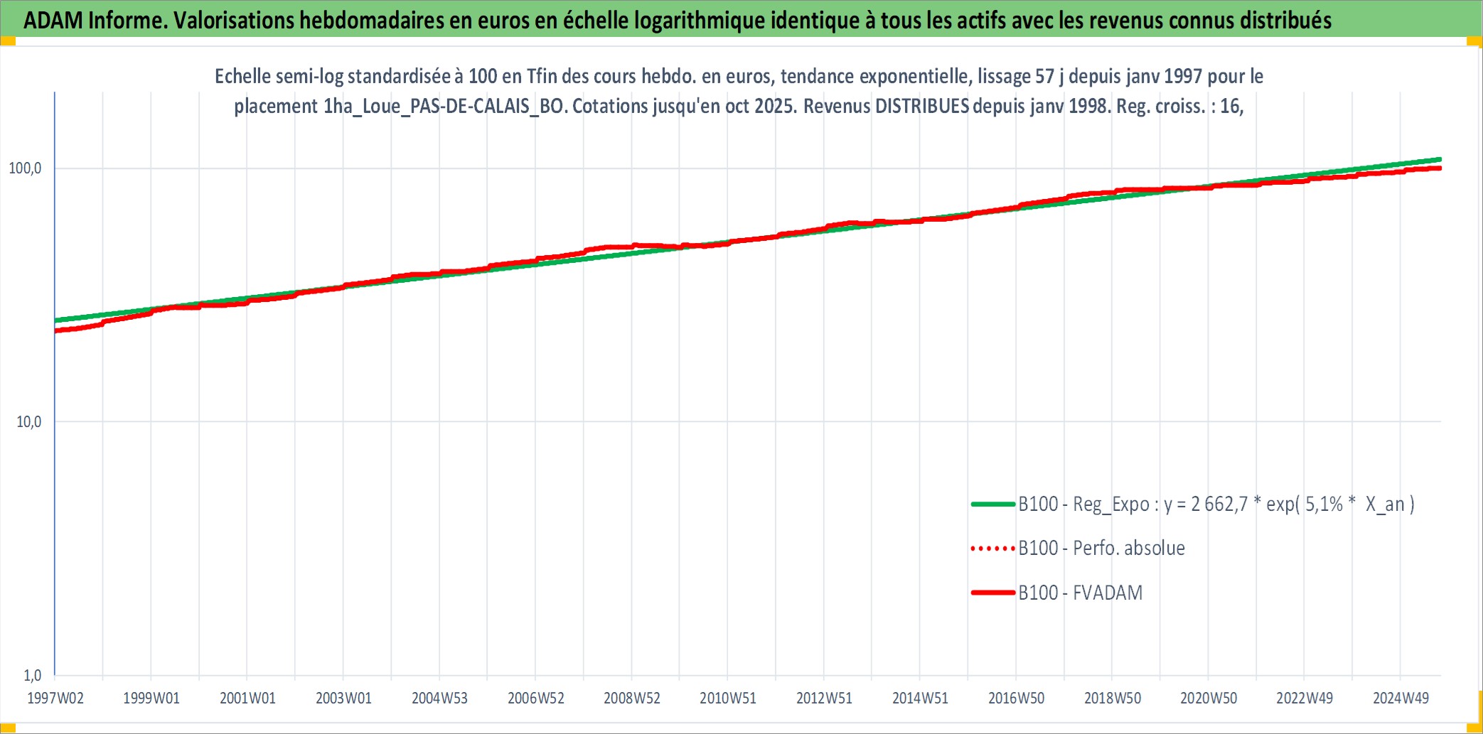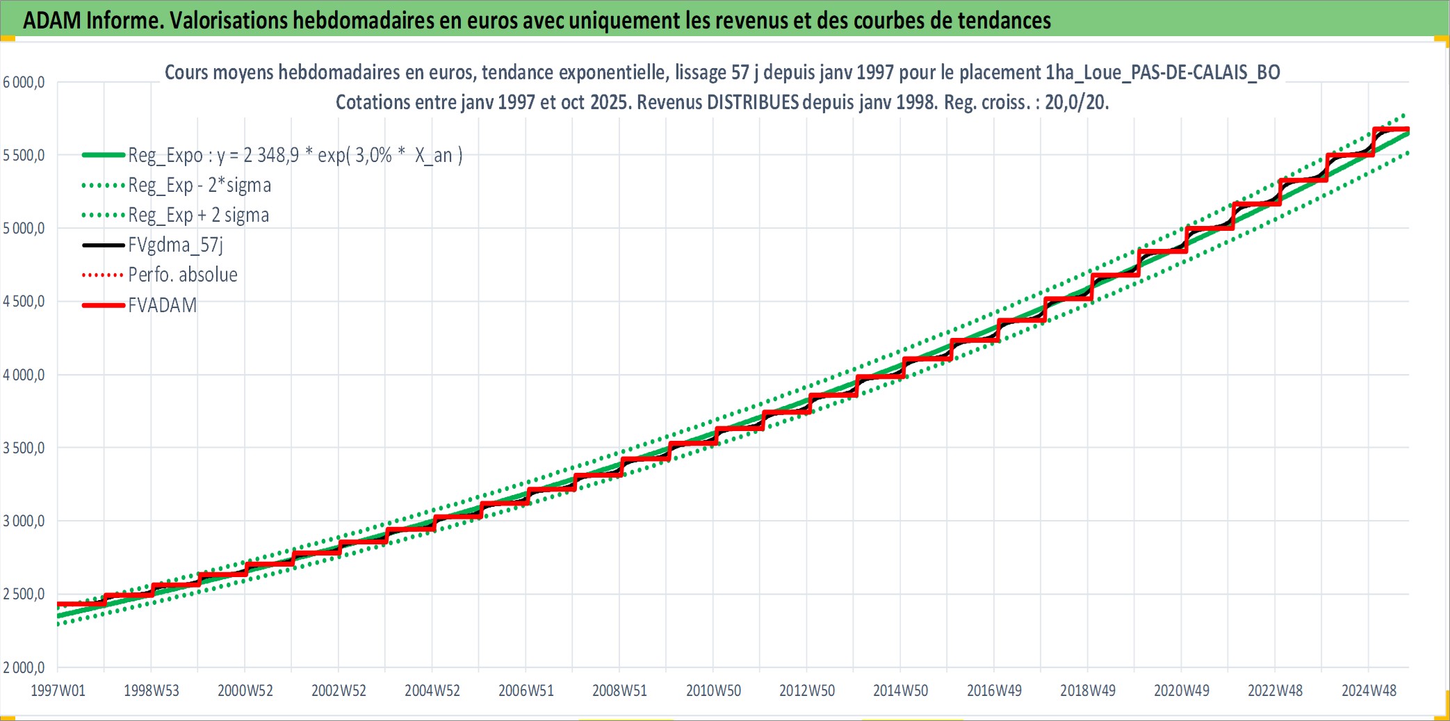 Site dédié aux investisseursPage dédiée sur site financeAnalyse des valorisations hebdomadaires de l'actif 1ha_Loue_PAS-DE-CALAIS_BOULONNAIS. Cet actif est cote en EUR. Les valorisations couvrent les semaines 1997W01 a 2025W40. Les fermages de ce bien foncier sont pris egaux a 2,5% annuels de la valeur venale du bien.