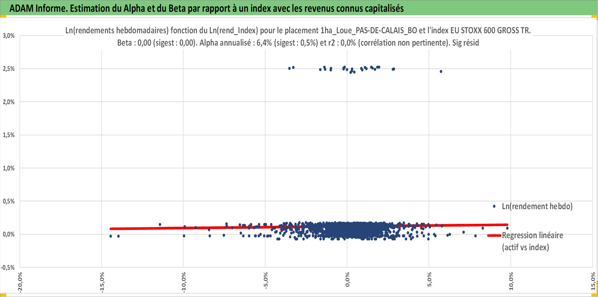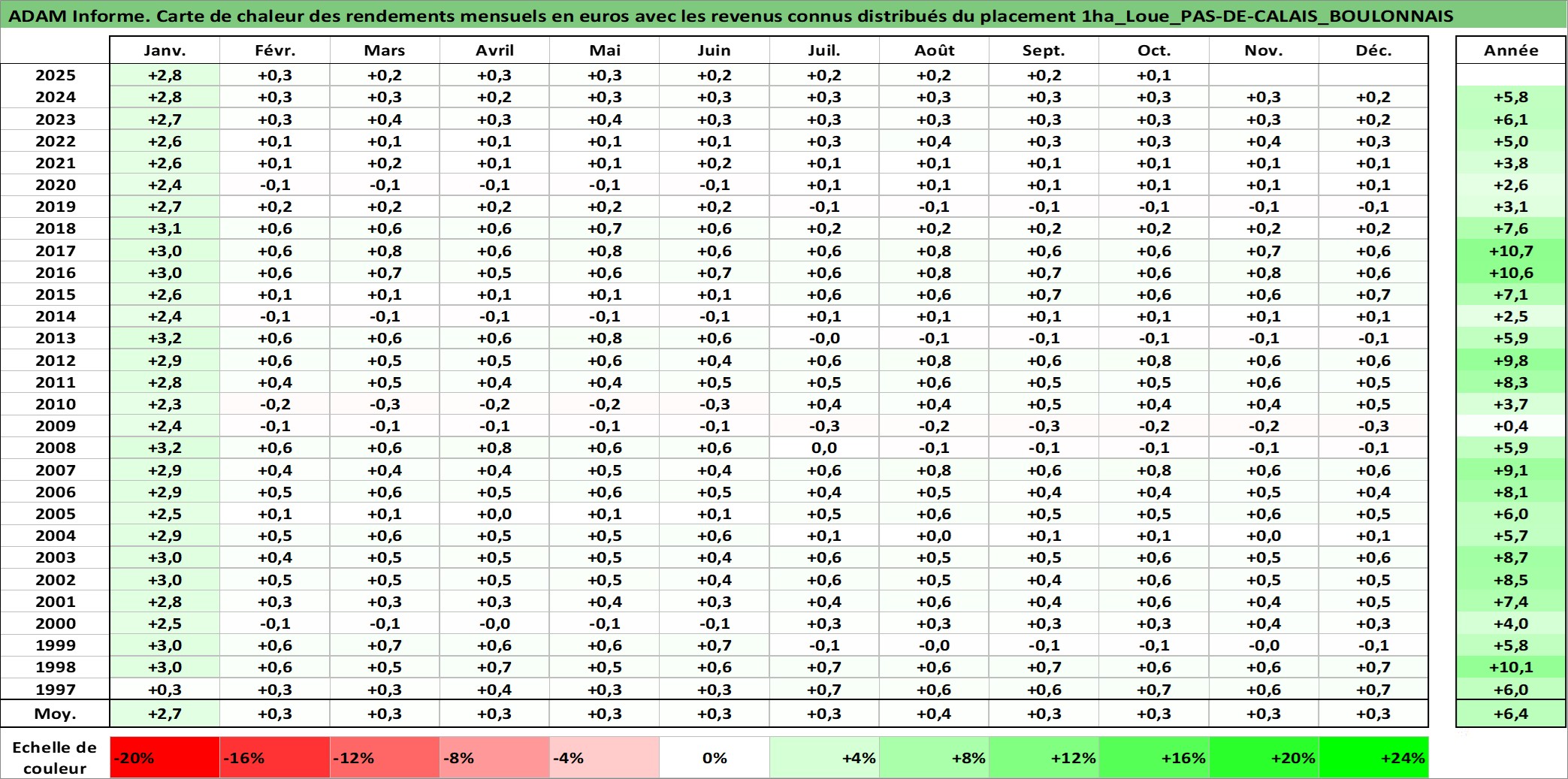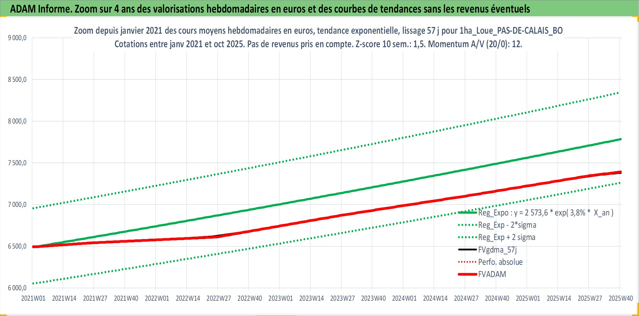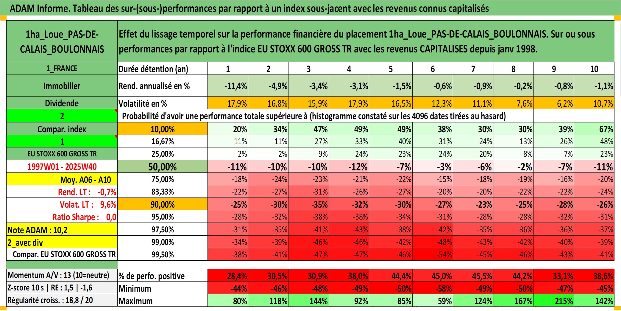 Site dédié aux investisseursPage dédiée sur site financeAnalyse des valorisations hebdomadaires de l'actif 1ha_Loue_PAS-DE-CALAIS_BOULONNAIS. Cet actif est cote en EUR. Les valorisations couvrent les semaines 1997W01 a 2025W40. Les fermages de ce bien foncier sont pris egaux a 2,5% annuels de la valeur venale du bien.