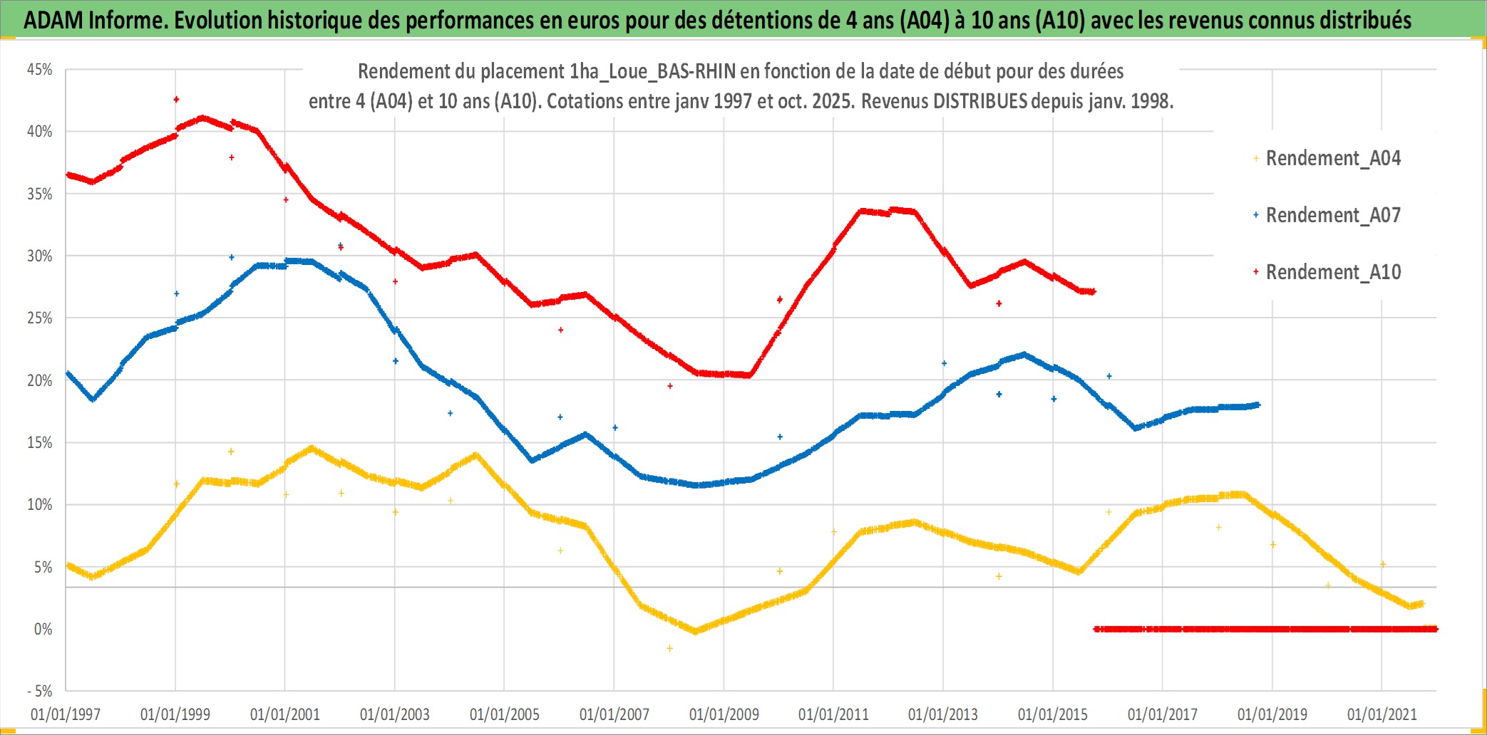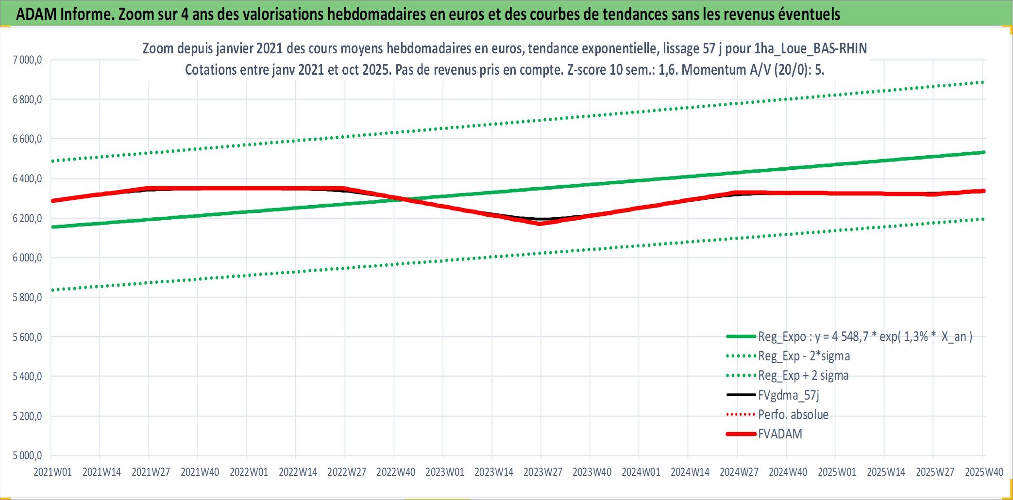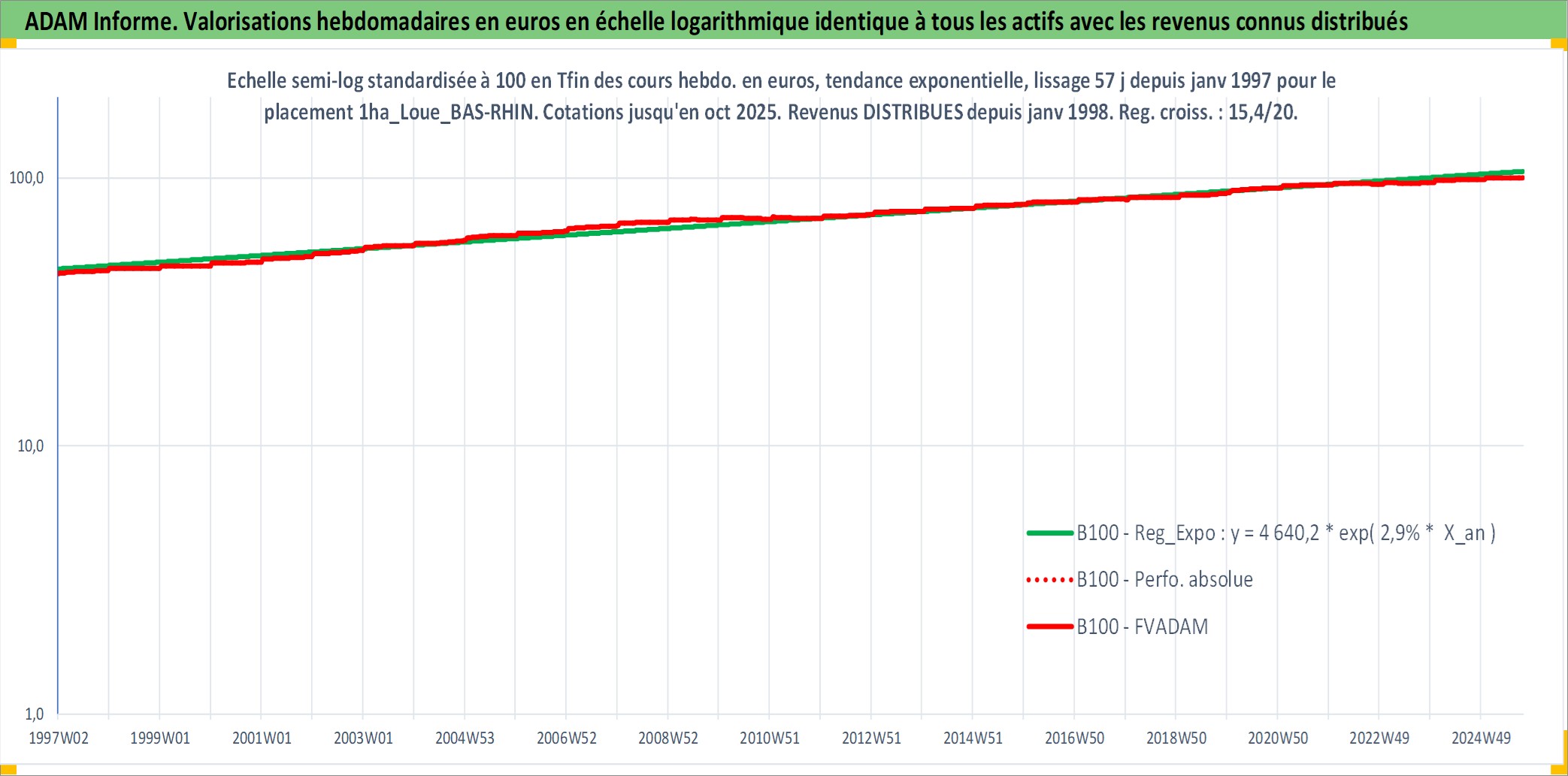 Site dédié aux investisseursPage dédiée sur site financeAnalyse des valorisations hebdomadaires de l'actif 1ha_Loue_BAS-RHIN. Cet actif est cote en EUR. Les valorisations couvrent les semaines 1997W01 a 2025W40. Les fermages de ce bien foncier sont pris egaux a 2,5% annuels de la valeur venale du bien.