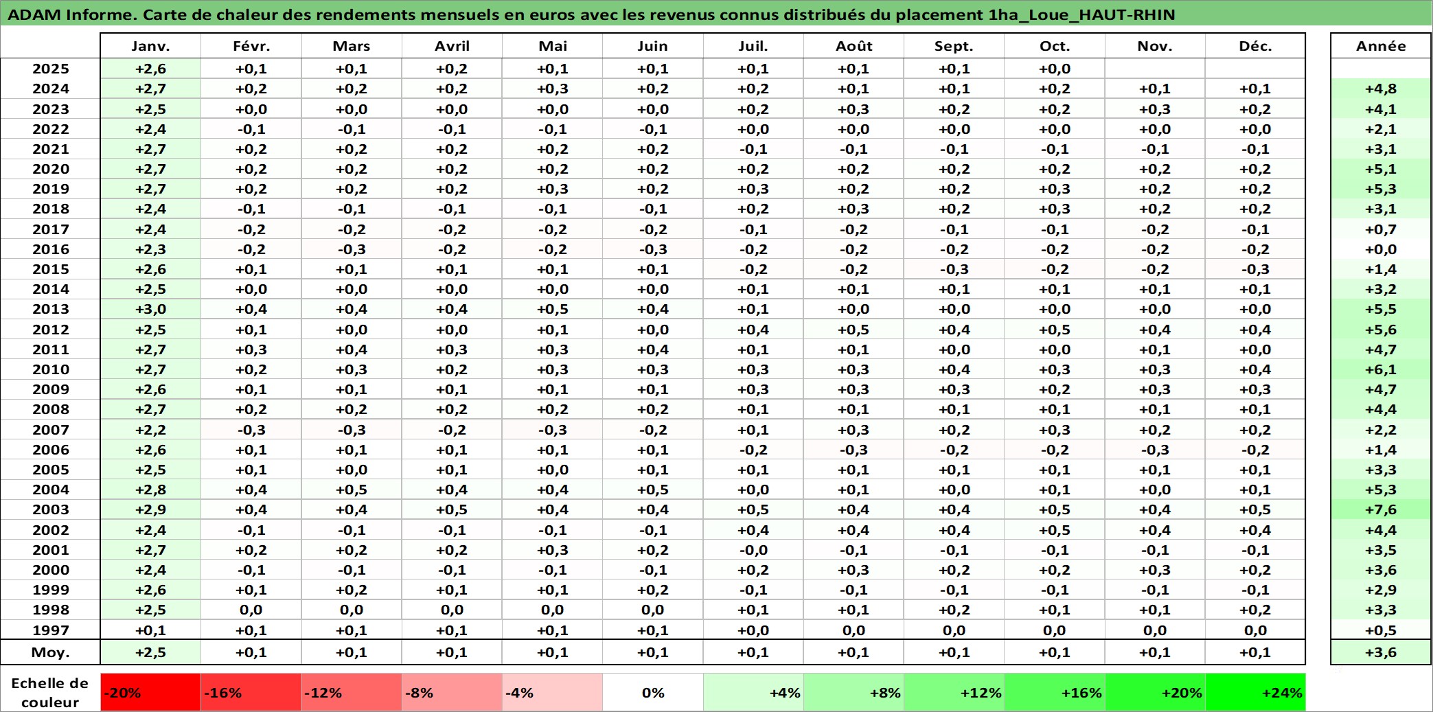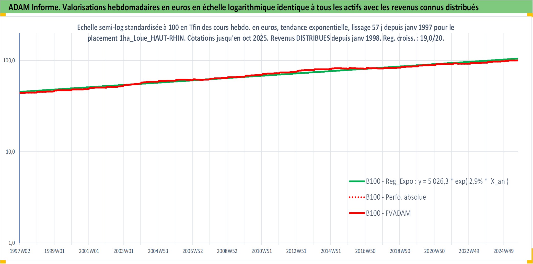 Site dédié aux investisseursPage dédiée sur site financeAnalyse des valorisations hebdomadaires de l'actif 1ha_Loue_HAUT-RHIN. Cet actif est cote en EUR. Les valorisations couvrent les semaines 1997W01 a 2025W40. Les fermages de ce bien foncier sont pris egaux a 2,5% annuels de la valeur venale du bien.