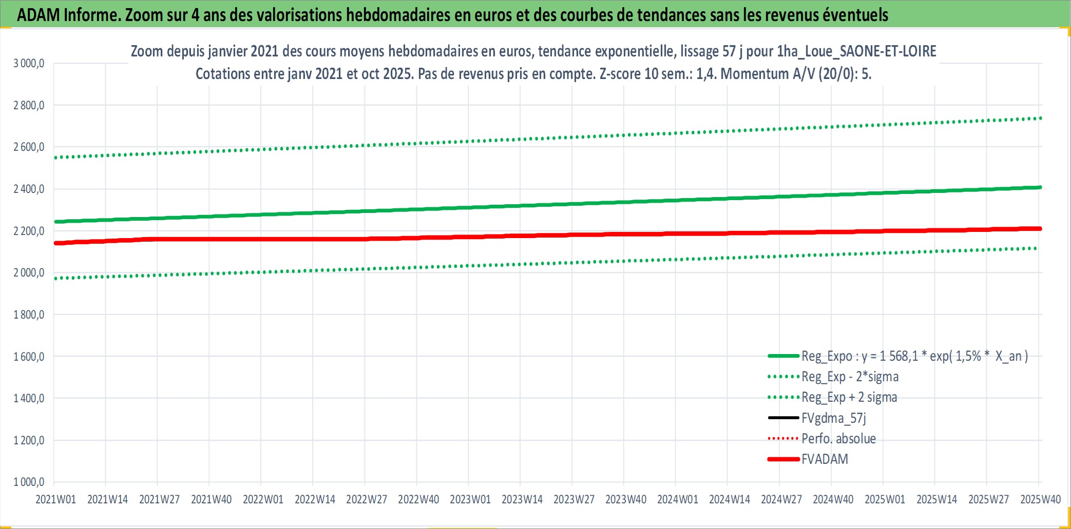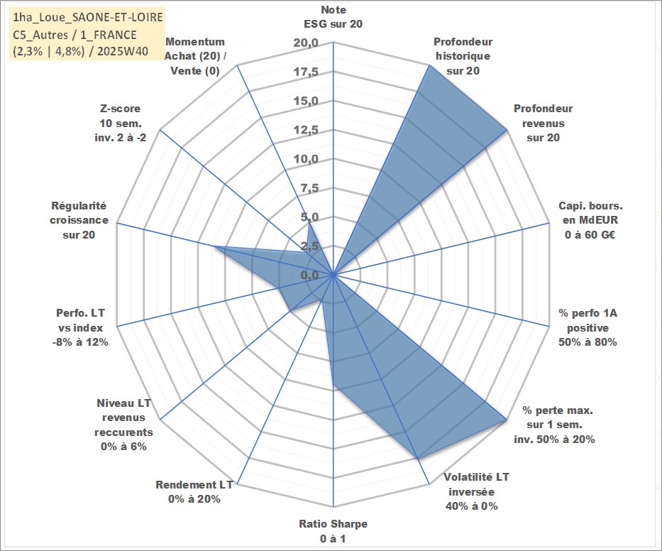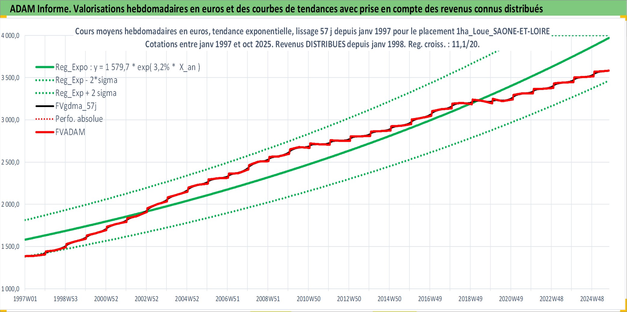 Site dédié aux investisseursPage dédiée sur site financeAnalyse des valorisations hebdomadaires de l'actif 1ha_Loue_SAONE-ET-LOIRE. Cet actif est cote en EUR. Les valorisations couvrent les semaines 1997W01 a 2025W40. Les fermages de ce bien foncier sont pris egaux a 2,5% annuels de la valeur venale du bien.