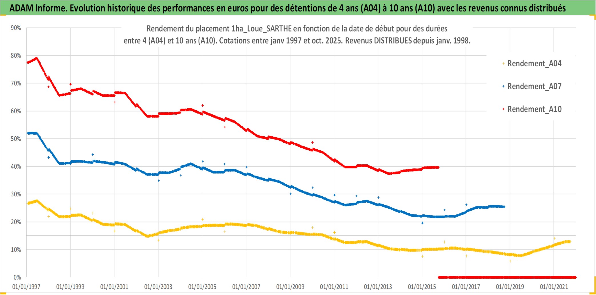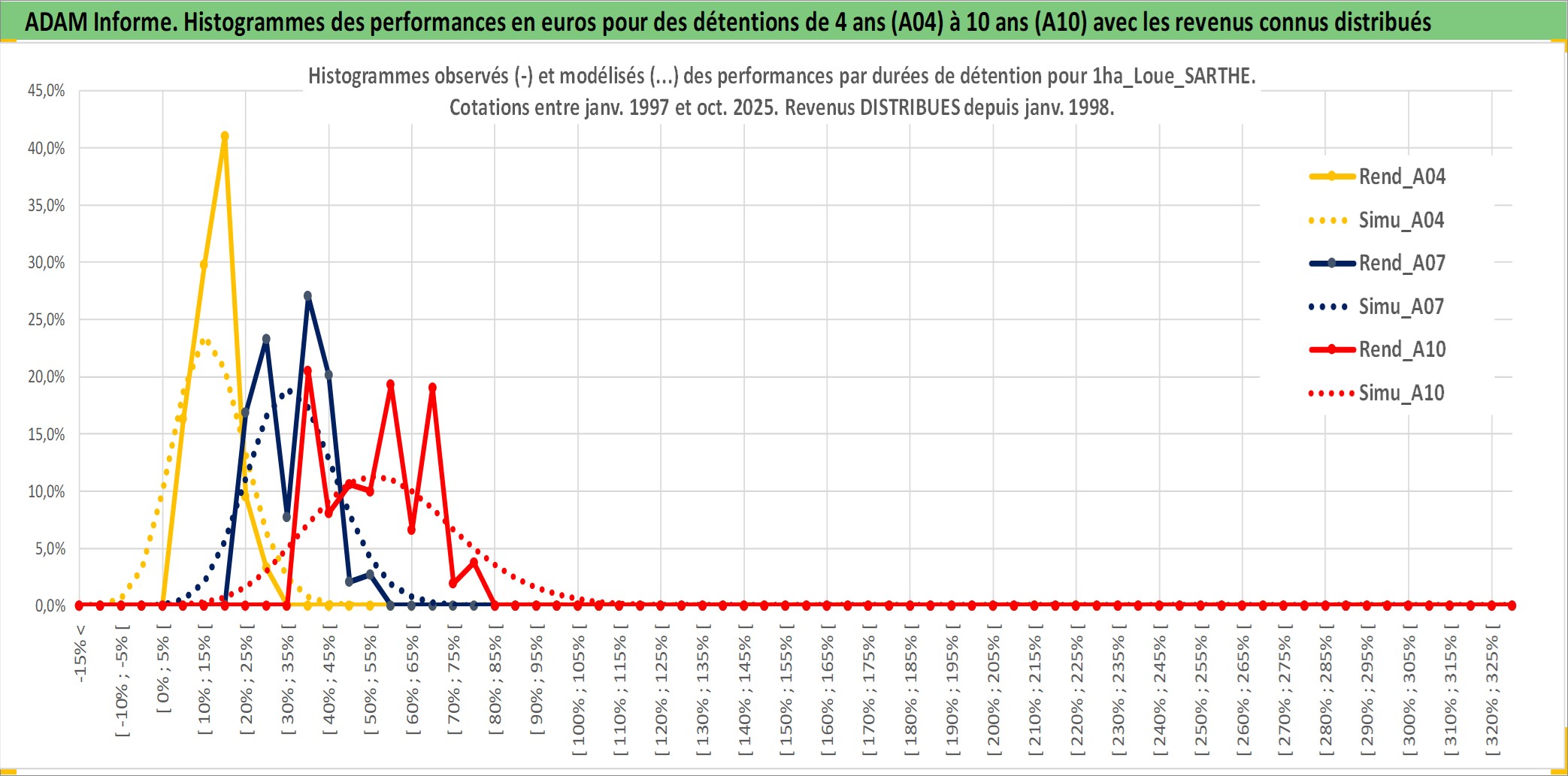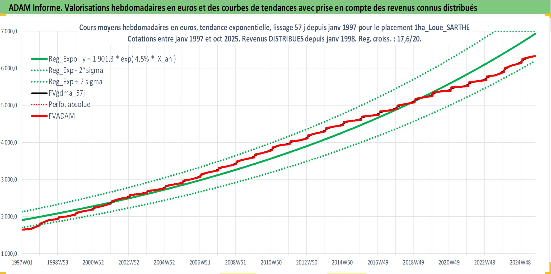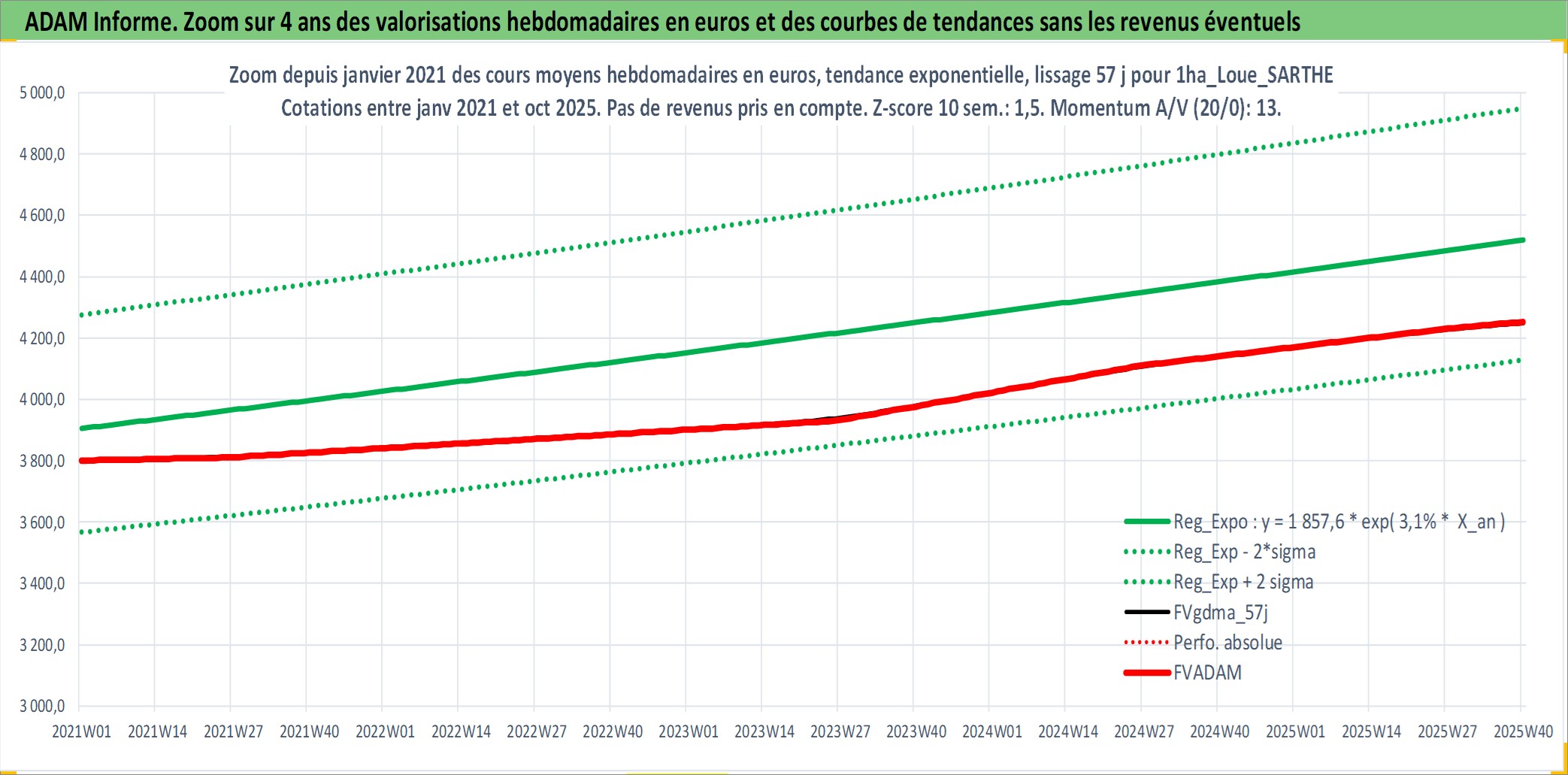 Site dédié aux investisseursPage dédiée sur site financeAnalyse des valorisations hebdomadaires de l'actif 1ha_Loue_SARTHE. Cet actif est cote en EUR. Les valorisations couvrent les semaines 1997W01 a 2025W40. Les fermages de ce bien foncier sont pris egaux a 2,5% annuels de la valeur venale du bien.