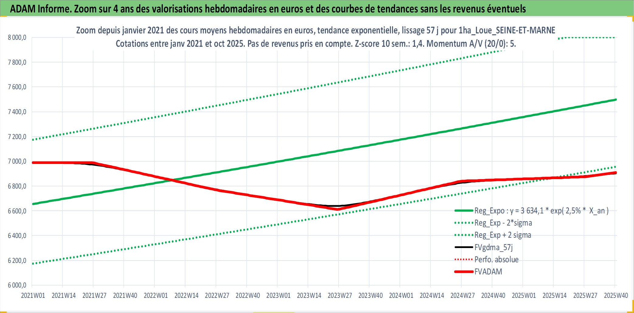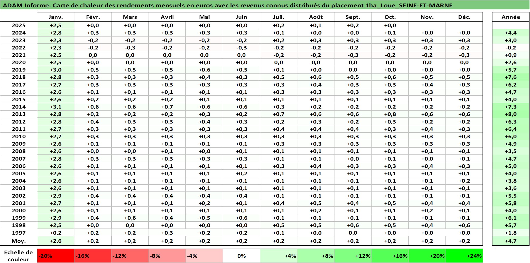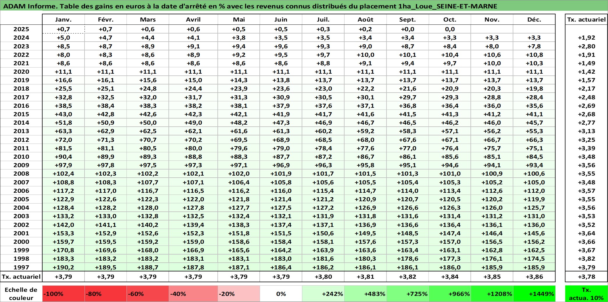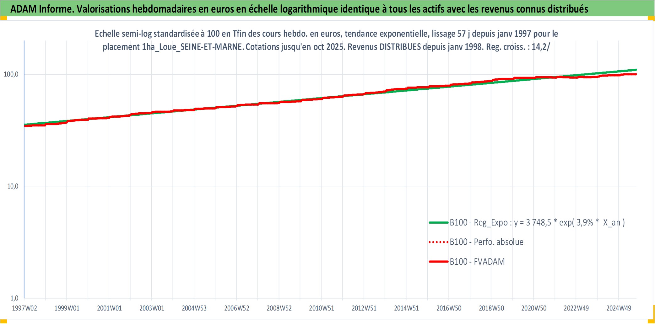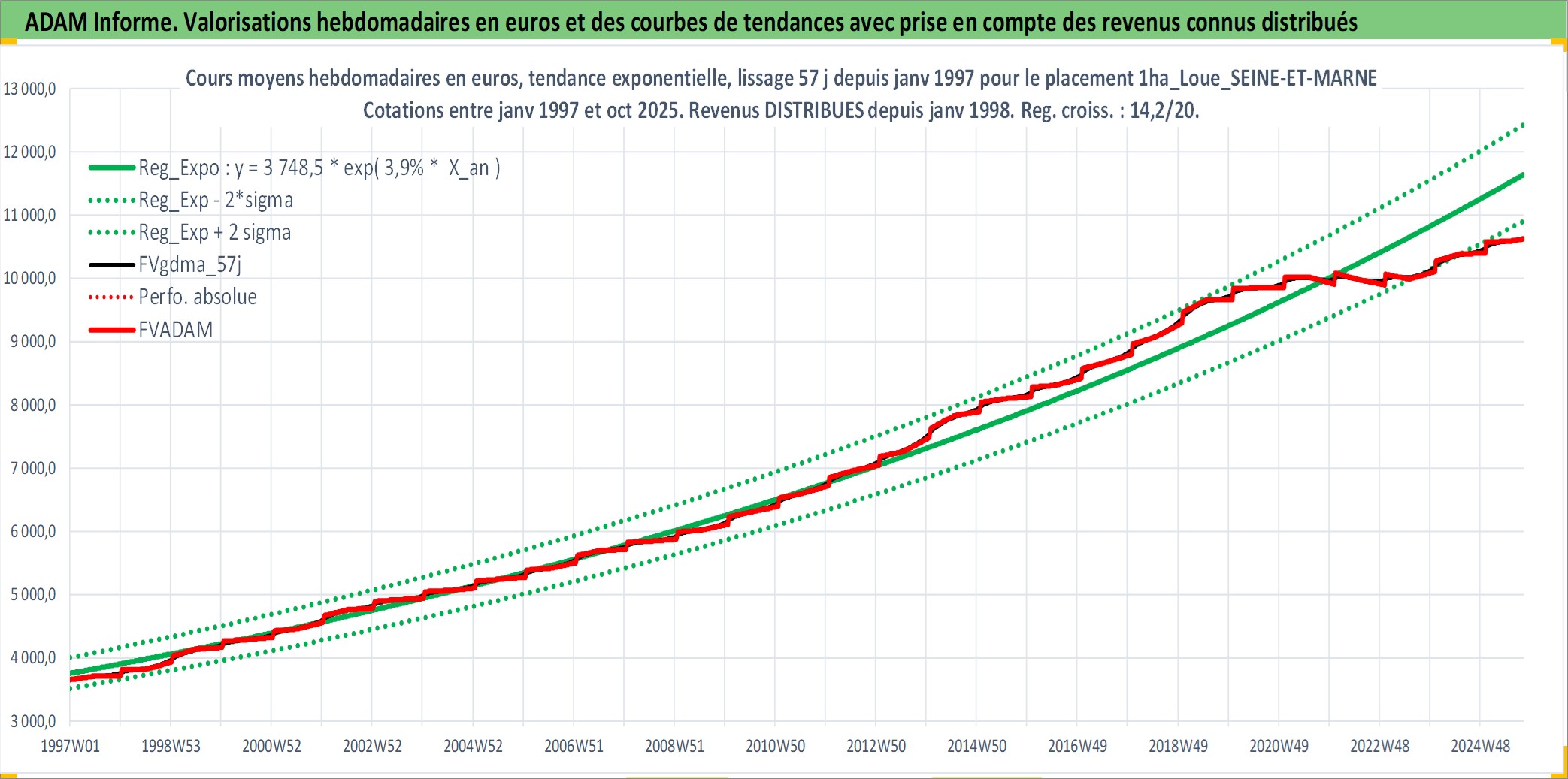 Site dédié aux investisseursPage dédiée sur site financeAnalyse des valorisations hebdomadaires de l'actif 1ha_Loue_SEINE-ET-MARNE. Cet actif est cote en EUR. Les valorisations couvrent les semaines 1997W01 a 2025W40. Les fermages de ce bien foncier sont pris egaux a 2,5% annuels de la valeur venale du bien.