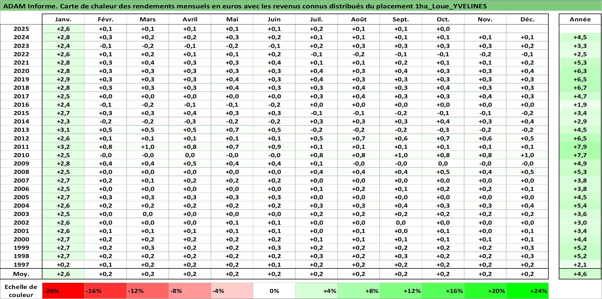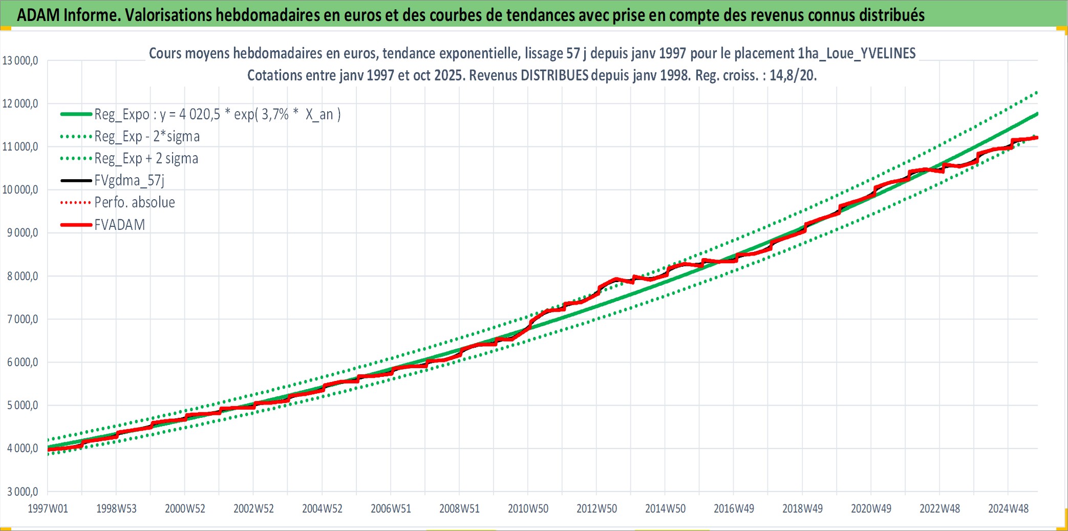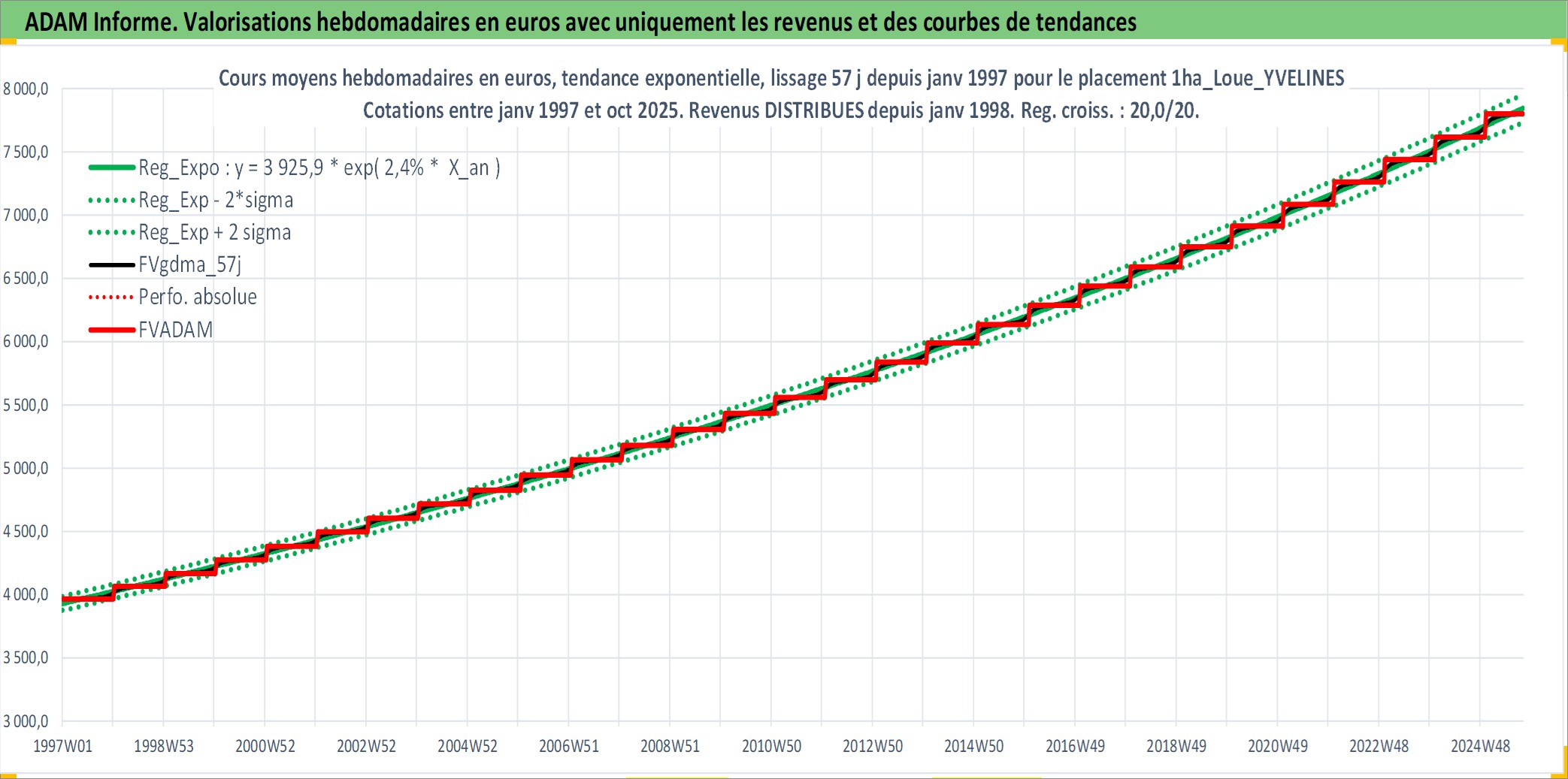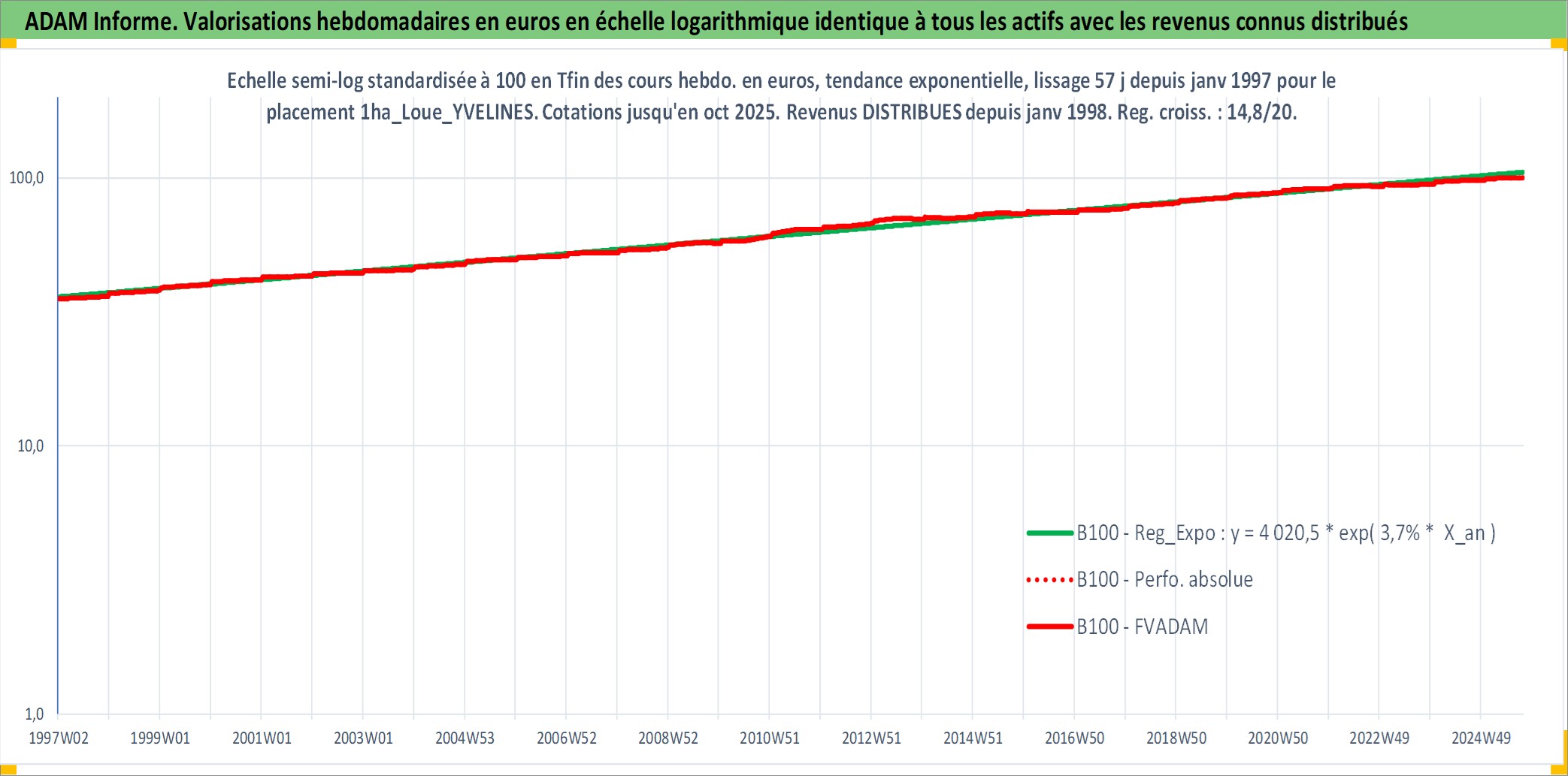 Site dédié aux investisseursPage dédiée sur site financeAnalyse des valorisations hebdomadaires de l'actif 1ha_Loue_YVELINES. Cet actif est cote en EUR. Les valorisations couvrent les semaines 1997W01 a 2025W40. Les fermages de ce bien foncier sont pris egaux a 2,5% annuels de la valeur venale du bien.