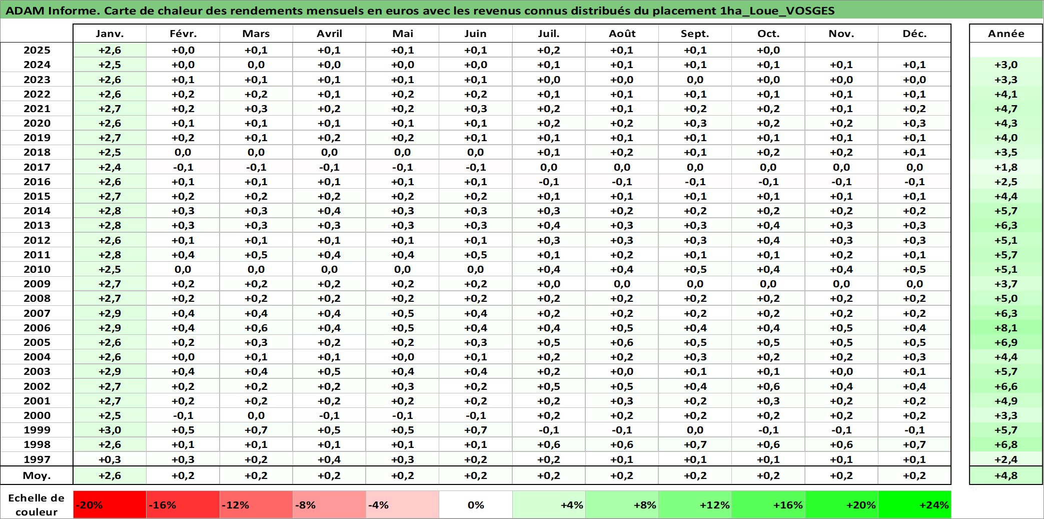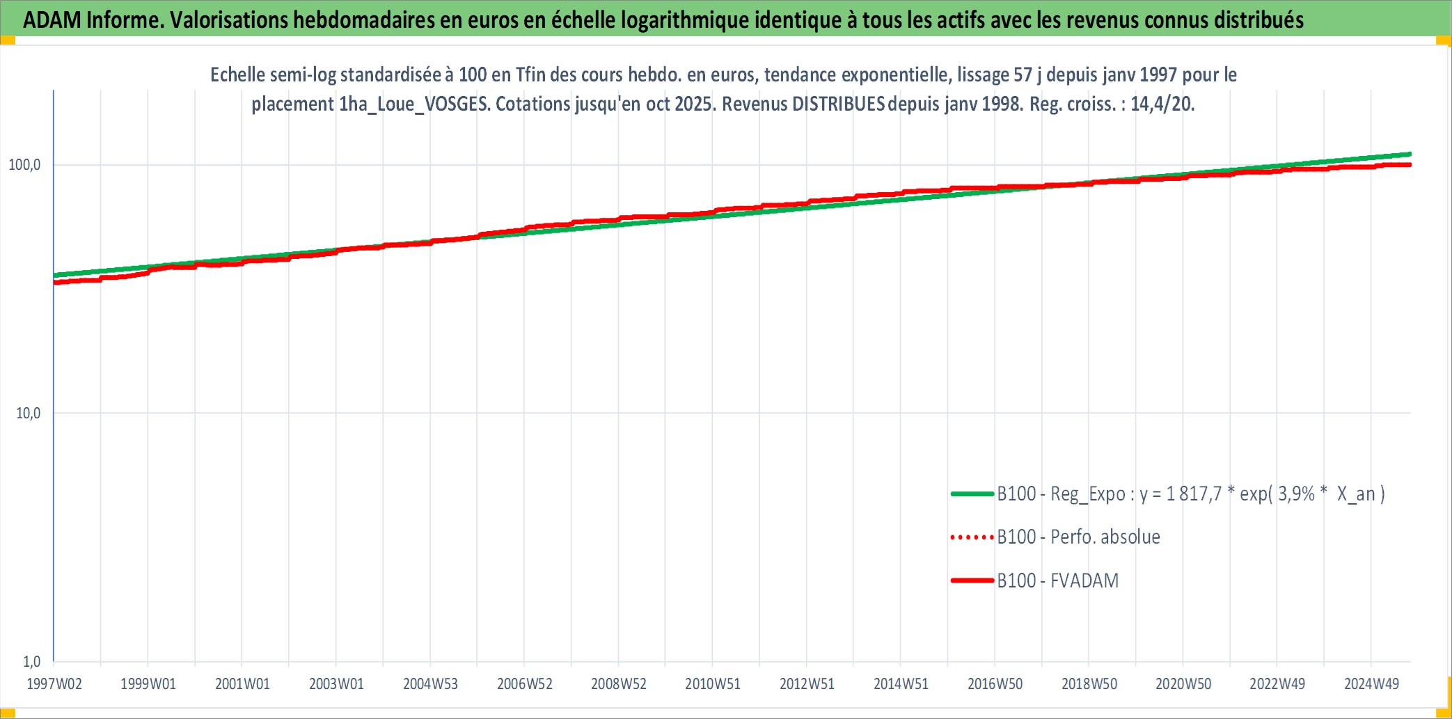 Site dédié aux investisseursPage dédiée sur site financeAnalyse des valorisations hebdomadaires de l'actif 1ha_Loue_VOSGES. Cet actif est cote en EUR. Les valorisations couvrent les semaines 1997W01 a 2025W40. Les fermages de ce bien foncier sont pris egaux a 2,5% annuels de la valeur venale du bien.