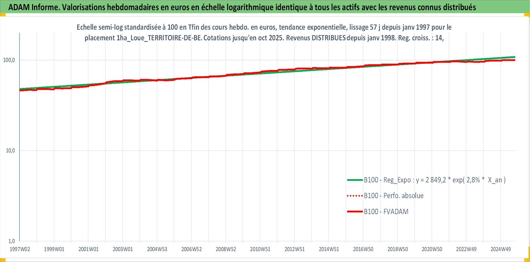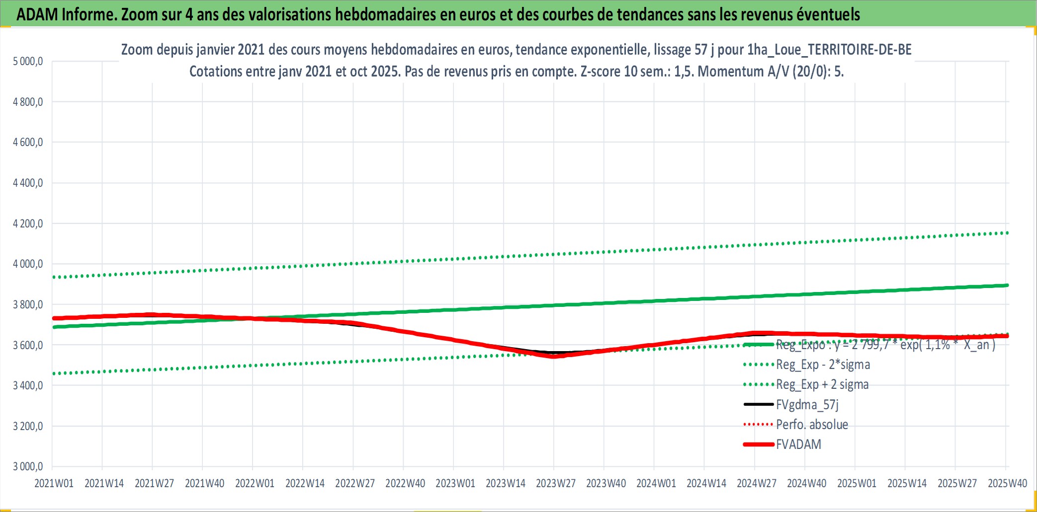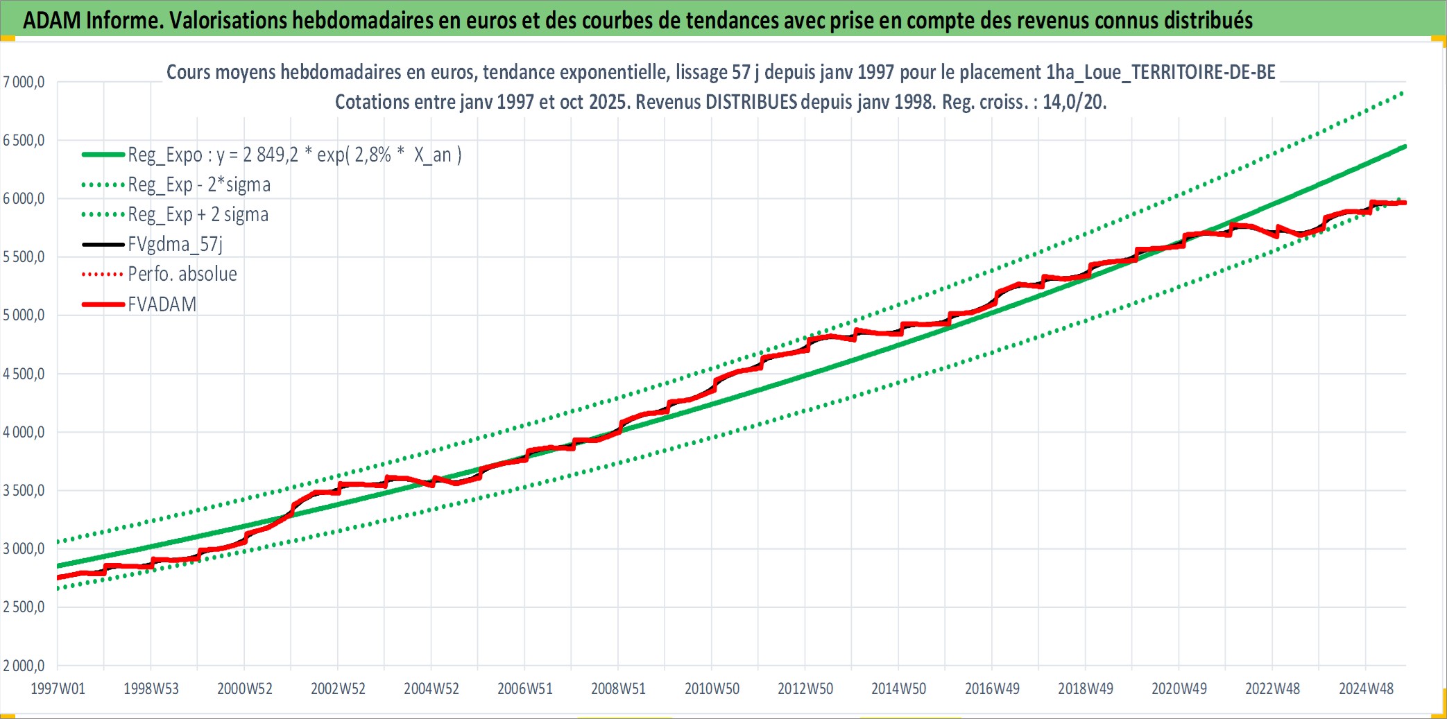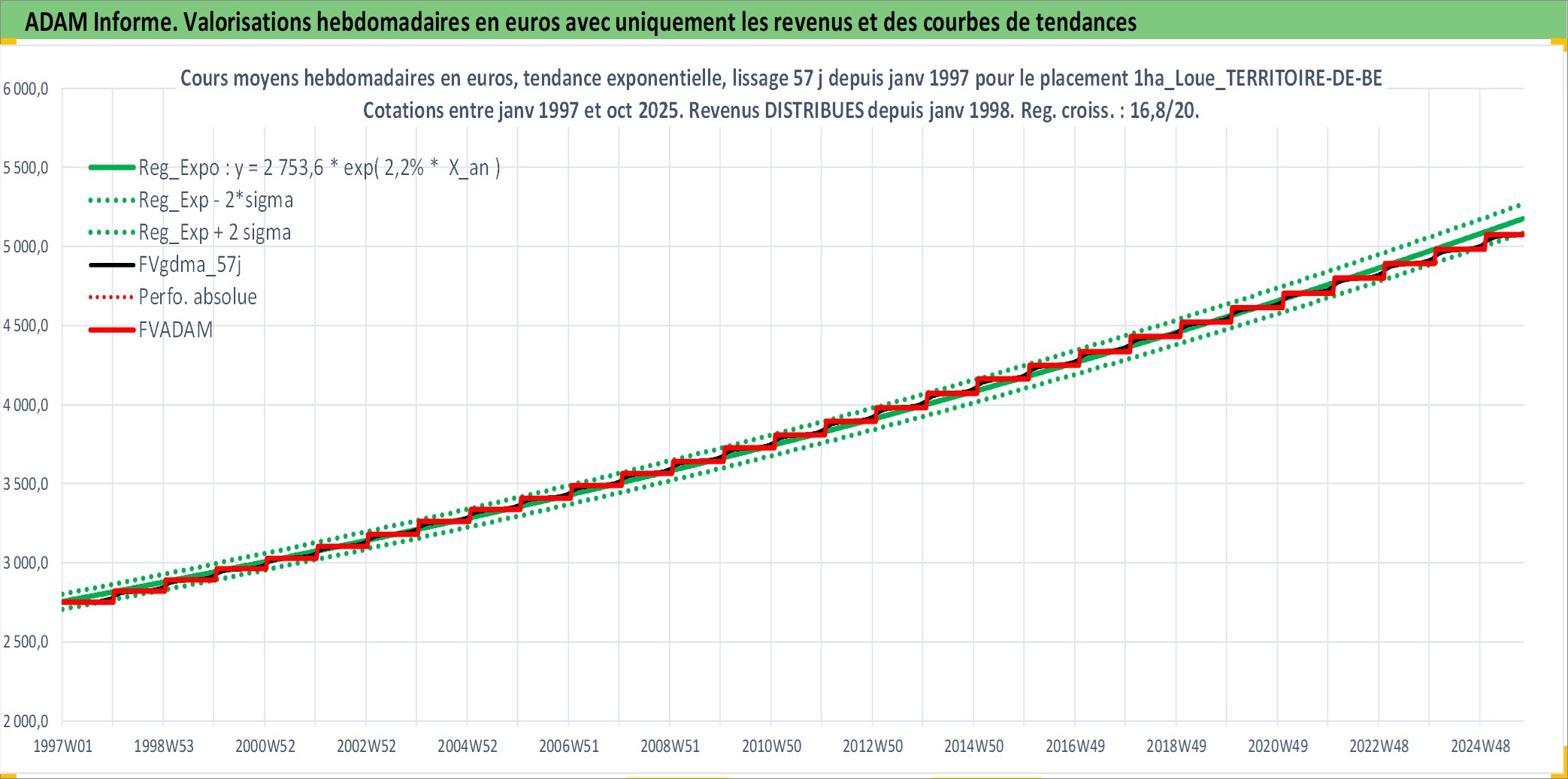Site dédié aux investisseursPage dédiée sur site financeAnalyse des valorisations hebdomadaires de l'actif 1ha_Loue_TERRITOIRE-DE-BELFORT. Cet actif est cote en EUR. Les valorisations couvrent les semaines 1997W01 a 2025W40. Les fermages de ce bien foncier sont pris egaux a 2,5% annuels de la valeur venale du bien.