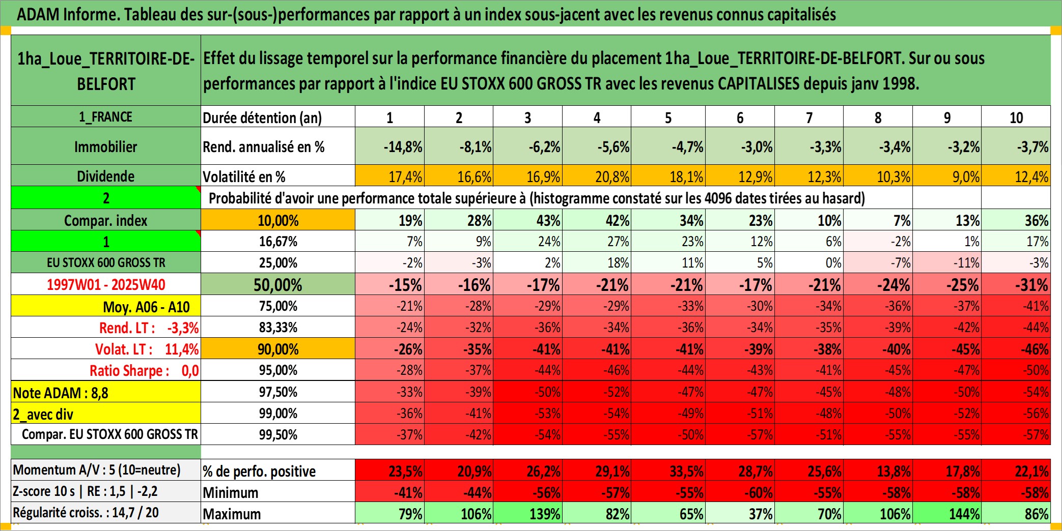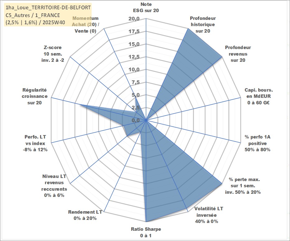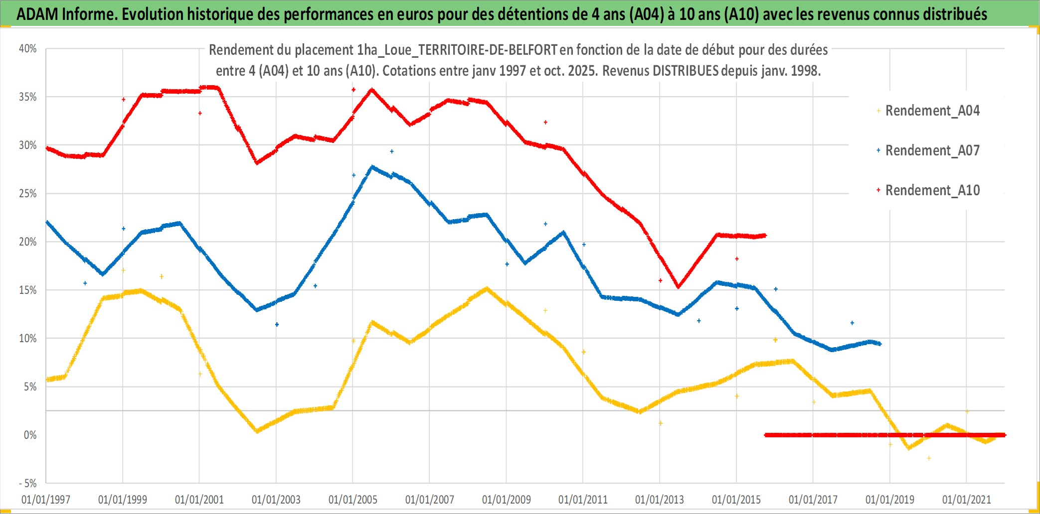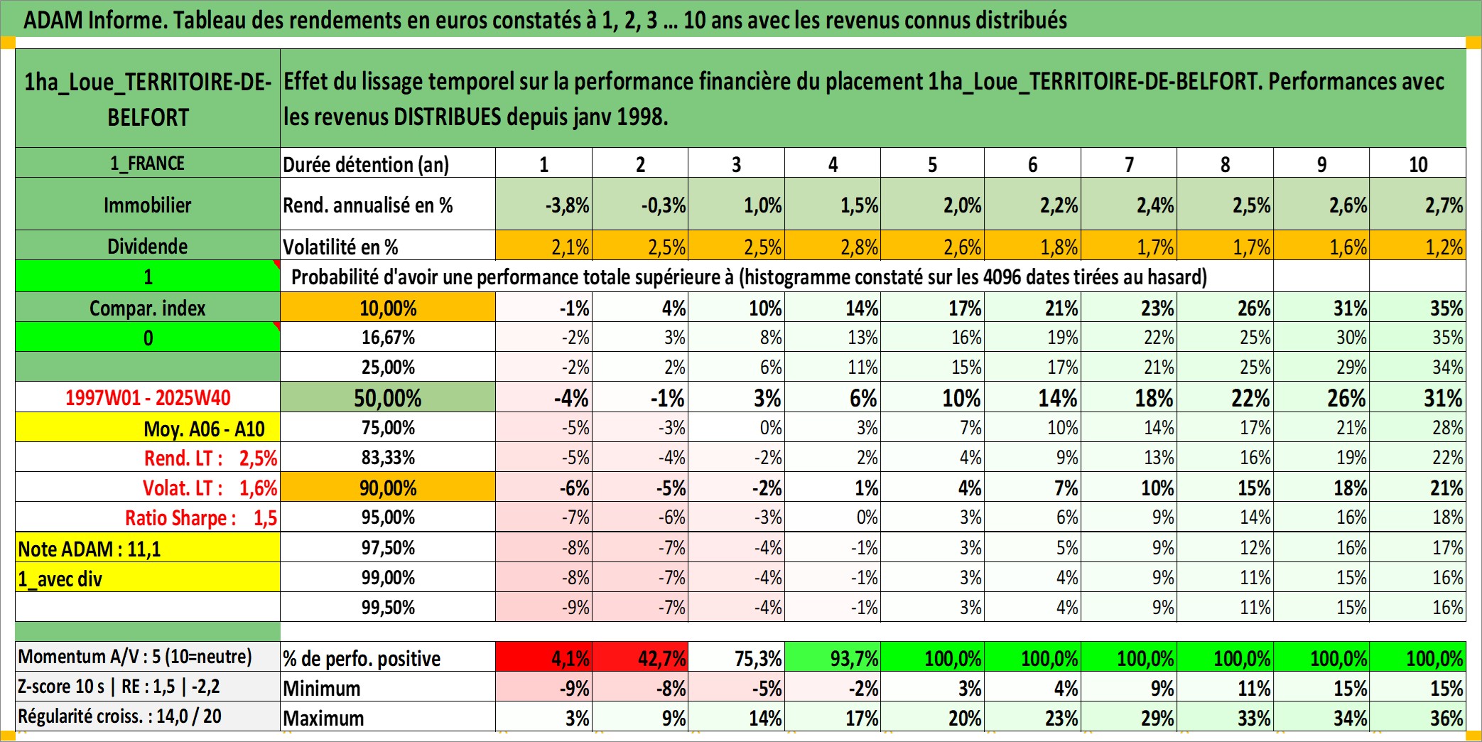 Site dédié aux investisseursPage dédiée sur site financeAnalyse des valorisations hebdomadaires de l'actif 1ha_Loue_TERRITOIRE-DE-BELFORT. Cet actif est cote en EUR. Les valorisations couvrent les semaines 1997W01 a 2025W40. Les fermages de ce bien foncier sont pris egaux a 2,5% annuels de la valeur venale du bien.
