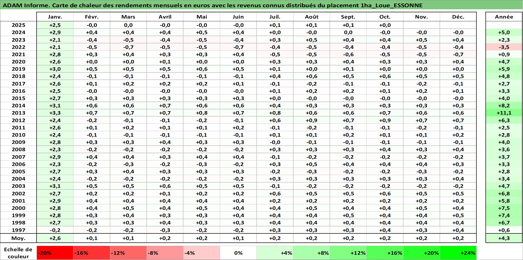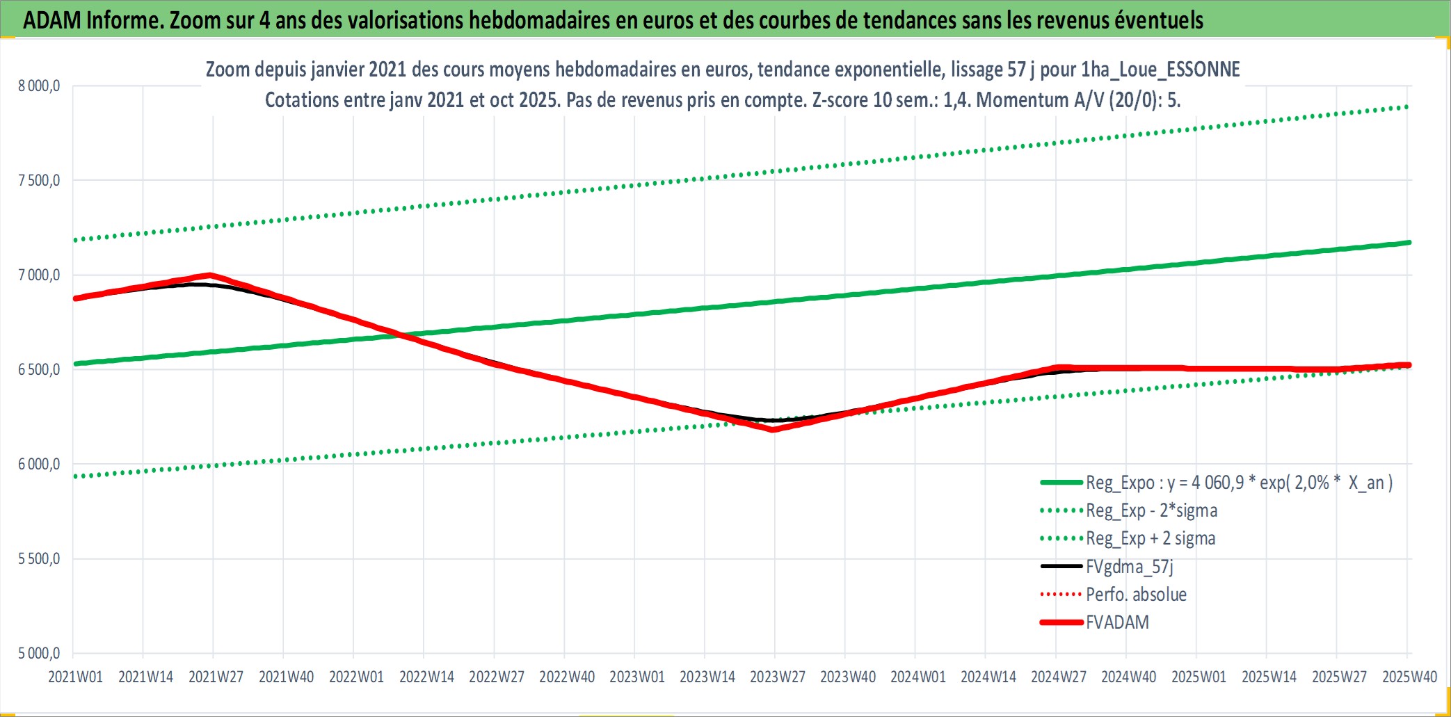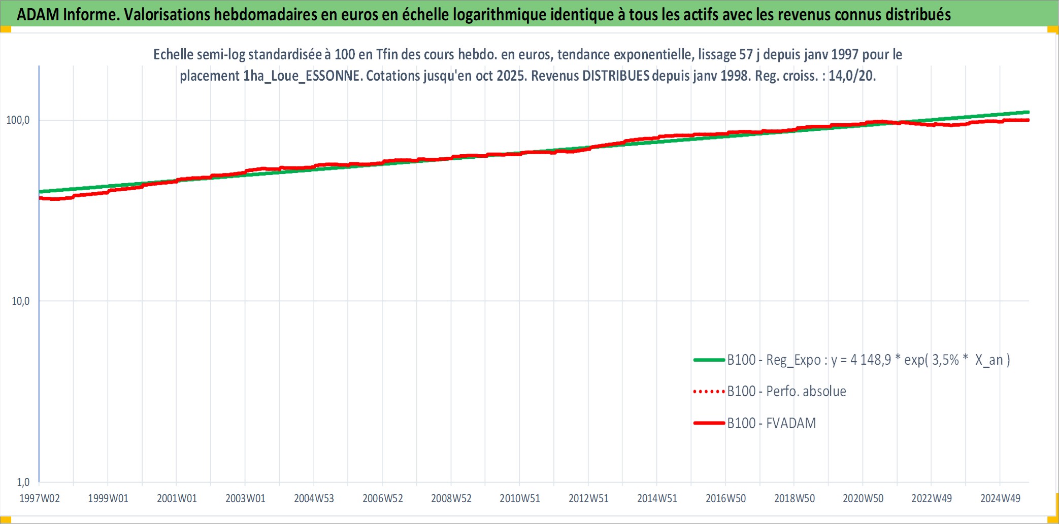 Site dédié aux investisseursPage dédiée sur site financeAnalyse des valorisations hebdomadaires de l'actif 1ha_Loue_ESSONNE. Cet actif est cote en EUR. Les valorisations couvrent les semaines 1997W01 a 2025W40. Les fermages de ce bien foncier sont pris egaux a 2,5% annuels de la valeur venale du bien.