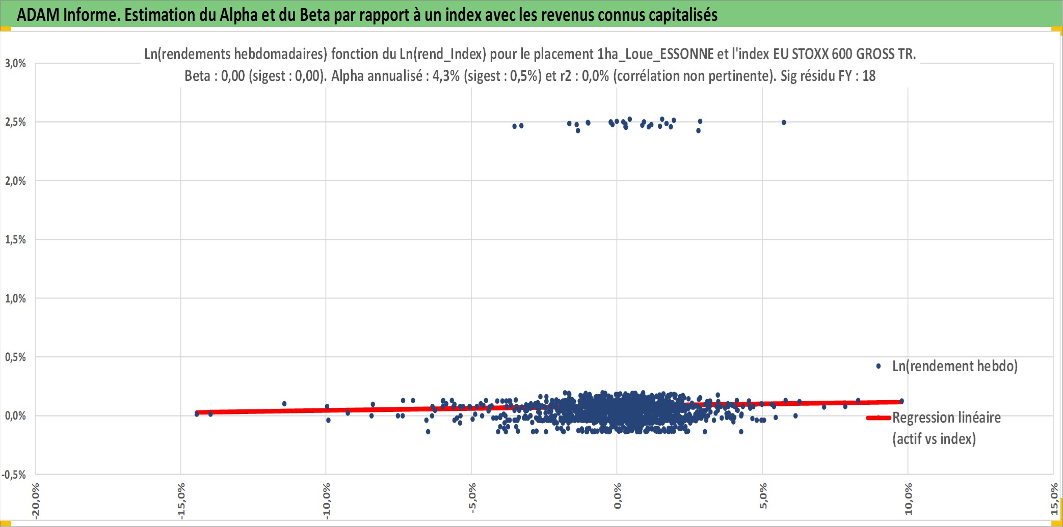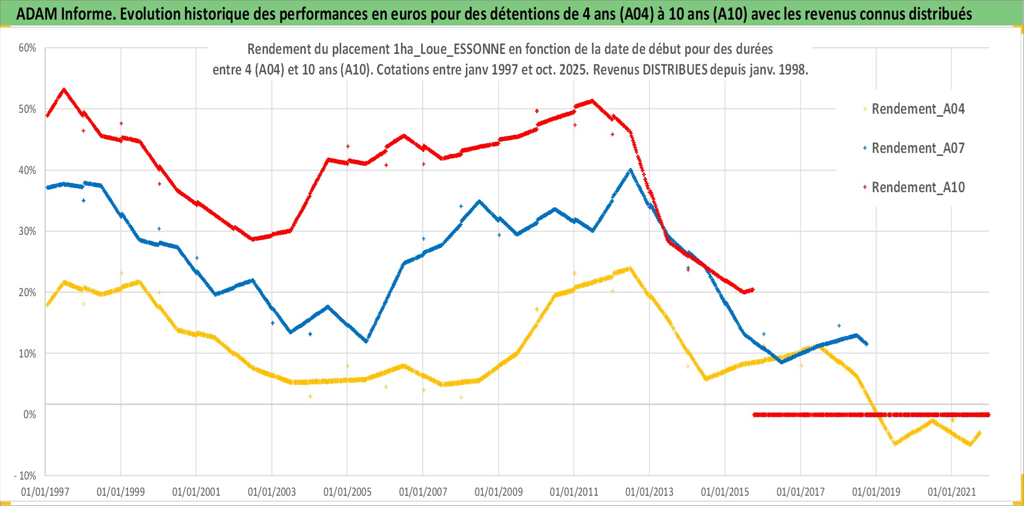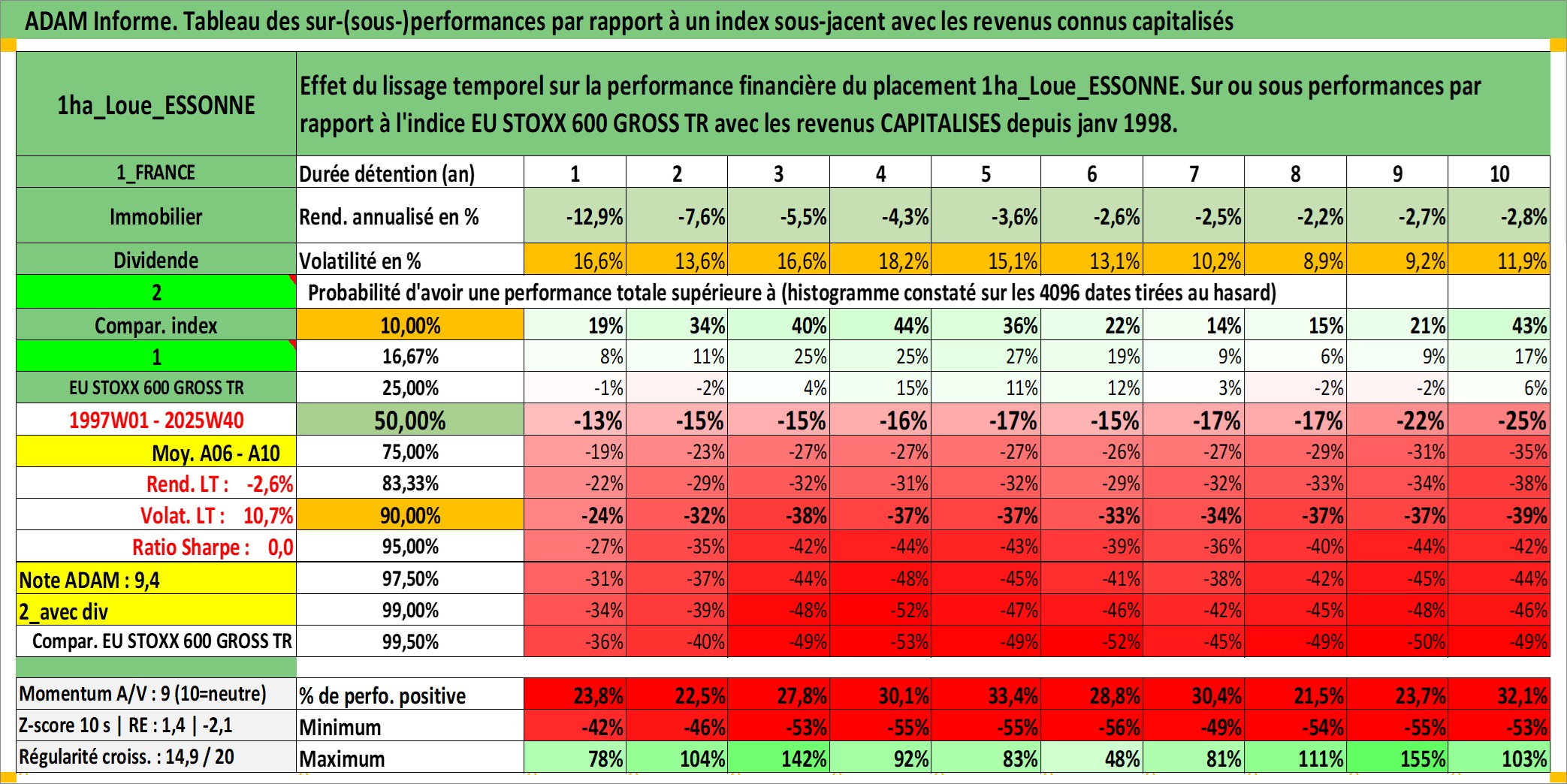 Site dédié aux investisseursPage dédiée sur site financeAnalyse des valorisations hebdomadaires de l'actif 1ha_Loue_ESSONNE. Cet actif est cote en EUR. Les valorisations couvrent les semaines 1997W01 a 2025W40. Les fermages de ce bien foncier sont pris egaux a 2,5% annuels de la valeur venale du bien.