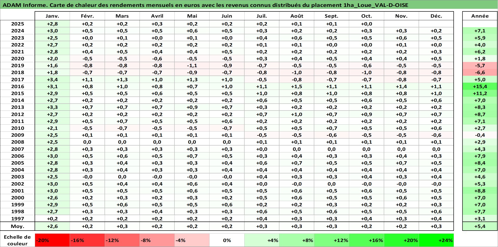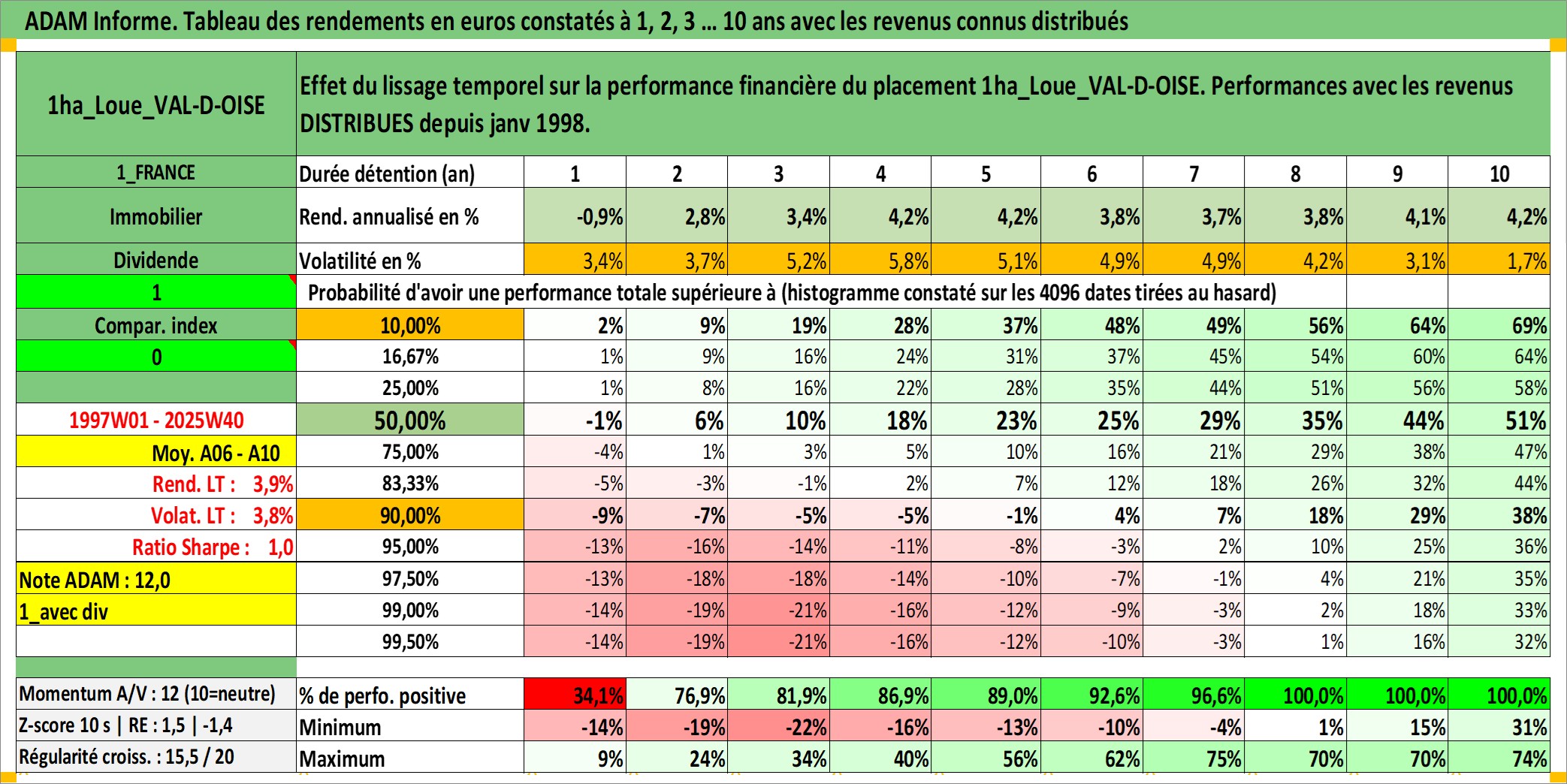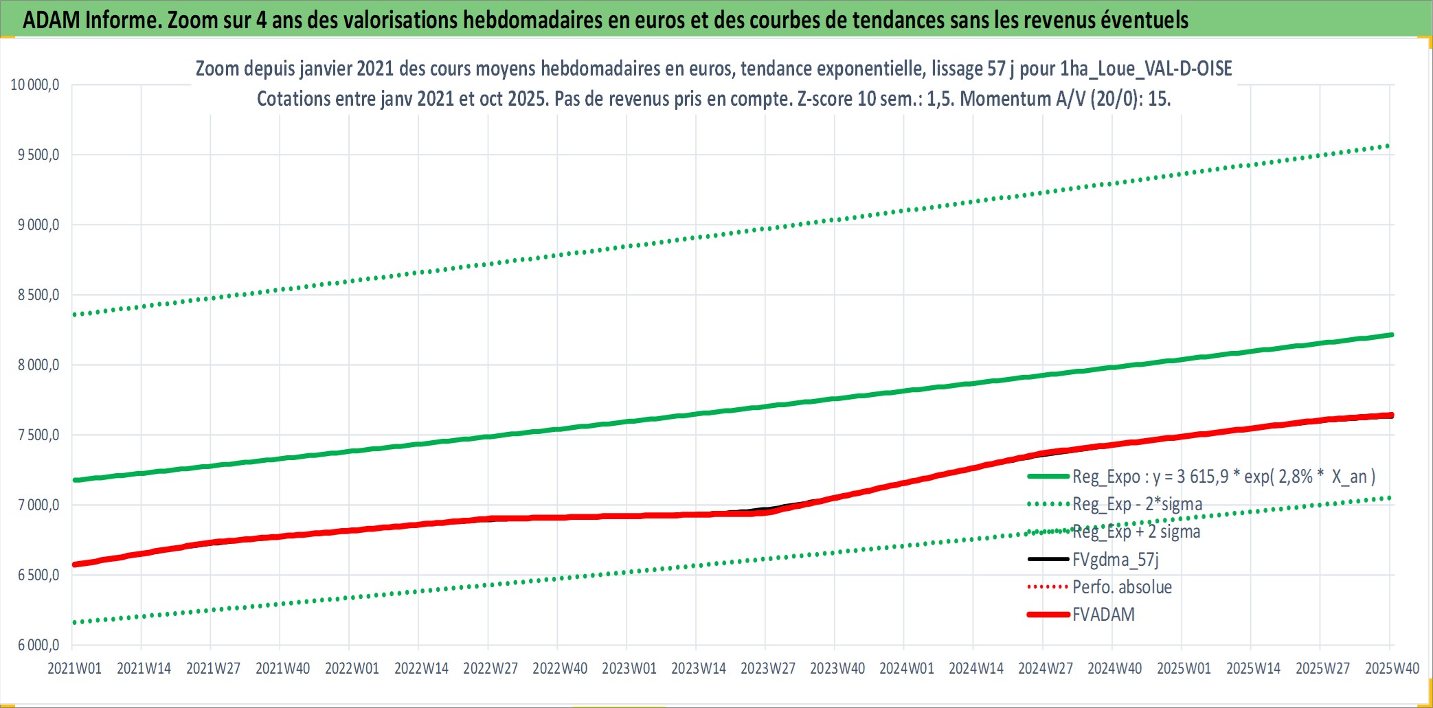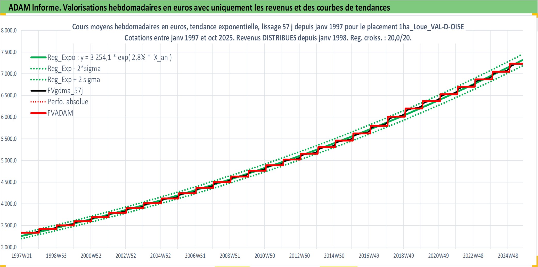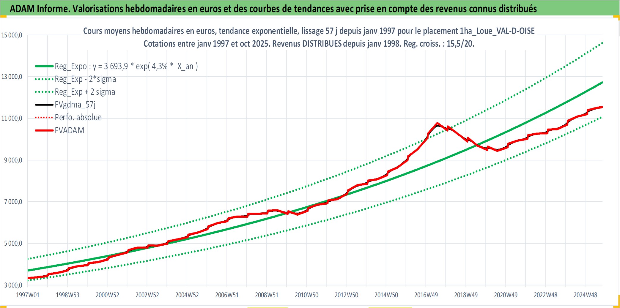 Site dédié aux investisseursPage dédiée sur site financeAnalyse des valorisations hebdomadaires de l'actif 1ha_Loue_VAL-D-OISE. Cet actif est cote en EUR. Les valorisations couvrent les semaines 1997W01 a 2025W40. Les fermages de ce bien foncier sont pris egaux a 2,5% annuels de la valeur venale du bien.