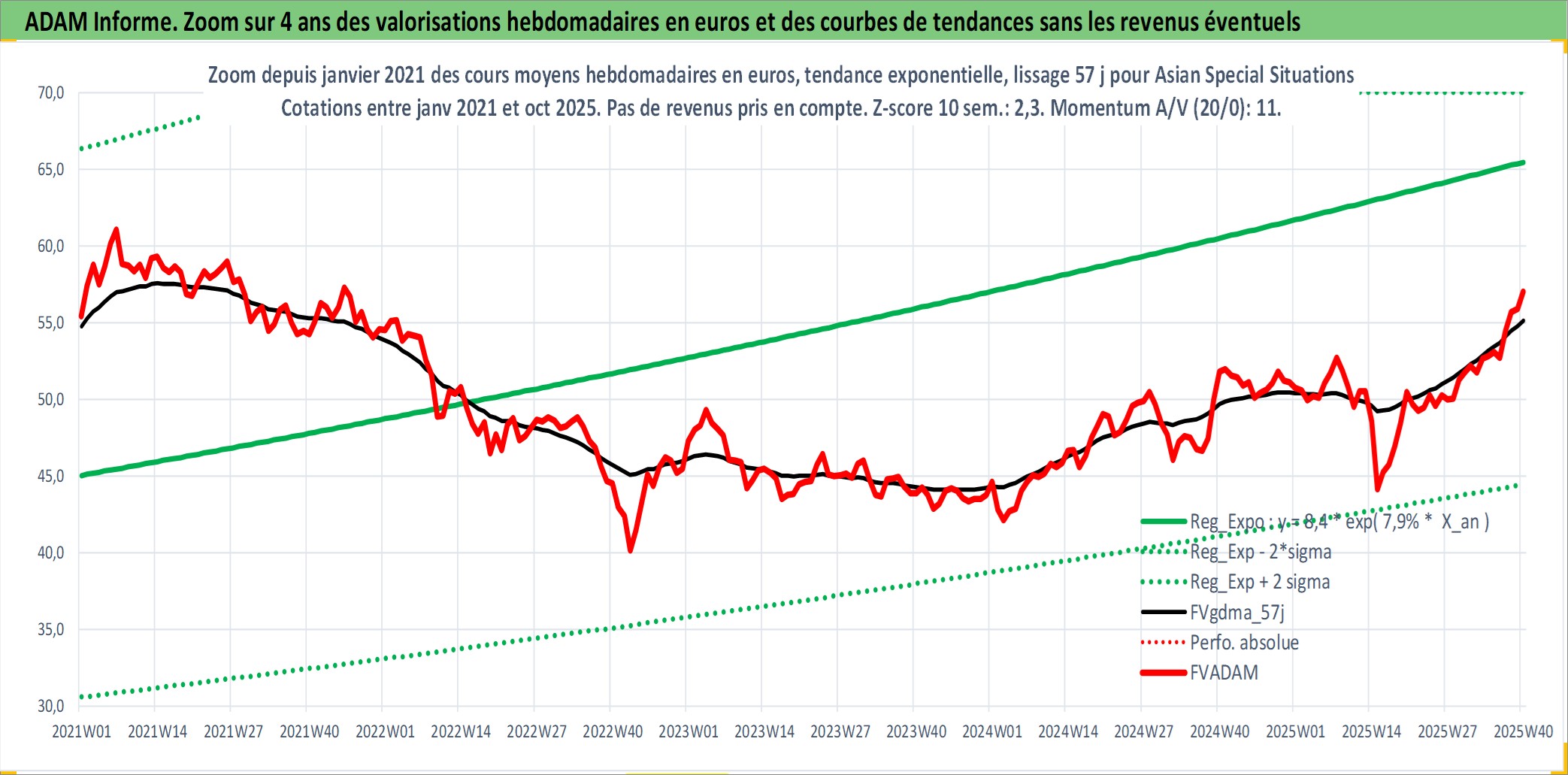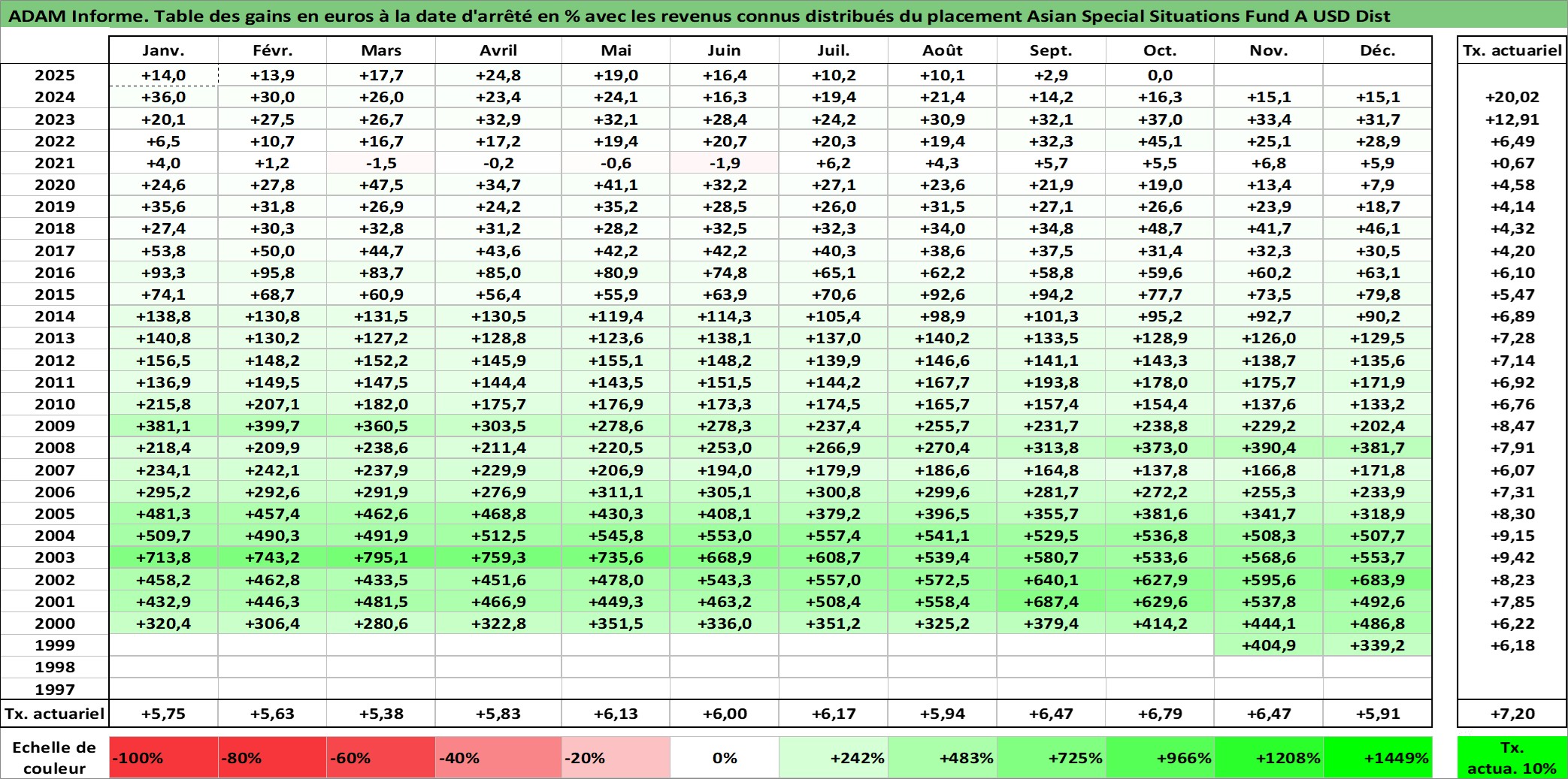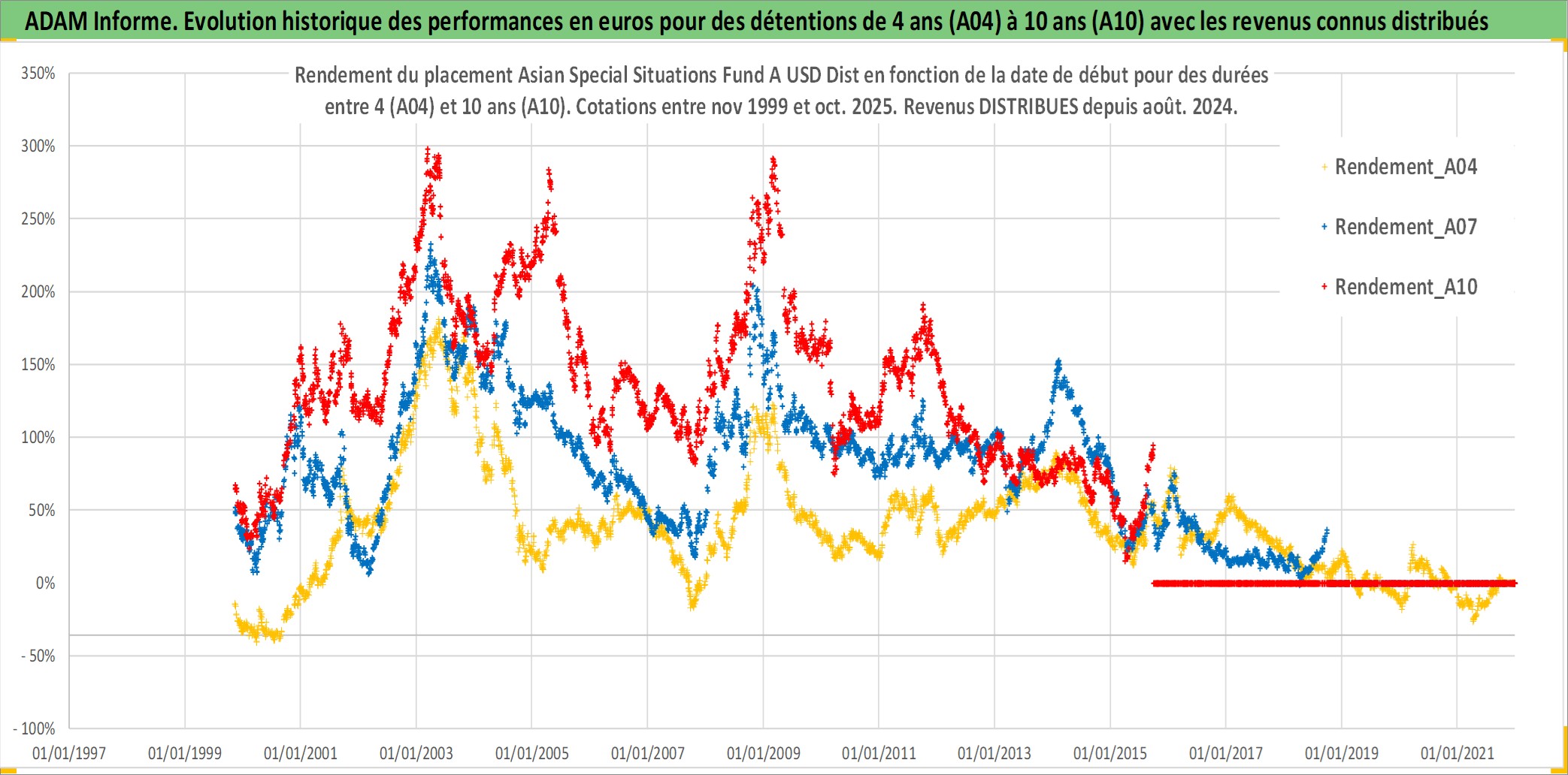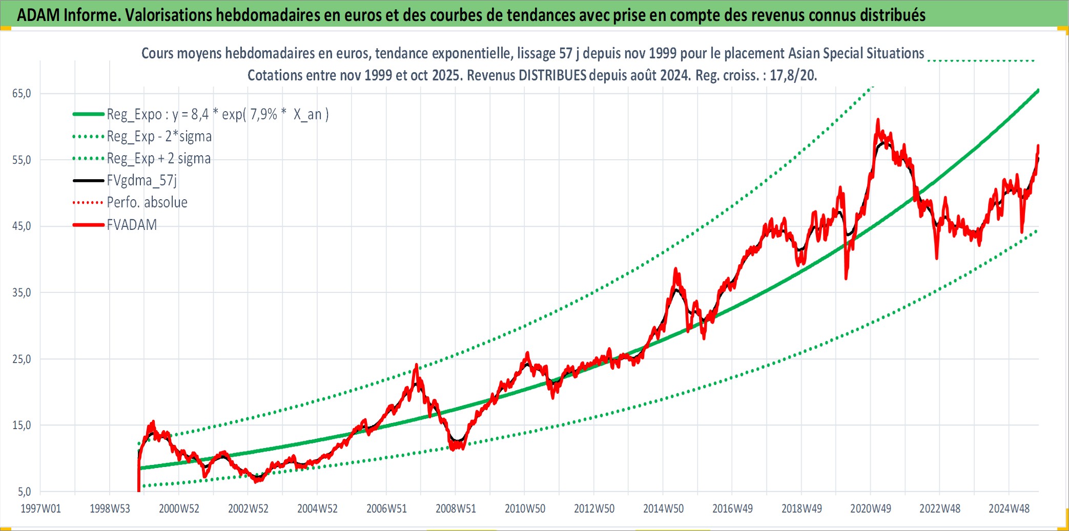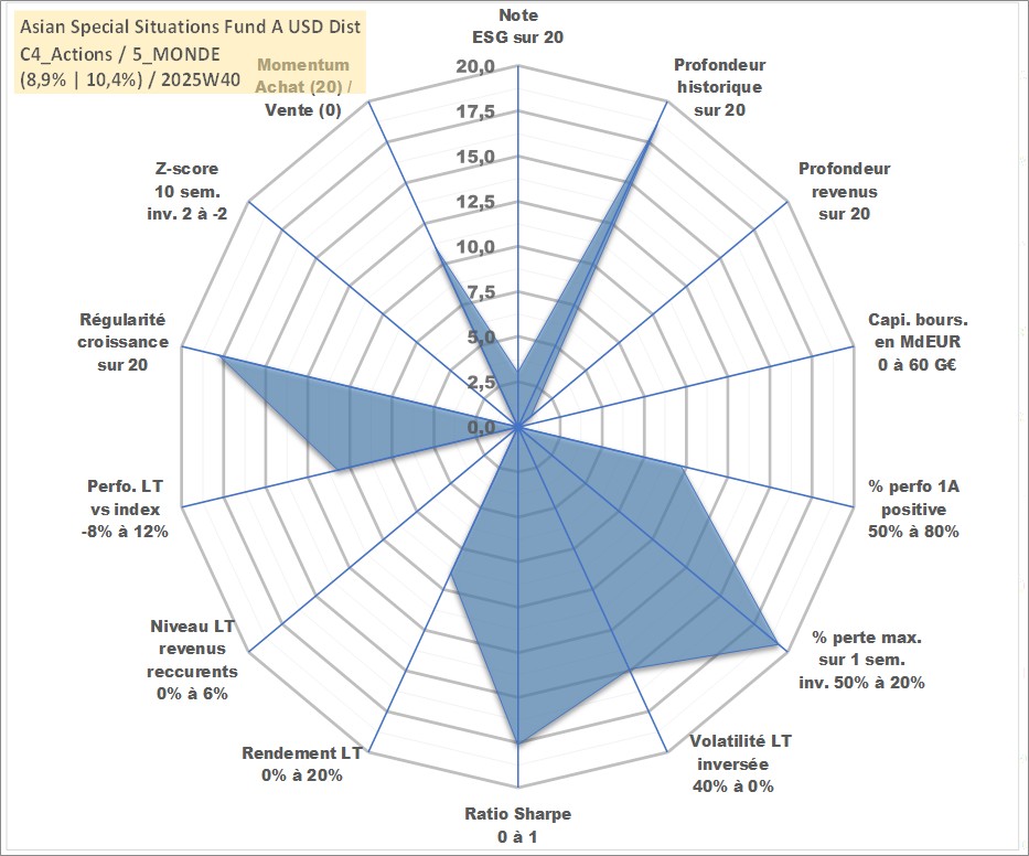 Site dédié aux investisseursPage dédiée sur site financeAnalyse des valorisations hebdomadaires du fonds Asian Special Situations Fund A USD Dist. Cet actif est cote en USD. Les valorisations sont en contrevaleur EURO et couvrent les semaines 1999W44 a 2025W40. Les revenus de cet actif financier sont pris en compte depuis la semaine 2024W31. La note globale ESG de cet actif est estimee a 3.0 (apres rebasage entre 0 et 20).