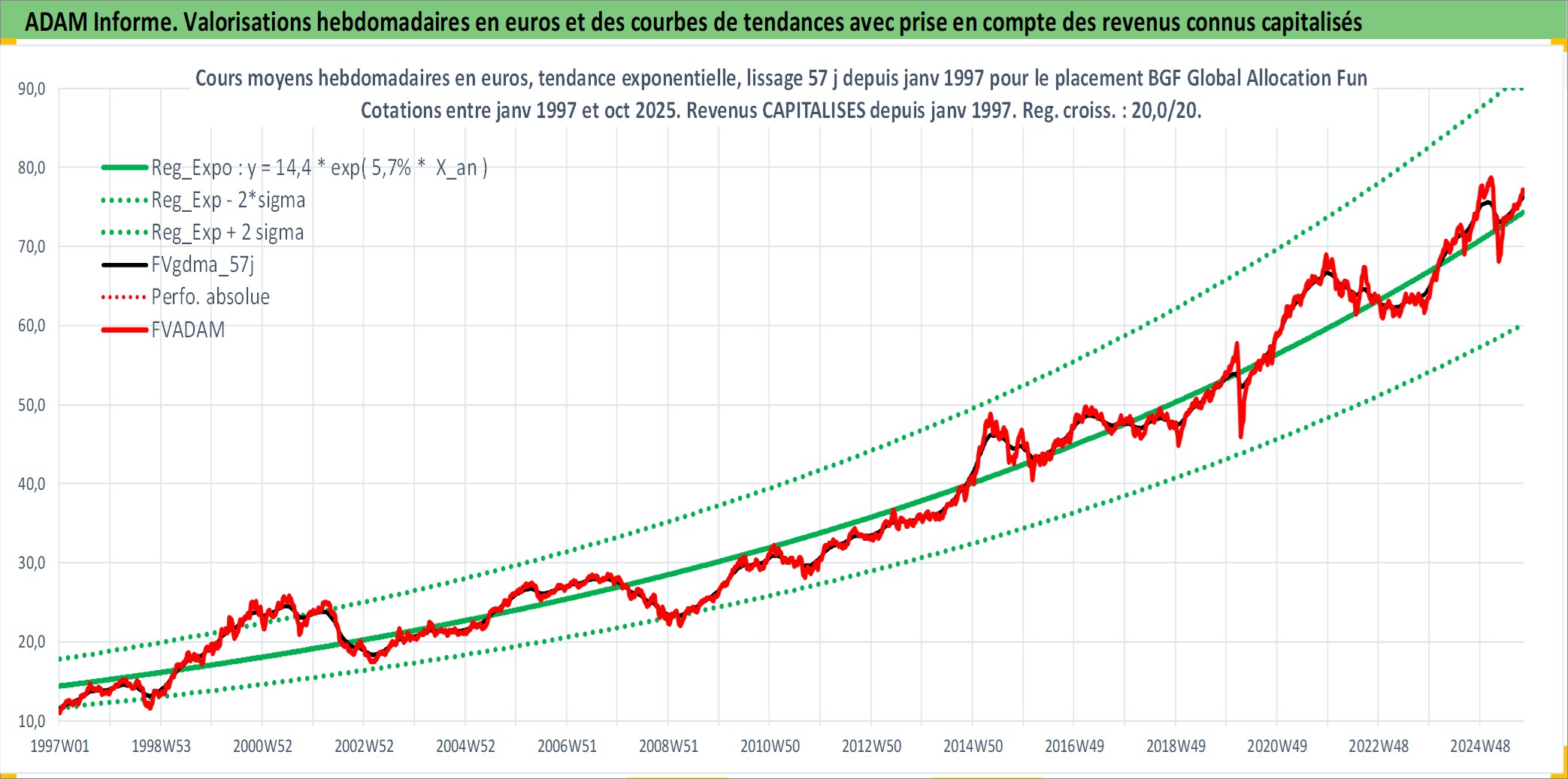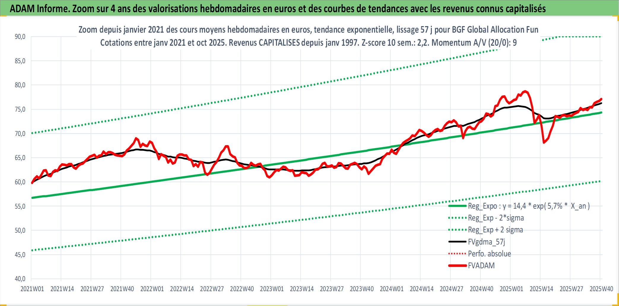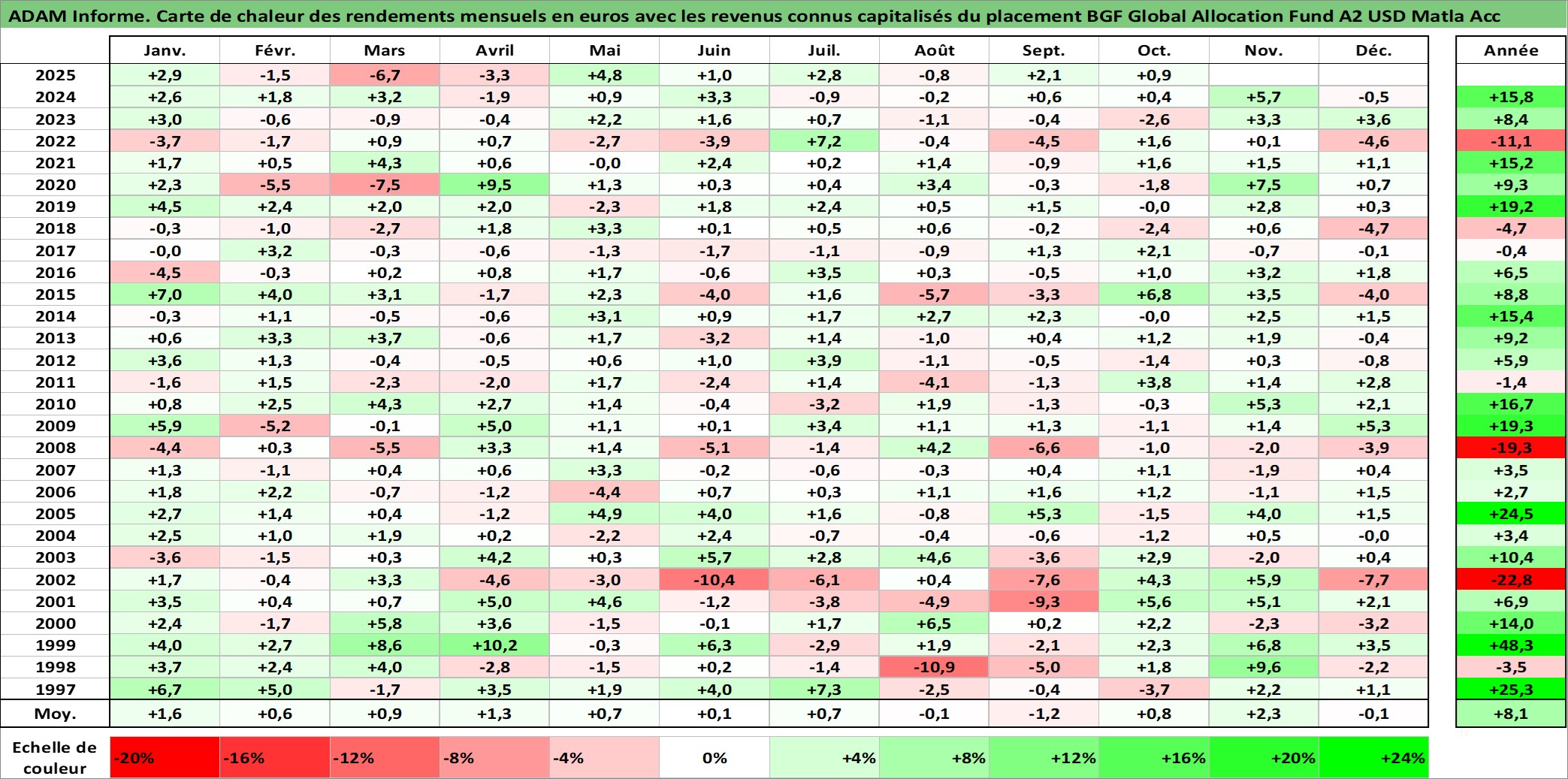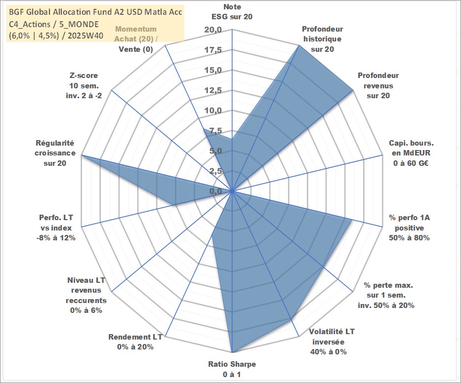 Site dédié aux investisseursPage dédiée sur site financeAnalyse des valorisations hebdomadaires du fonds BGF Global Allocation Fund A2 USD Matla Acc. Cet actif est cote en USD. Les valorisations sont en contrevaleur EURO et couvrent les semaines 1997W01 a 2025W40. Les revenus de cet actif financier sont pris en compte depuis la semaine 1997W01. La note globale ESG de cet actif est estimee a 6.4 (apres rebasage entre 0 et 20).