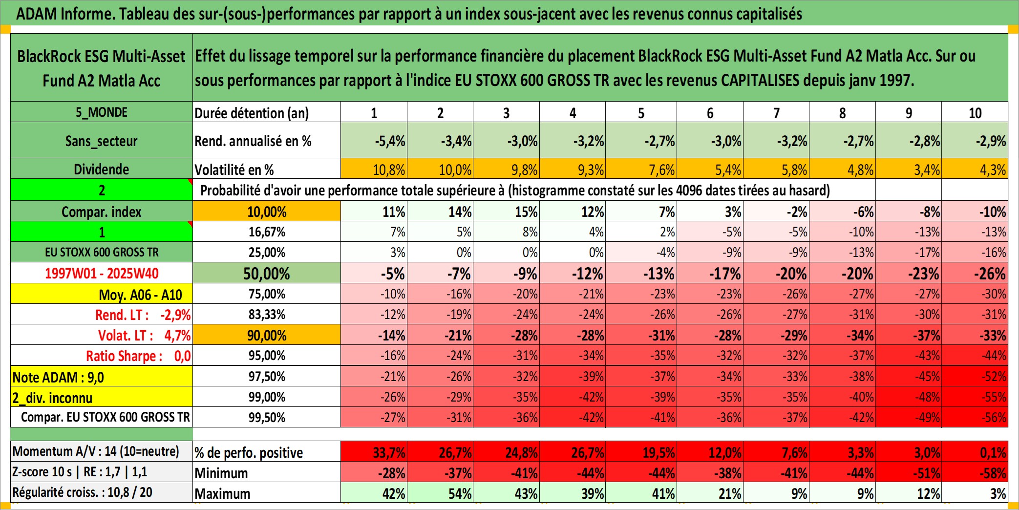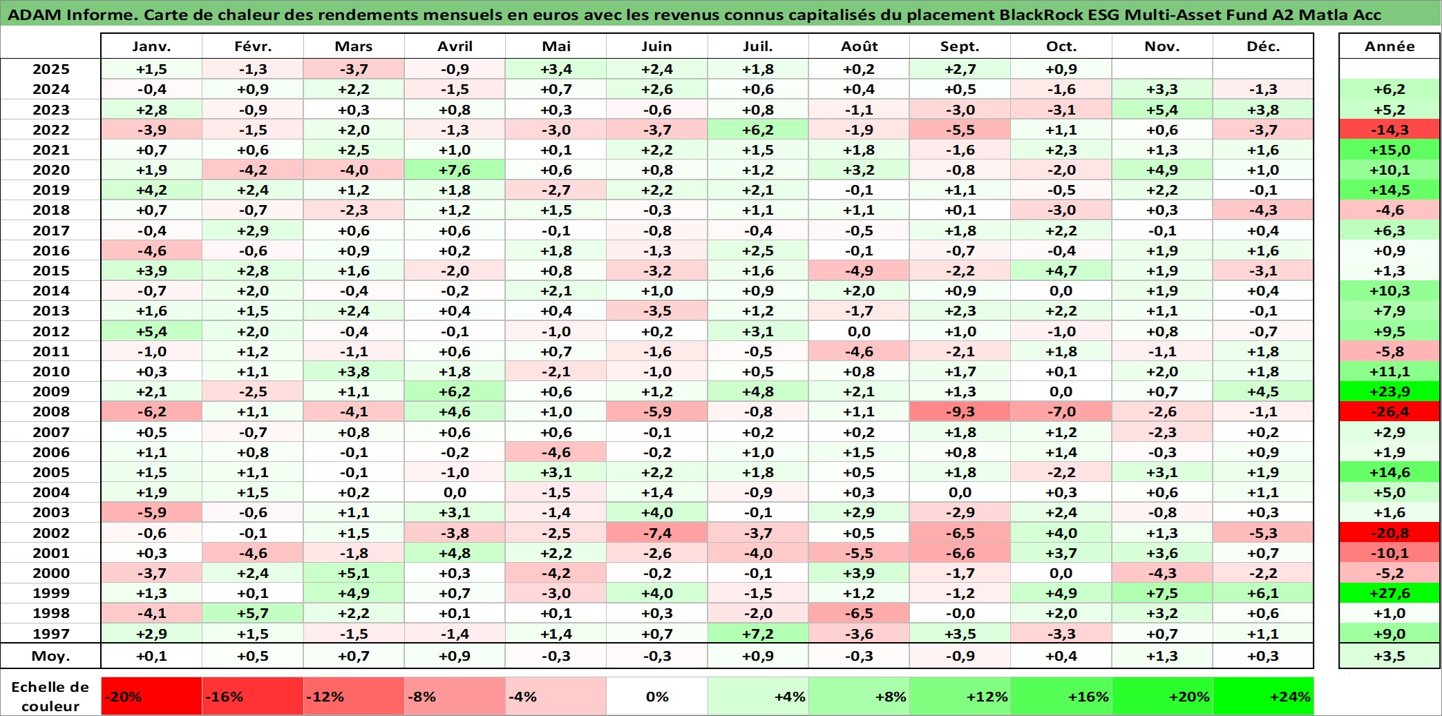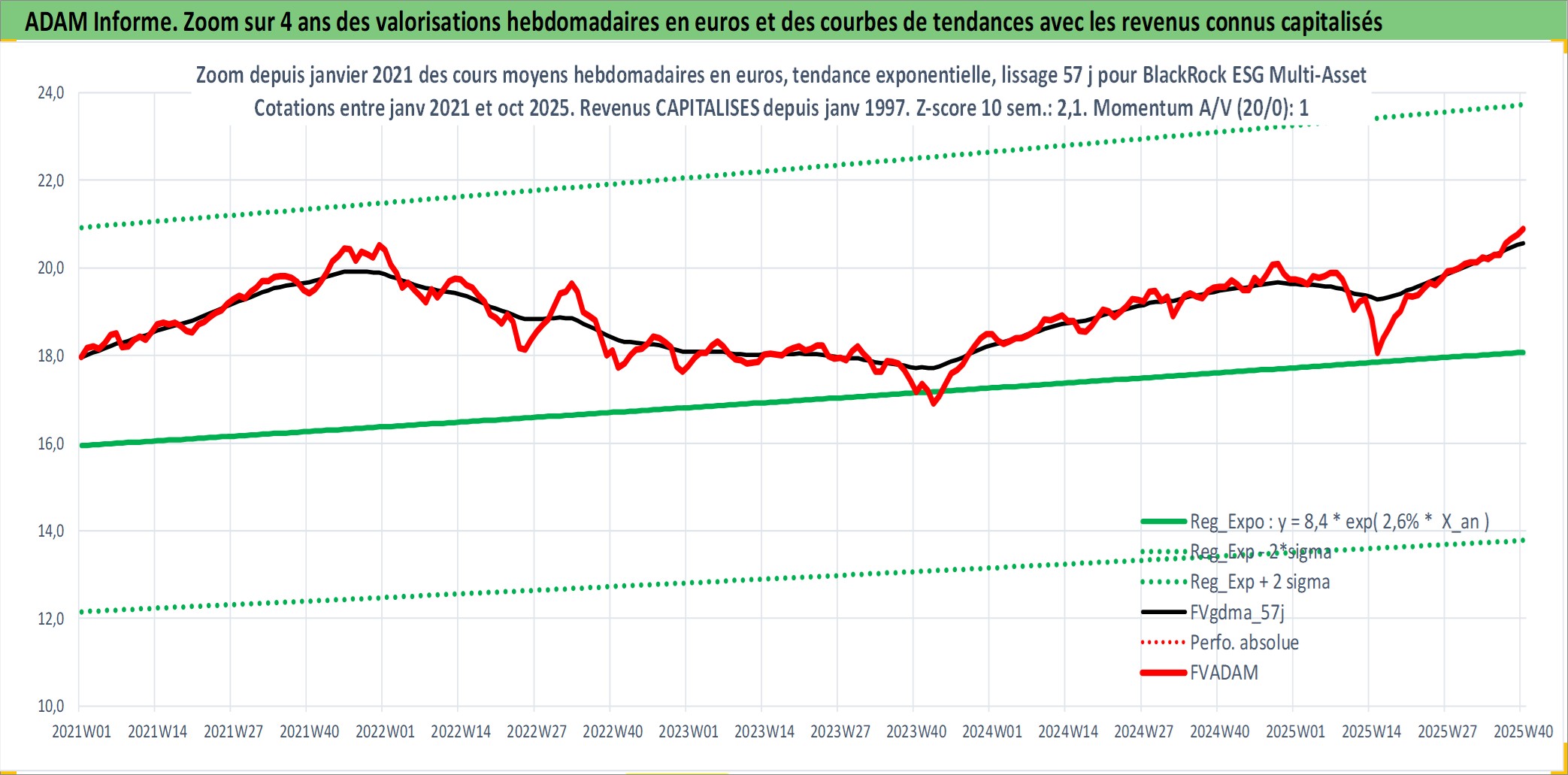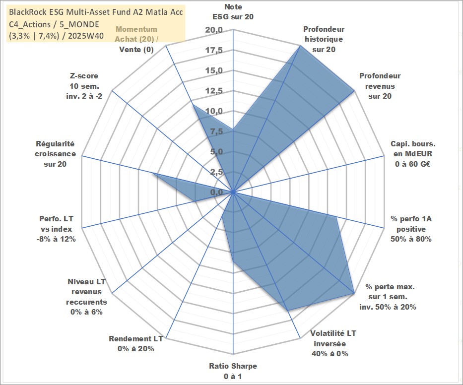 Site dédié aux investisseursPage dédiée sur site financeAnalyse des valorisations hebdomadaires du fonds BlackRock ESG Multi-Asset Fund A2 Matla Acc. Cet actif est cote en EUR. Les valorisations couvrent les semaines 1997W01 a 2025W40. Les revenus de cet actif financier sont pris en compte depuis la semaine 1997W01. La note globale ESG de cet actif est estimee a 7.7 (apres rebasage entre 0 et 20).