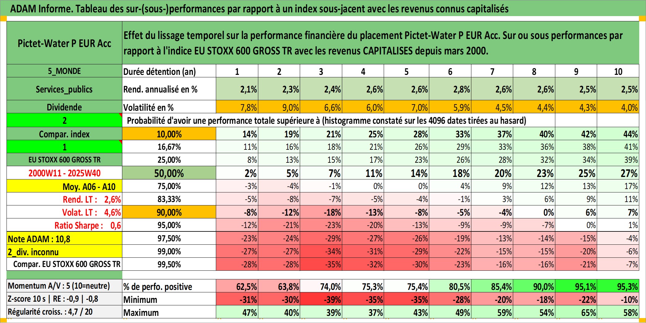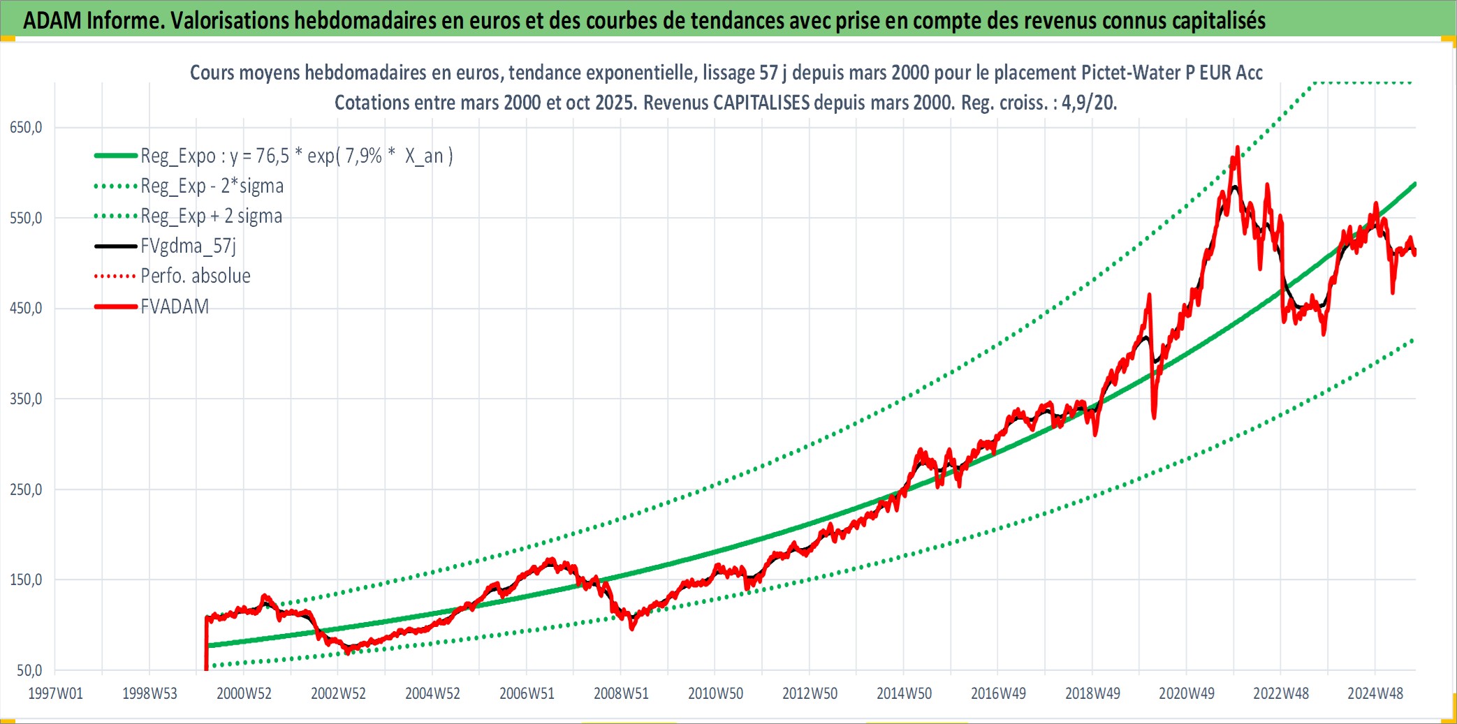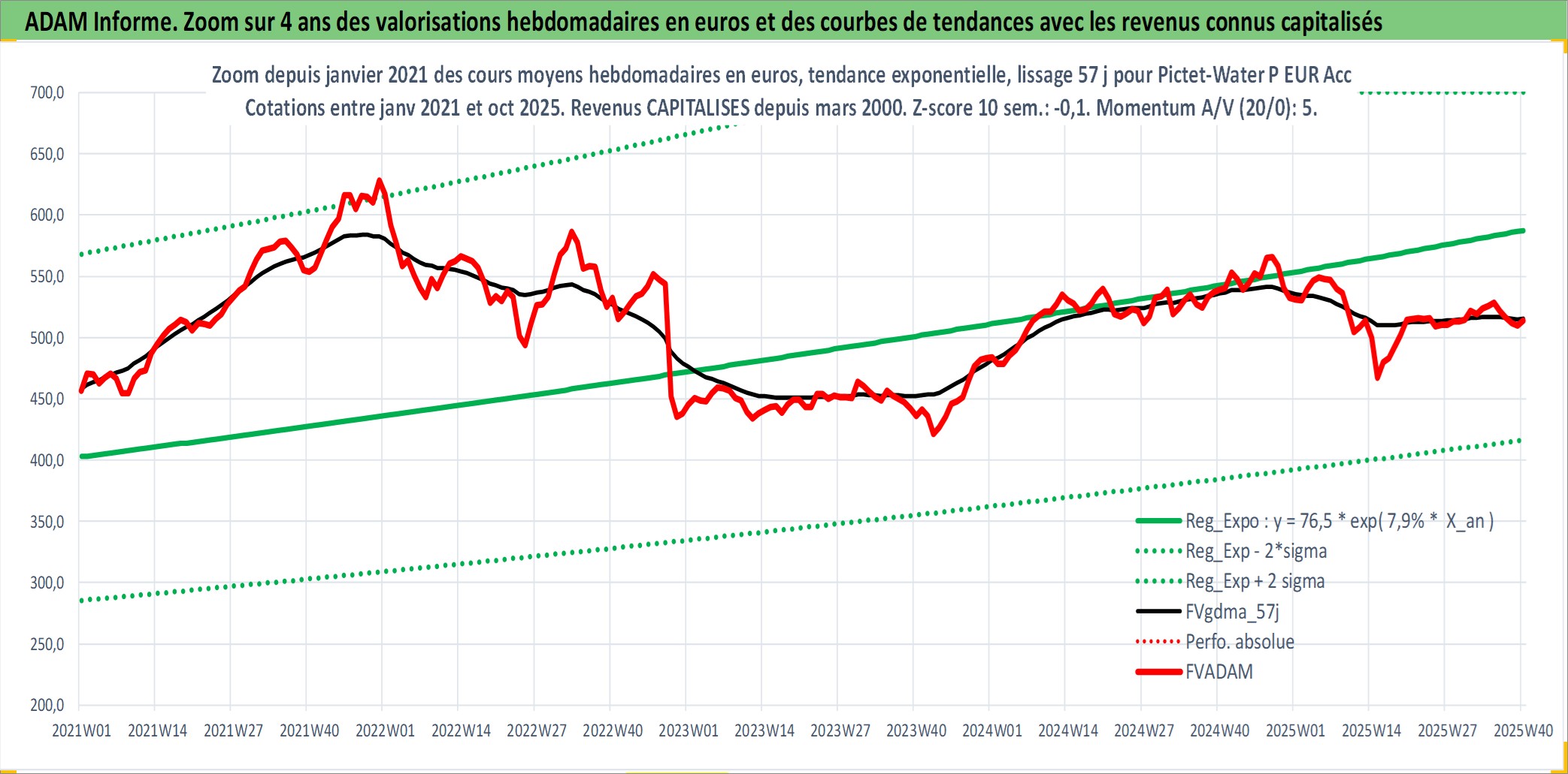 Site dédié aux investisseursPage dédiée sur site financeAnalyse des valorisations hebdomadaires du fonds Pictet-Water P EUR Acc. Cet actif est cote en EUR. Les valorisations couvrent les semaines 2000W11 a 2025W40. Les revenus de cet actif financier sont pris en compte depuis la semaine 2000W11. La note globale ESG de cet actif est estimee a 8.0 (apres rebasage entre 0 et 20).