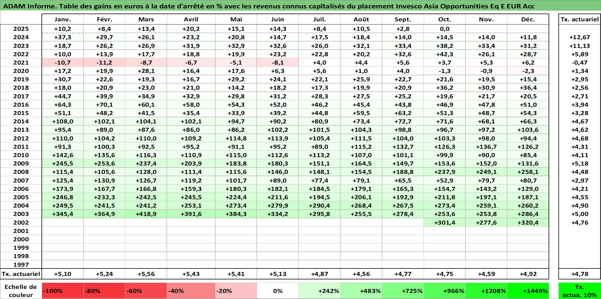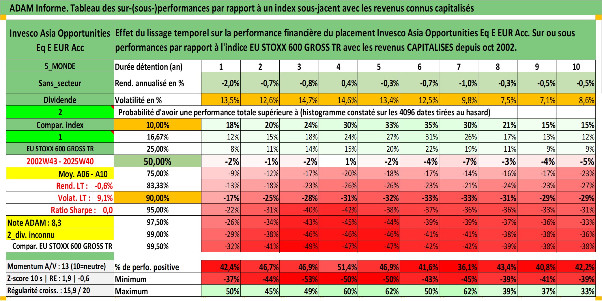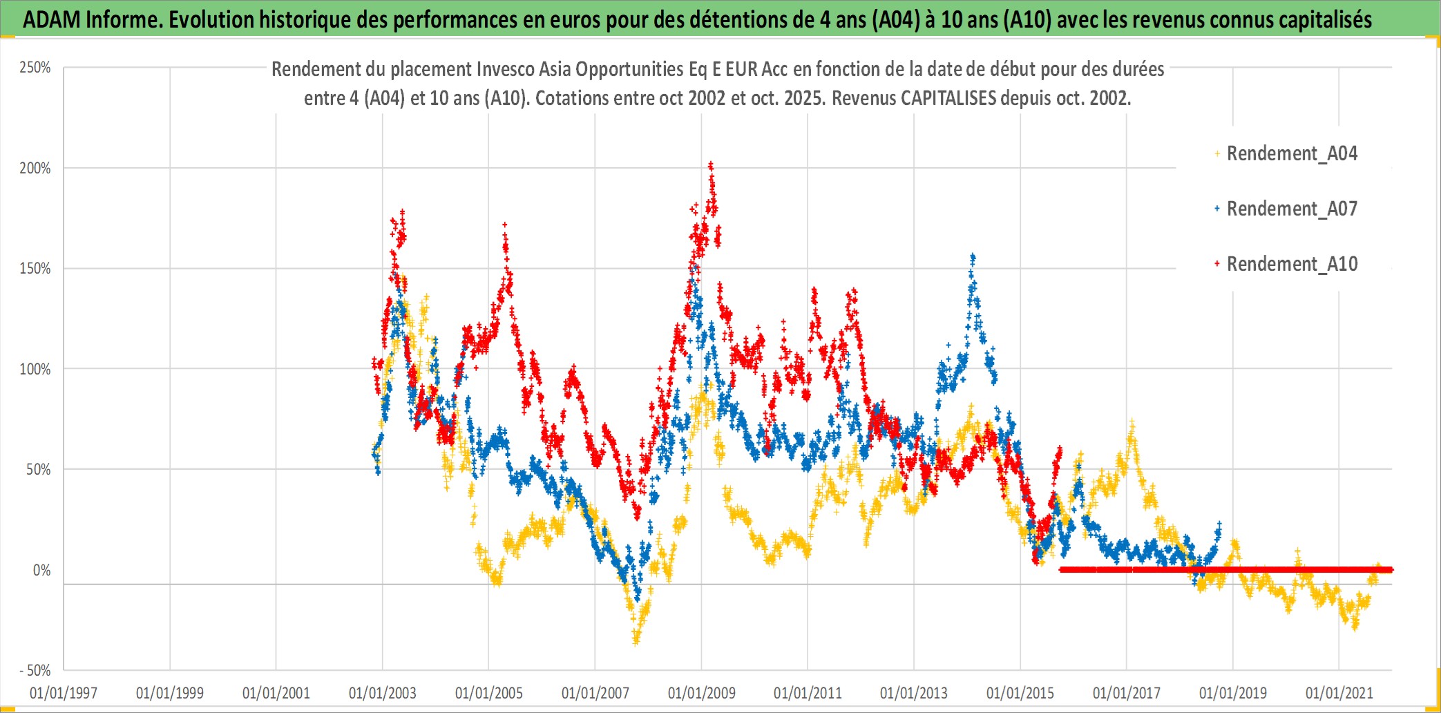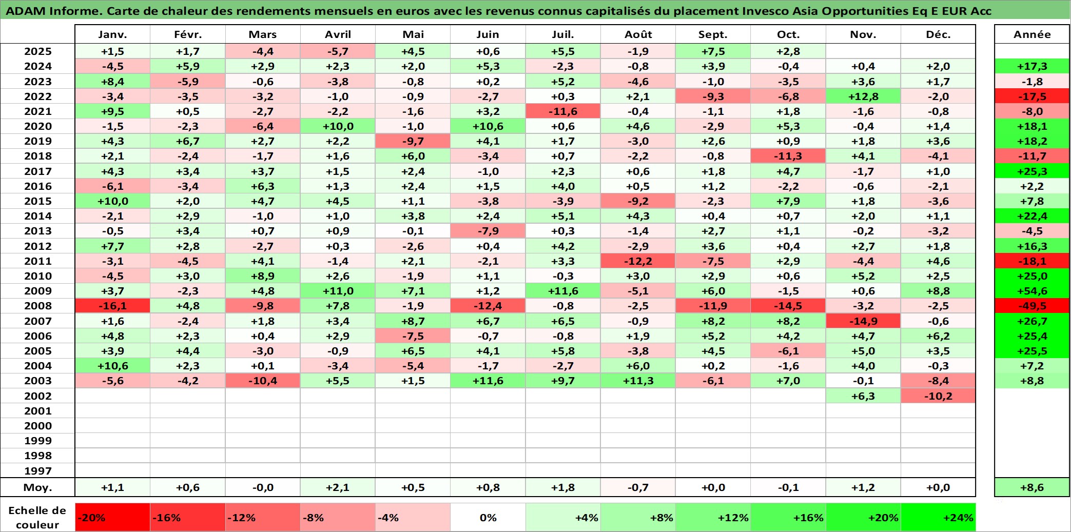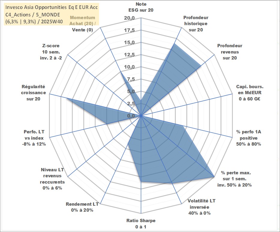 Site dédié aux investisseursPage dédiée sur site financeAnalyse des valorisations hebdomadaires du fonds Invesco Asia Opportunities Eq E EUR Acc. Cet actif est cote en EUR. Les valorisations couvrent les semaines 2002W43 a 2025W40. Les revenus de cet actif financier sont pris en compte depuis la semaine 2002W43. La note globale ESG de cet actif est estimee a 3.0 (apres rebasage entre 0 et 20).