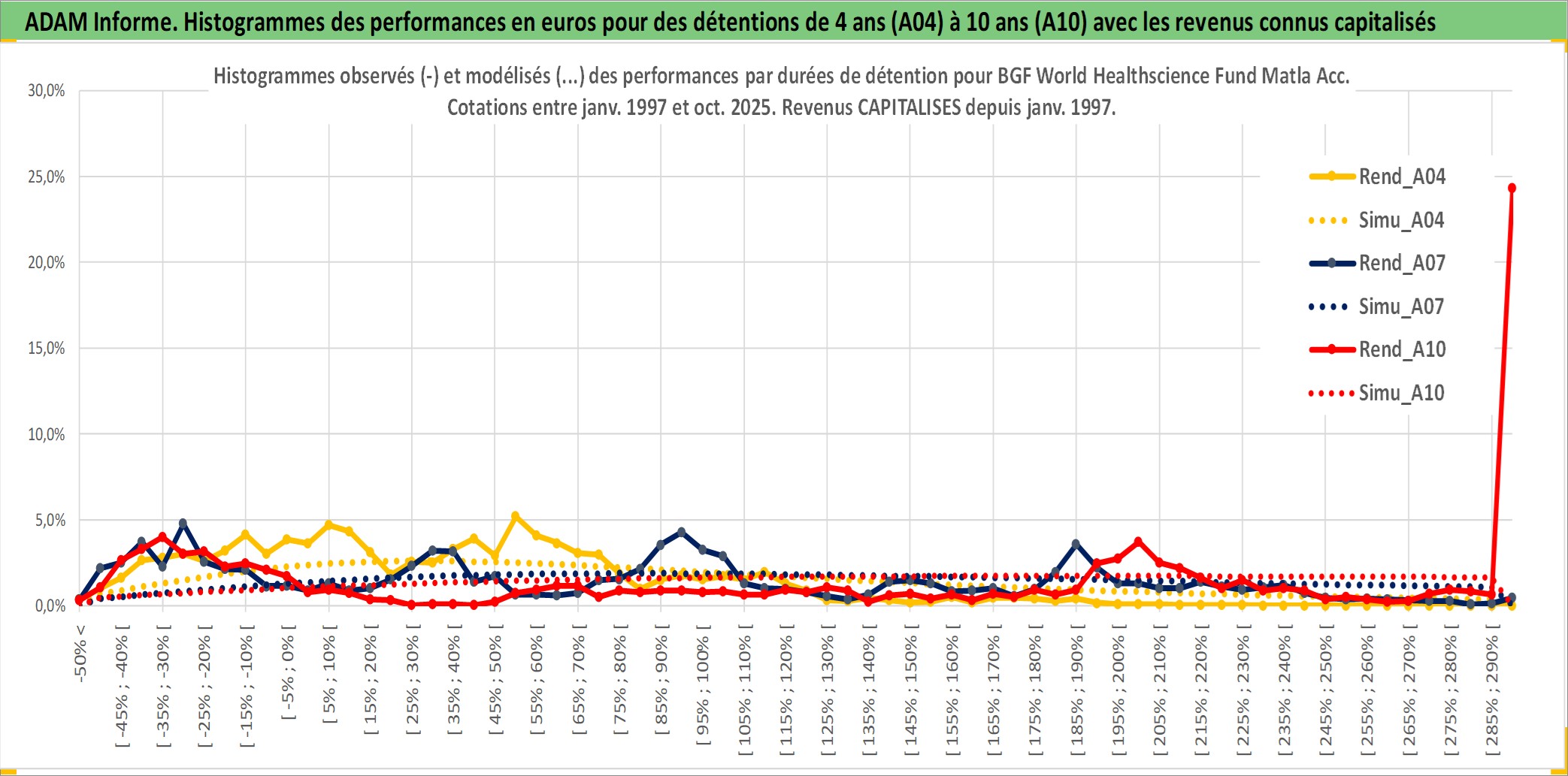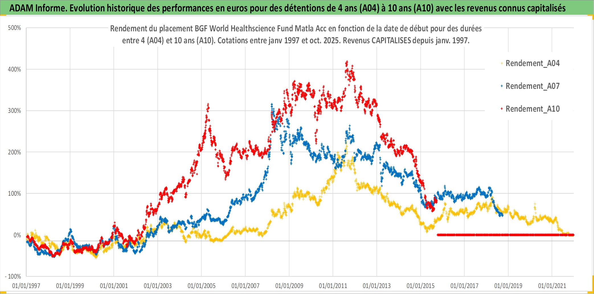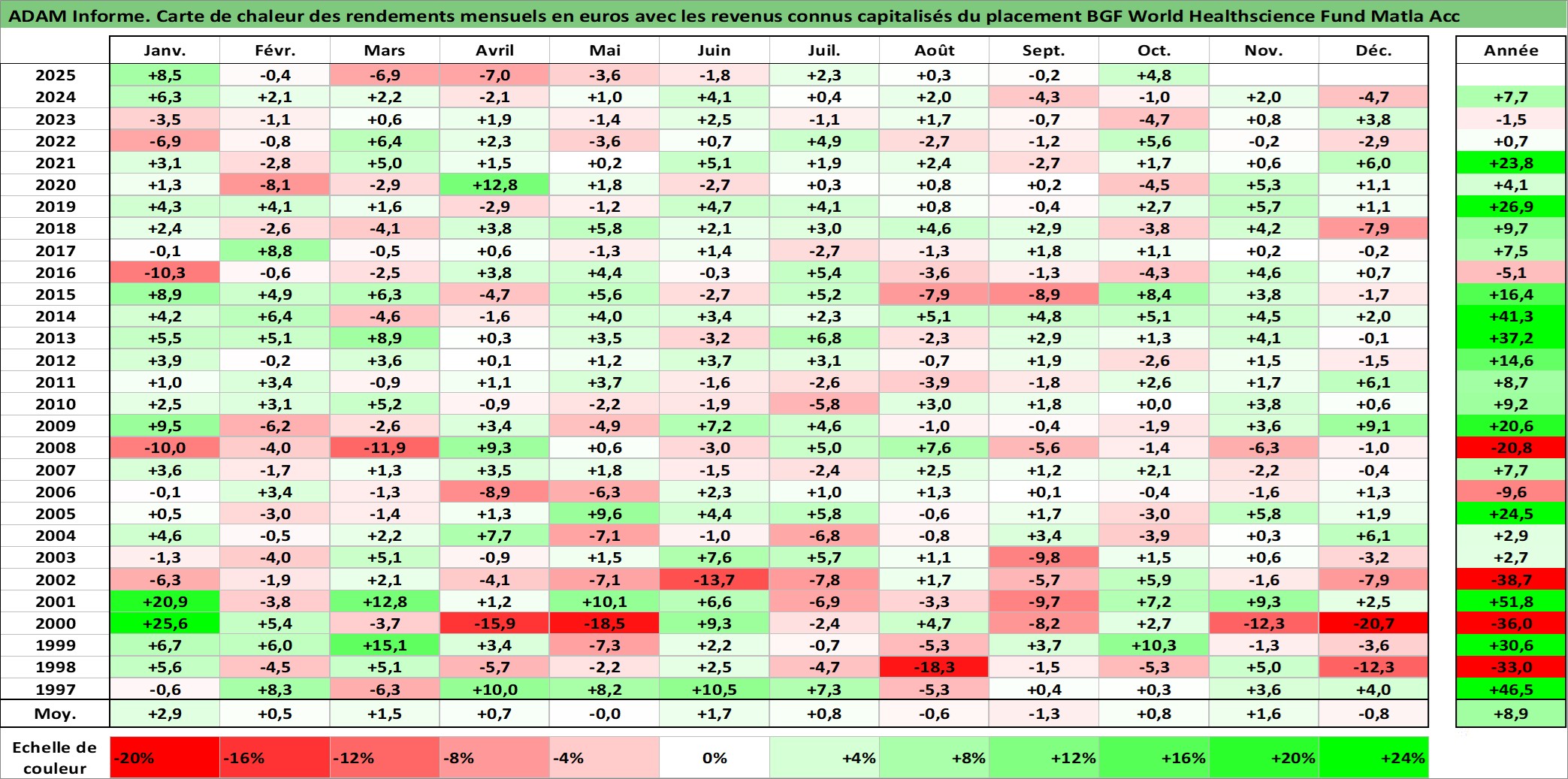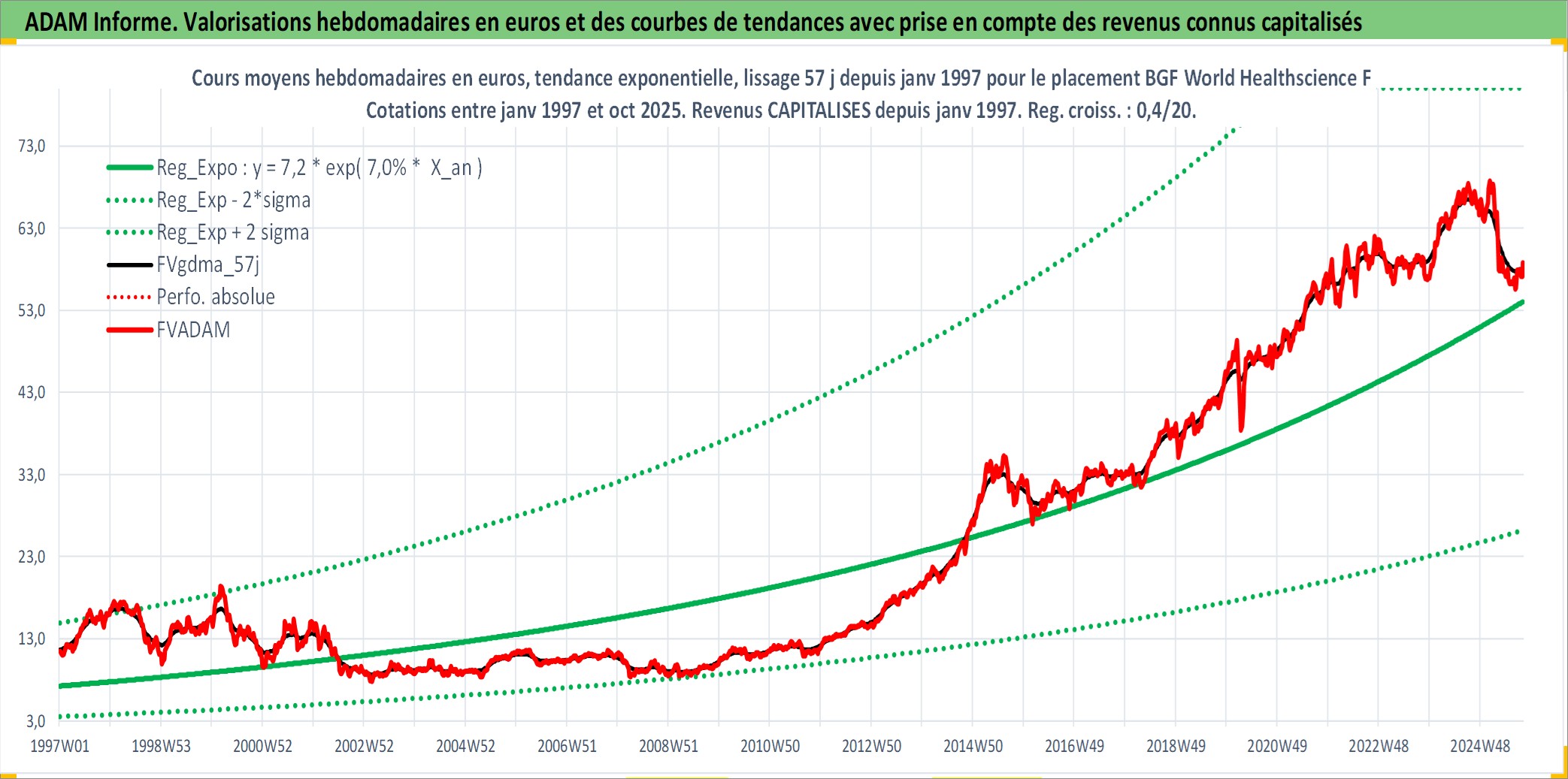 Site dédié aux investisseursPage dédiée sur site financeAnalyse des valorisations hebdomadaires du fonds BGF World Healthscience Fund Matla Acc. Cet actif est cote en USD. Les valorisations sont en contrevaleur EURO et couvrent les semaines 1997W01 a 2025W40. Les revenus de cet actif financier sont pris en compte depuis la semaine 1997W01. La note globale ESG de cet actif est estimee a 7.1 (apres rebasage entre 0 et 20).