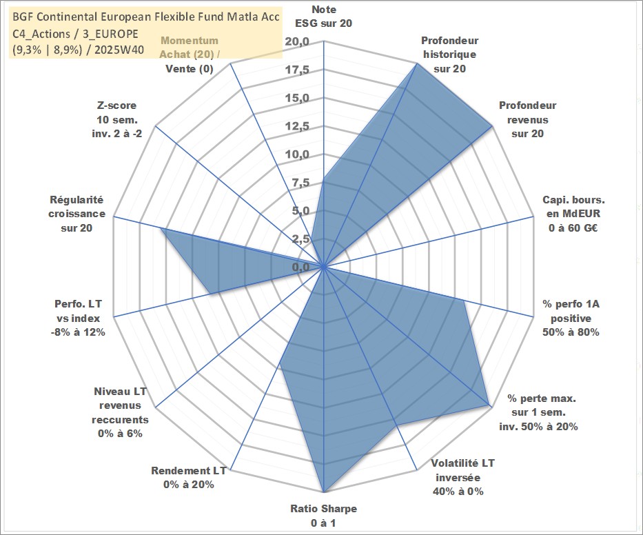 Site dédié aux investisseursPage dédiée sur site financeAnalyse des valorisations hebdomadaires du fonds BGF Continental European Flexible Fund Matla Acc. Cet actif est cote en EUR. Les valorisations couvrent les semaines 1997W01 a 2025W40. Les revenus de cet actif financier sont pris en compte depuis la semaine 1997W01. La note globale ESG de cet actif est estimee a 7.9 (apres rebasage entre 0 et 20).