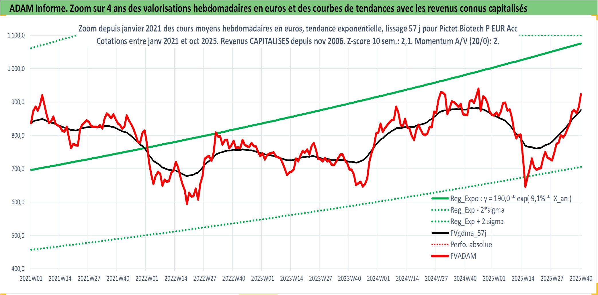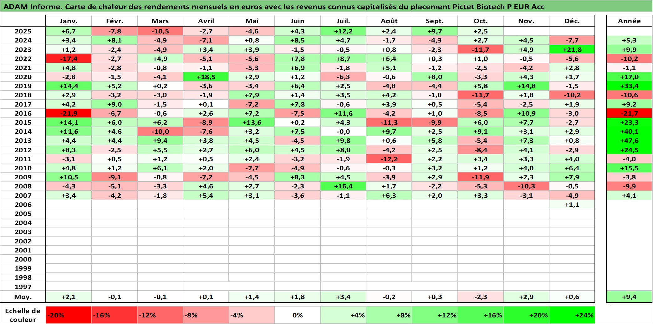 Site dédié aux investisseursPage dédiée sur site financeAnalyse des valorisations hebdomadaires du fonds Pictet Biotech P EUR Acc. Cet actif est cote en EUR. Les valorisations couvrent les semaines 2006W47 a 2025W40. Les revenus de cet actif financier sont pris en compte depuis la semaine 2006W47. La note globale ESG de cet actif est estimee a 5.0 (apres rebasage entre 0 et 20).