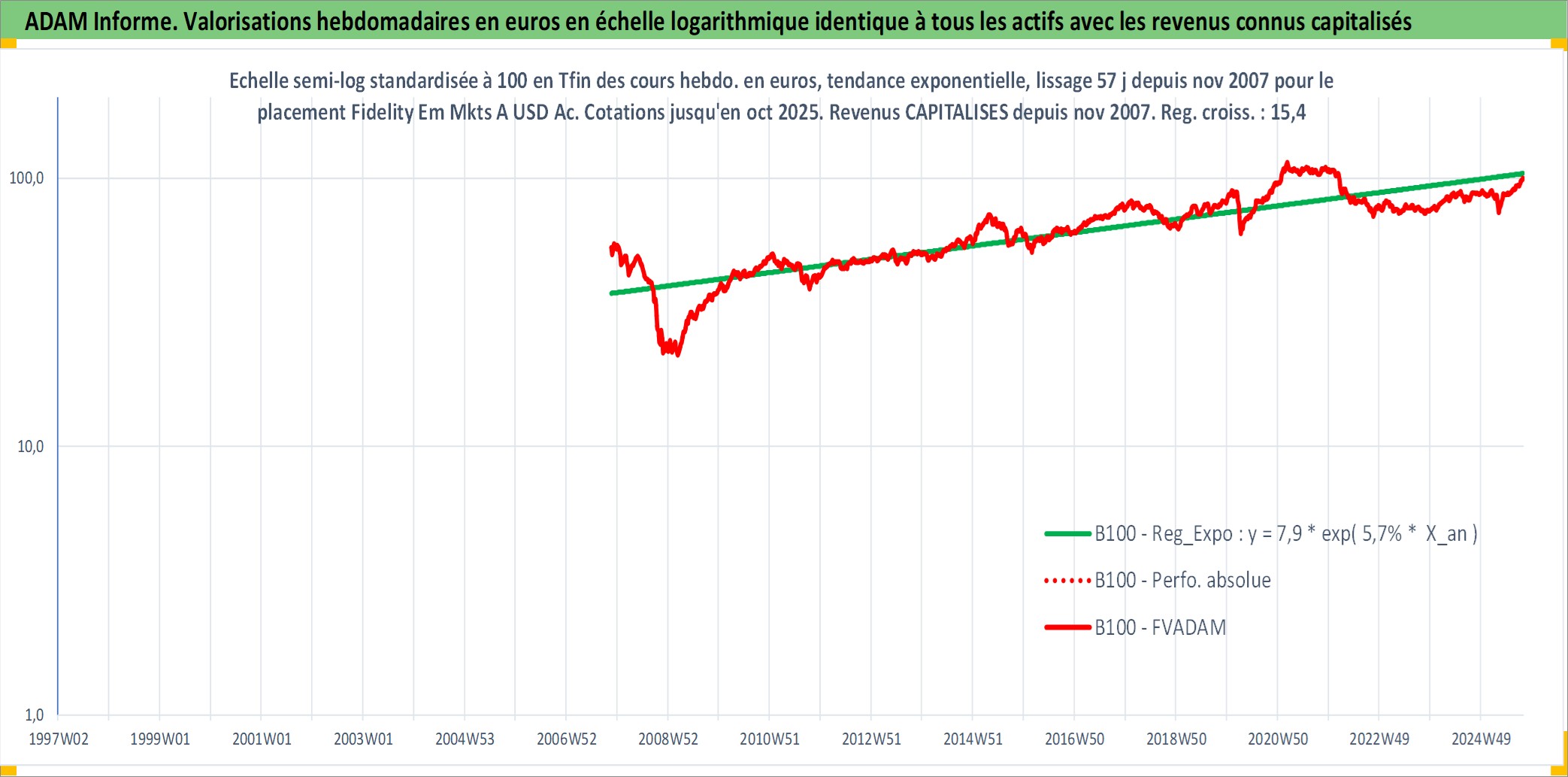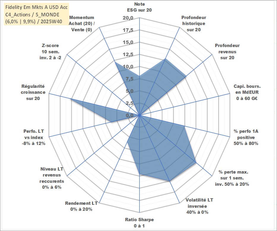 Site dédié aux investisseursPage dédiée sur site financeAnalyse des valorisations hebdomadaires du fonds Fidelity Em Mkts A USD Acc. Cet actif est cote en USD. Les valorisations sont en contrevaleur EURO et couvrent les semaines 2007W46 a 2025W40. Les revenus de cet actif financier sont pris en compte depuis la semaine 2007W46. La note globale ESG de cet actif est estimee a 8.0 (apres rebasage entre 0 et 20).
