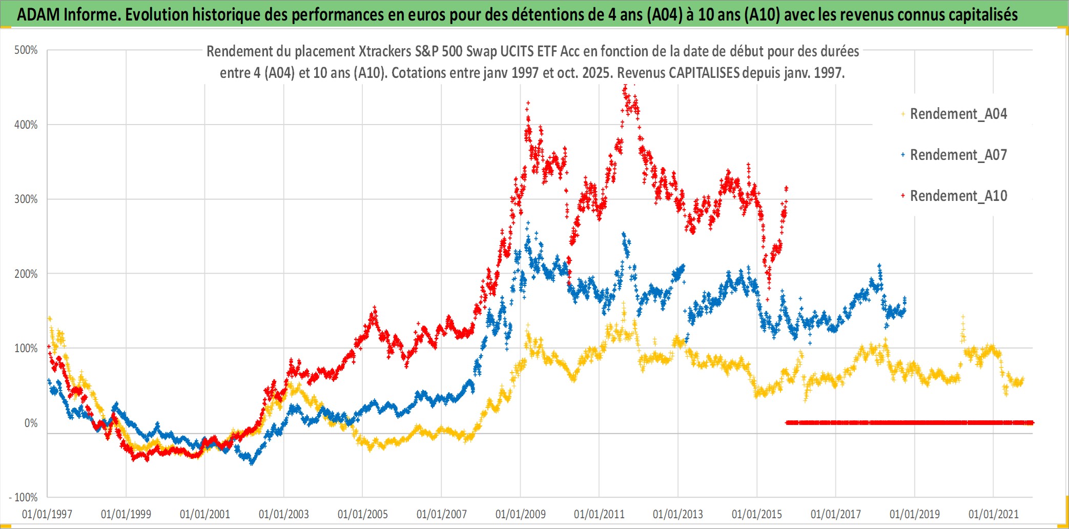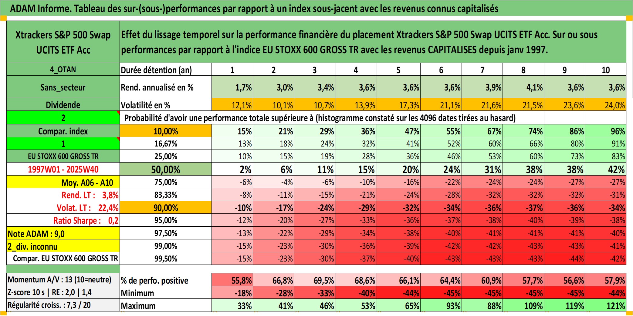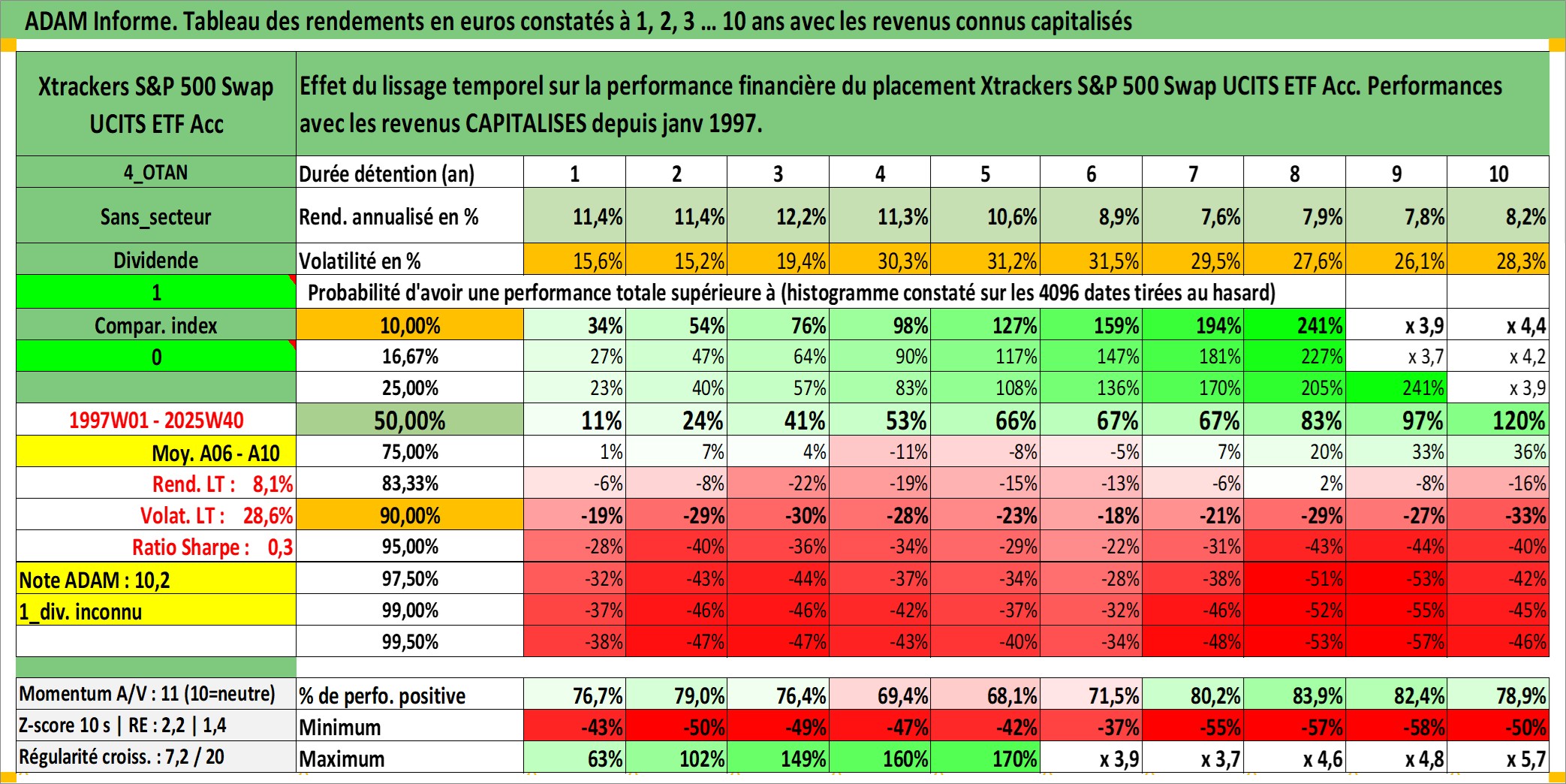 Site dédié aux investisseursPage dédiée sur site financeAnalyse des valorisations hebdomadaires du fonds Xtrackers S&P 500 Swap UCITS ETF Acc. Cet actif est cote en USD. Les valorisations sont en contrevaleur EURO et couvrent les semaines 1997W01 a 2025W40. Les revenus de cet actif financier sont pris en compte depuis la semaine 1997W01. La note ESG de cet actif n'est pas connue.