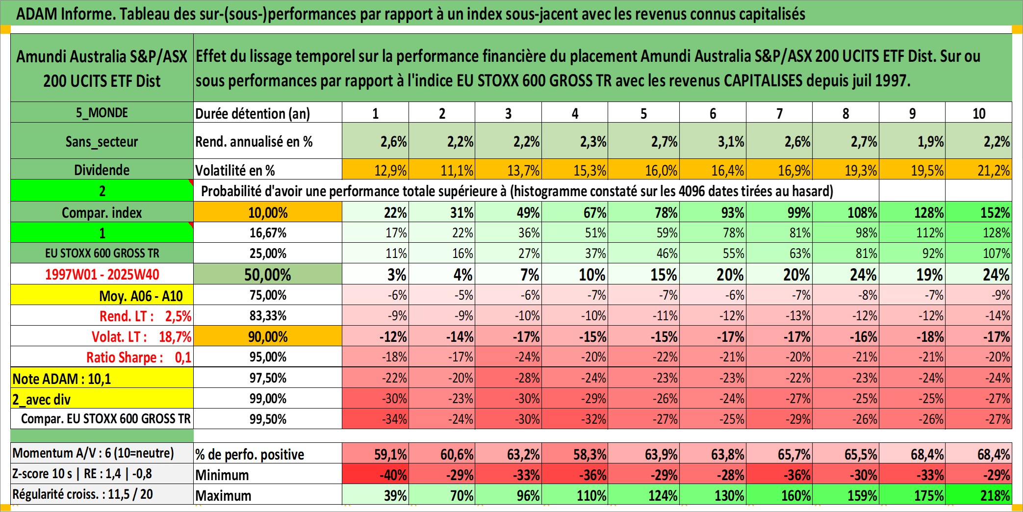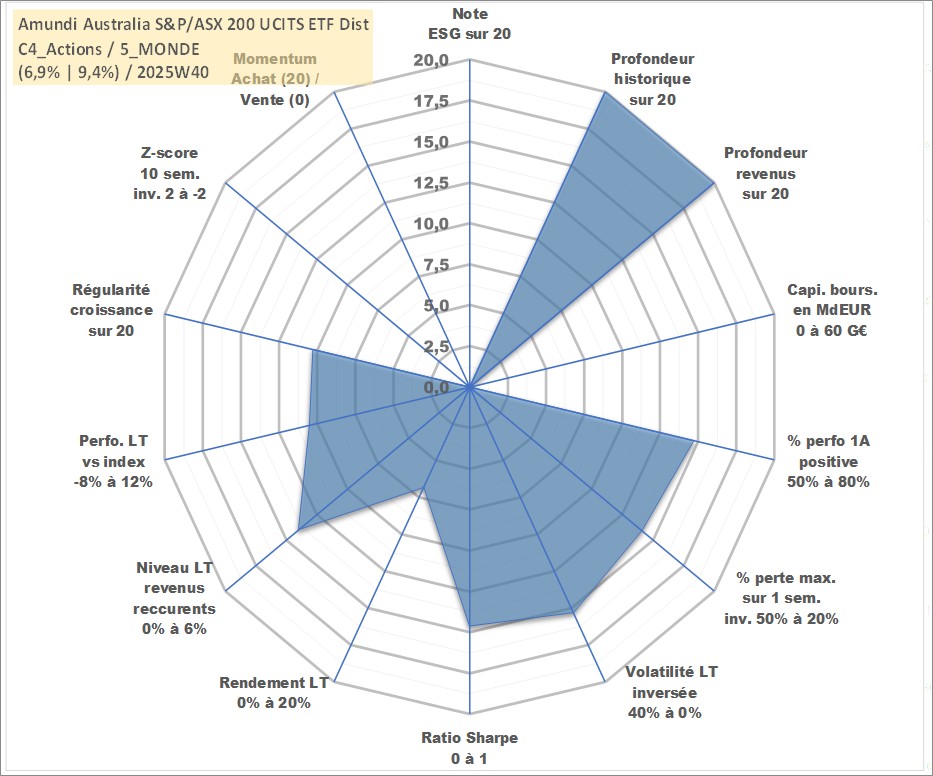 Site dédié aux investisseursPage dédiée sur site financeAnalyse des valorisations hebdomadaires du fonds Amundi Australia S&P/ASX 200 UCITS ETF Dist. Cet actif est cote en EUR. Les valorisations couvrent les semaines 1997W01 a 2025W40. Les revenus de cet actif financier sont pris en compte depuis la semaine 1997W28. La note ESG de cet actif n'est pas connue.