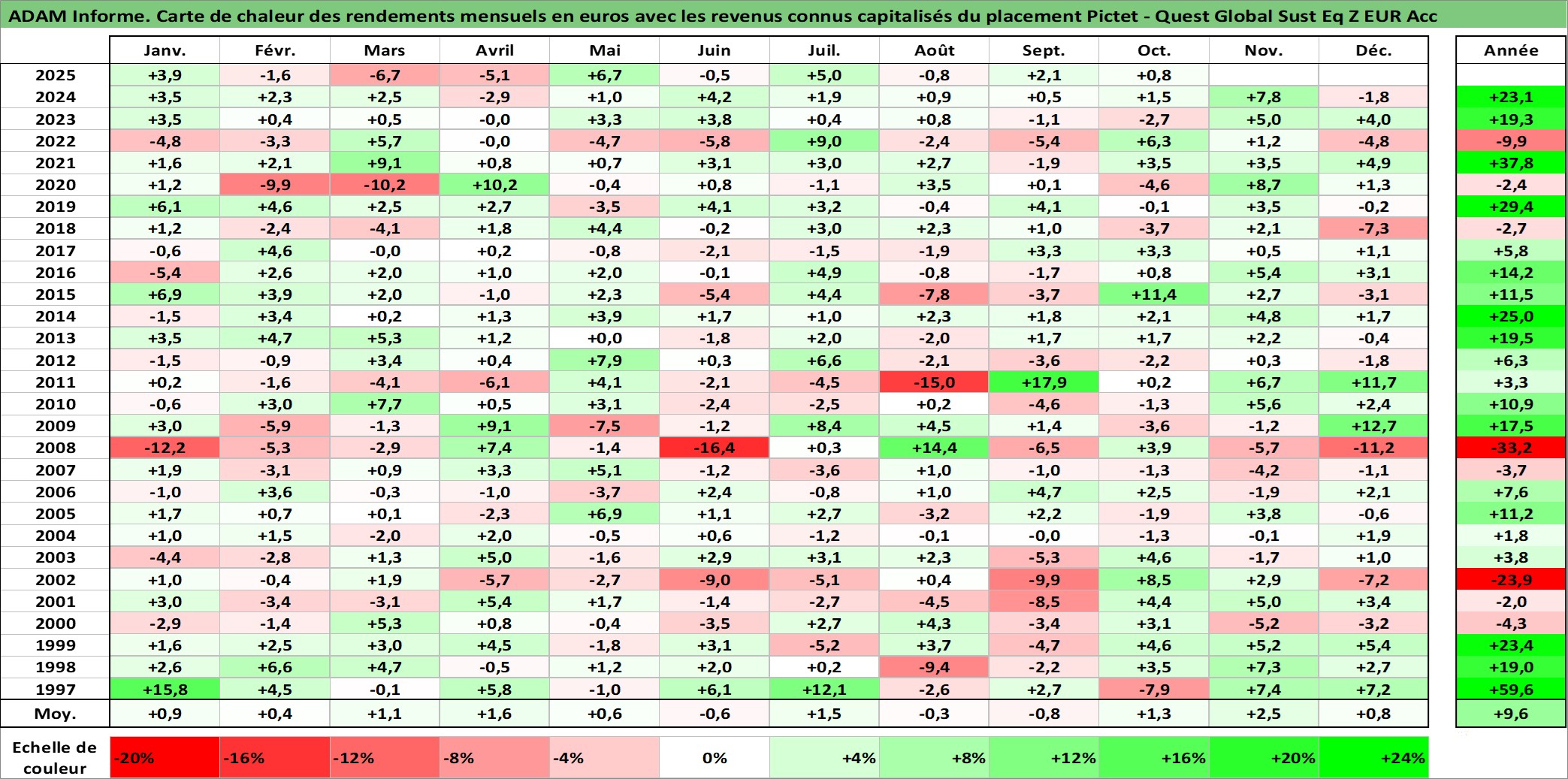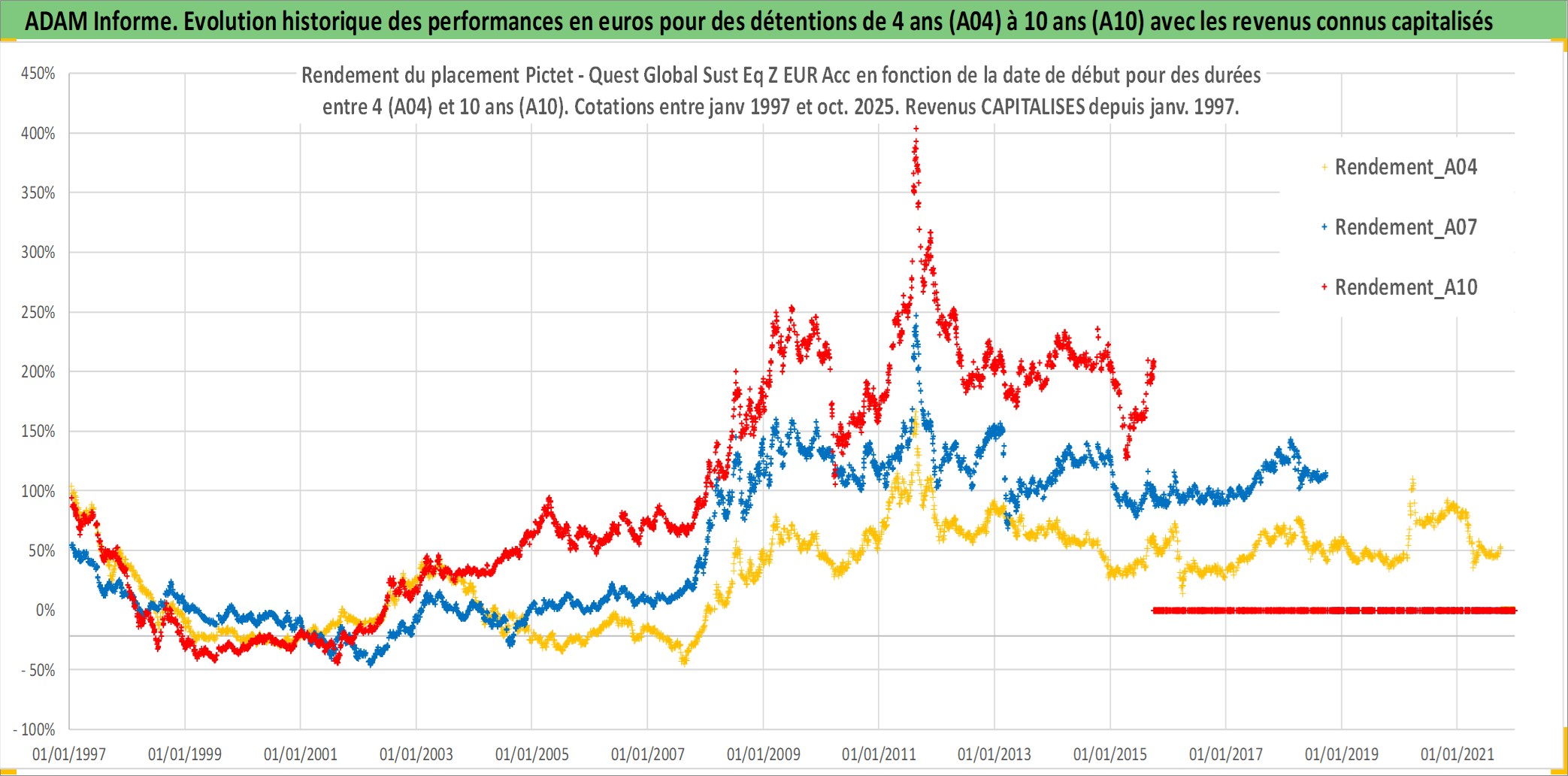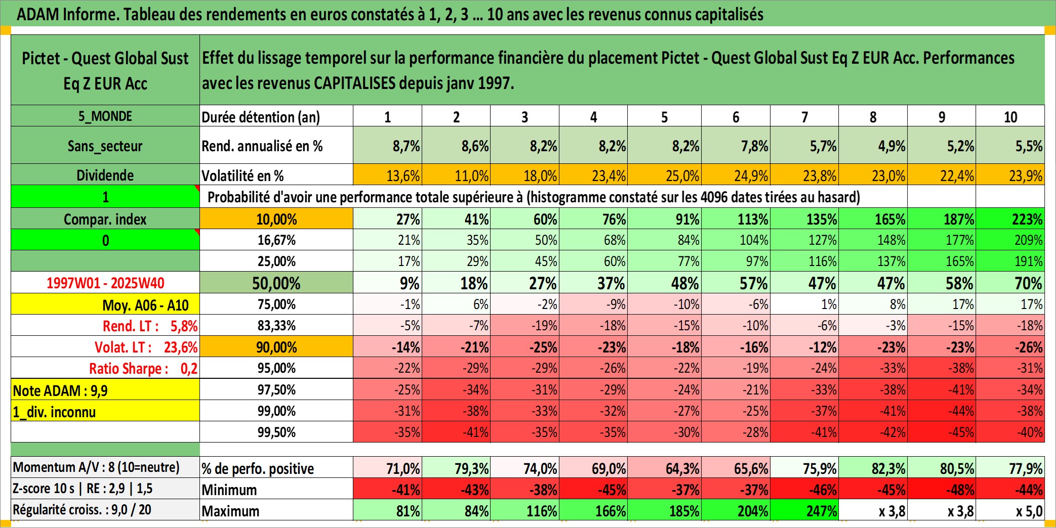 Site dédié aux investisseursPage dédiée sur site financeAnalyse des valorisations hebdomadaires du fonds Pictet - Quest Global Sust Eq Z EUR Acc. Cet actif est cote en EUR. Les valorisations couvrent les semaines 1997W01 a 2025W40. Les revenus de cet actif financier sont pris en compte depuis la semaine 1997W01. La note ESG de cet actif n'est pas connue.