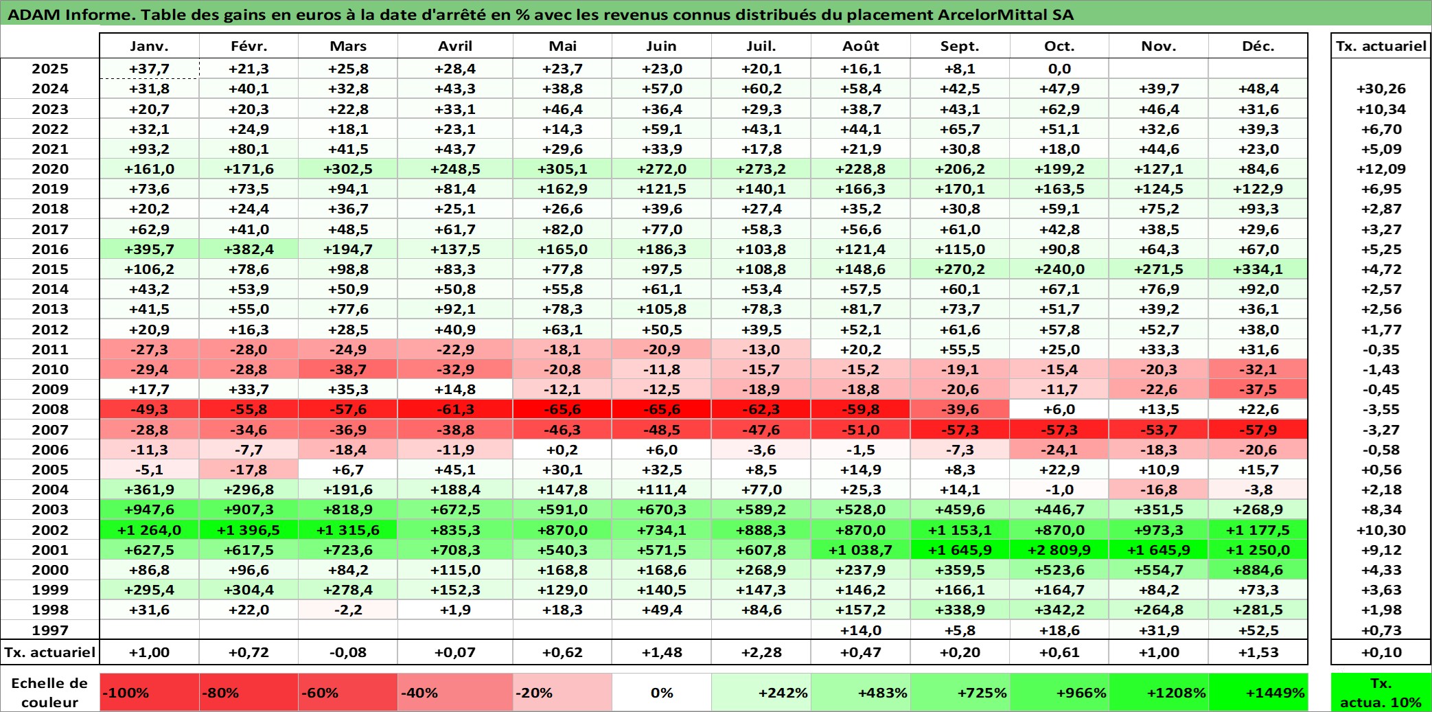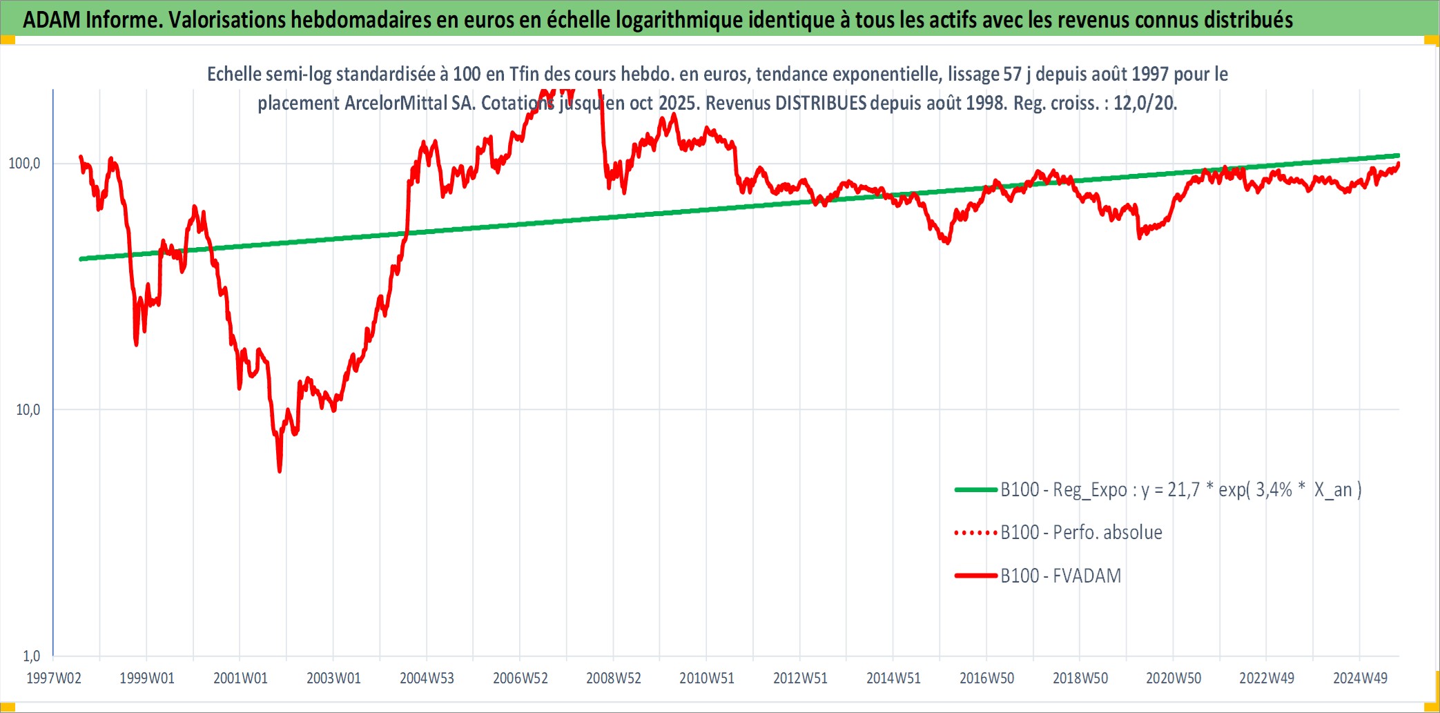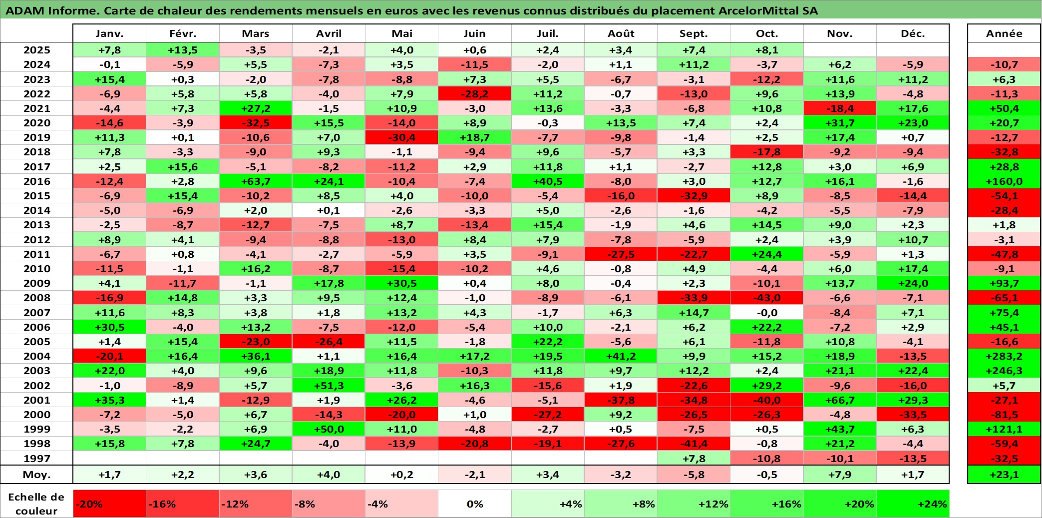 Site dédié aux investisseursPage dédiée sur site financeAnalyse des valorisations hebdomadaires de l'action ArcelorMittal SA. Cet actif est cote en EUR. Les valorisations couvrent les semaines 1997W32 a 2025W40. Les revenus de cet actif financier sont pris en compte depuis la semaine 1998W34. La note globale ESG de cet actif est estimee a 3.0 (apres rebasage entre 0 et 20).