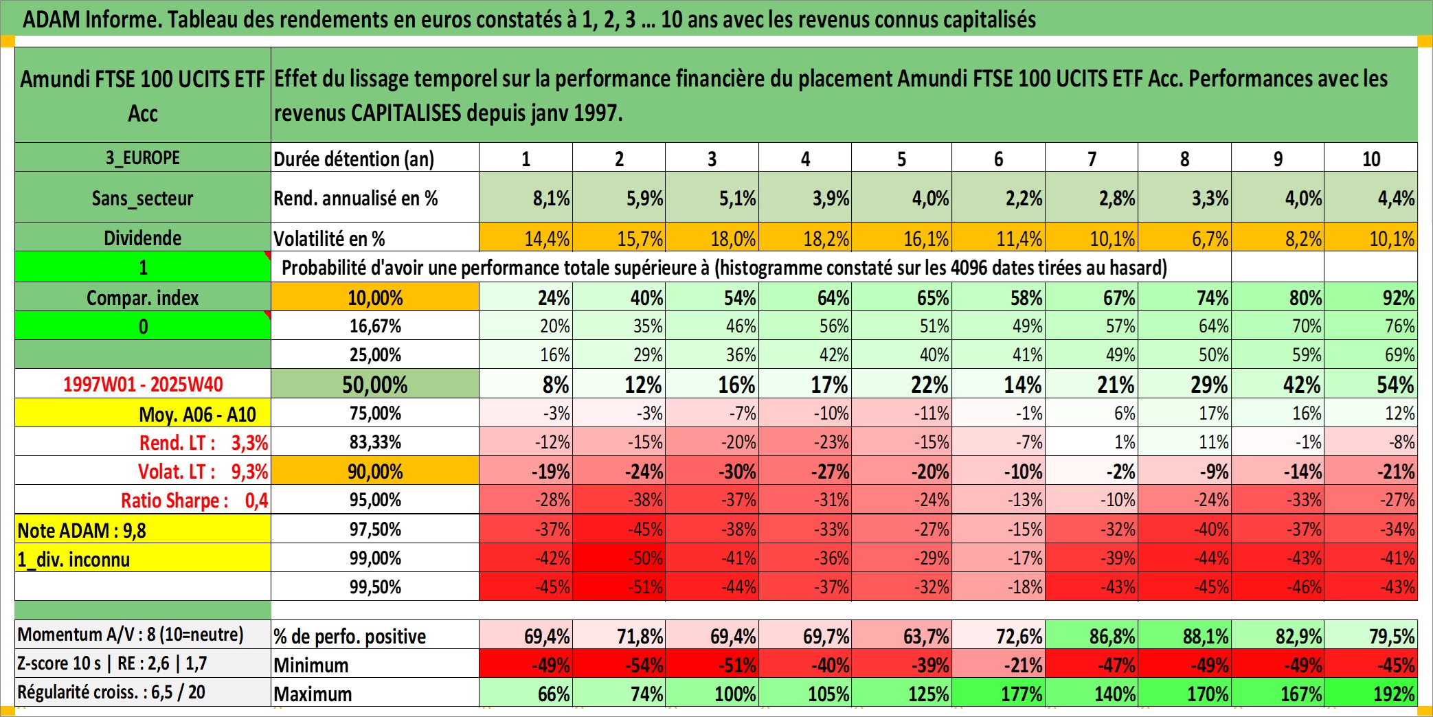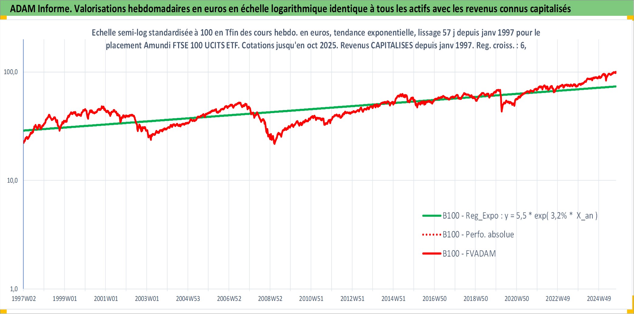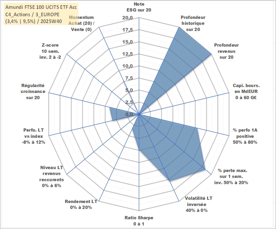Site dédié aux investisseursPage dédiée sur site financeAnalyse des valorisations hebdomadaires du fonds Amundi FTSE 100 UCITS ETF Acc. Cet actif est cote en GBX. Les valorisations sont en contrevaleur EURO et couvrent les semaines 1997W01 a 2025W40. Les revenus de cet actif financier sont pris en compte depuis la semaine 1997W01. La note ESG de cet actif n'est pas connue.