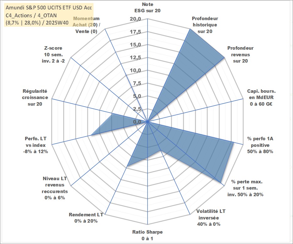 Site dédié aux investisseursPage dédiée sur site financeAnalyse des valorisations hebdomadaires du fonds Amundi S&P 500 UCITS ETF USD Acc. Cet actif est cote en USD. Les valorisations sont en contrevaleur EURO et couvrent les semaines 1997W01 a 2025W40. Les revenus de cet actif financier sont pris en compte depuis la semaine 1997W01. La note ESG de cet actif n'est pas connue.