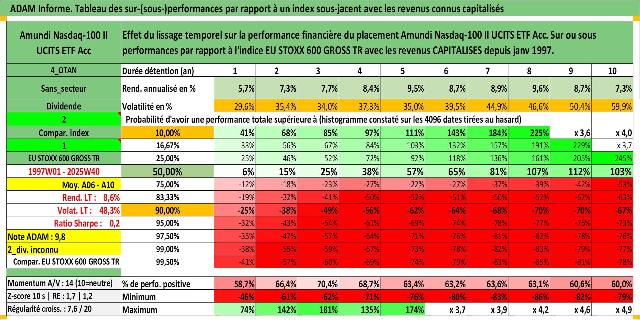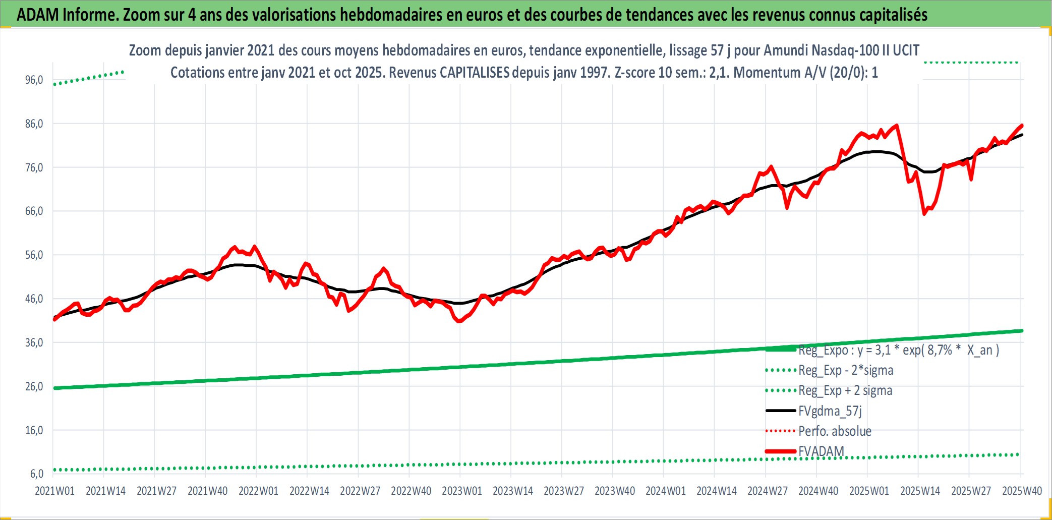 Site dédié aux investisseursPage dédiée sur site financeAnalyse des valorisations hebdomadaires du fonds Amundi Nasdaq-100 II UCITS ETF Acc. Cet actif est cote en USD. Les valorisations sont en contrevaleur EURO et couvrent les semaines 1997W01 a 2025W40. Les revenus de cet actif financier sont pris en compte depuis la semaine 1997W01. La note ESG de cet actif n'est pas connue.