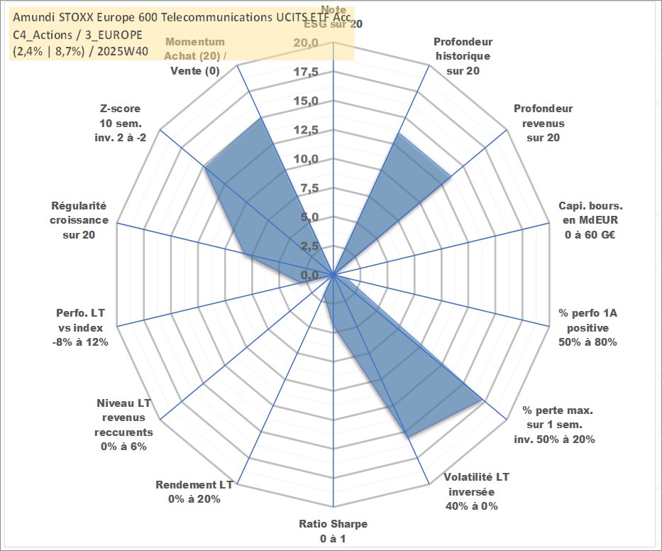 Site dédié aux investisseursPage dédiée sur site financeAnalyse des valorisations hebdomadaires du fonds Amundi STOXX Europe 600 Telecommunications UCITS ETF Acc. Cet actif est cote en EUR. Les valorisations couvrent les semaines 2006W40 a 2025W40. Les revenus de cet actif financier sont pris en compte depuis la semaine 2006W40. La note ESG de cet actif n'est pas connue.