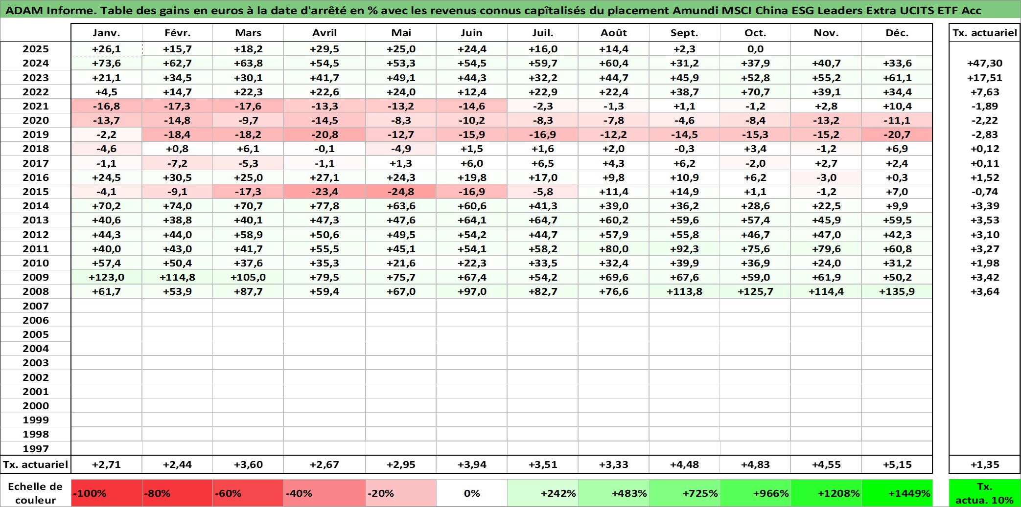 Site dédié aux investisseursPage dédiée sur site financeAnalyse des valorisations hebdomadaires du fonds Amundi MSCI China ESG Leaders Extra UCITS ETF Acc. Cet actif est cote en USD. Les valorisations sont en contrevaleur EURO et couvrent les semaines 2008W02 a 2025W40. Les revenus de cet actif financier sont pris en compte depuis la semaine 2008W02. La note ESG de cet actif n'est pas connue.