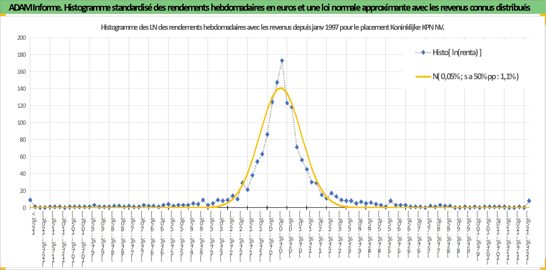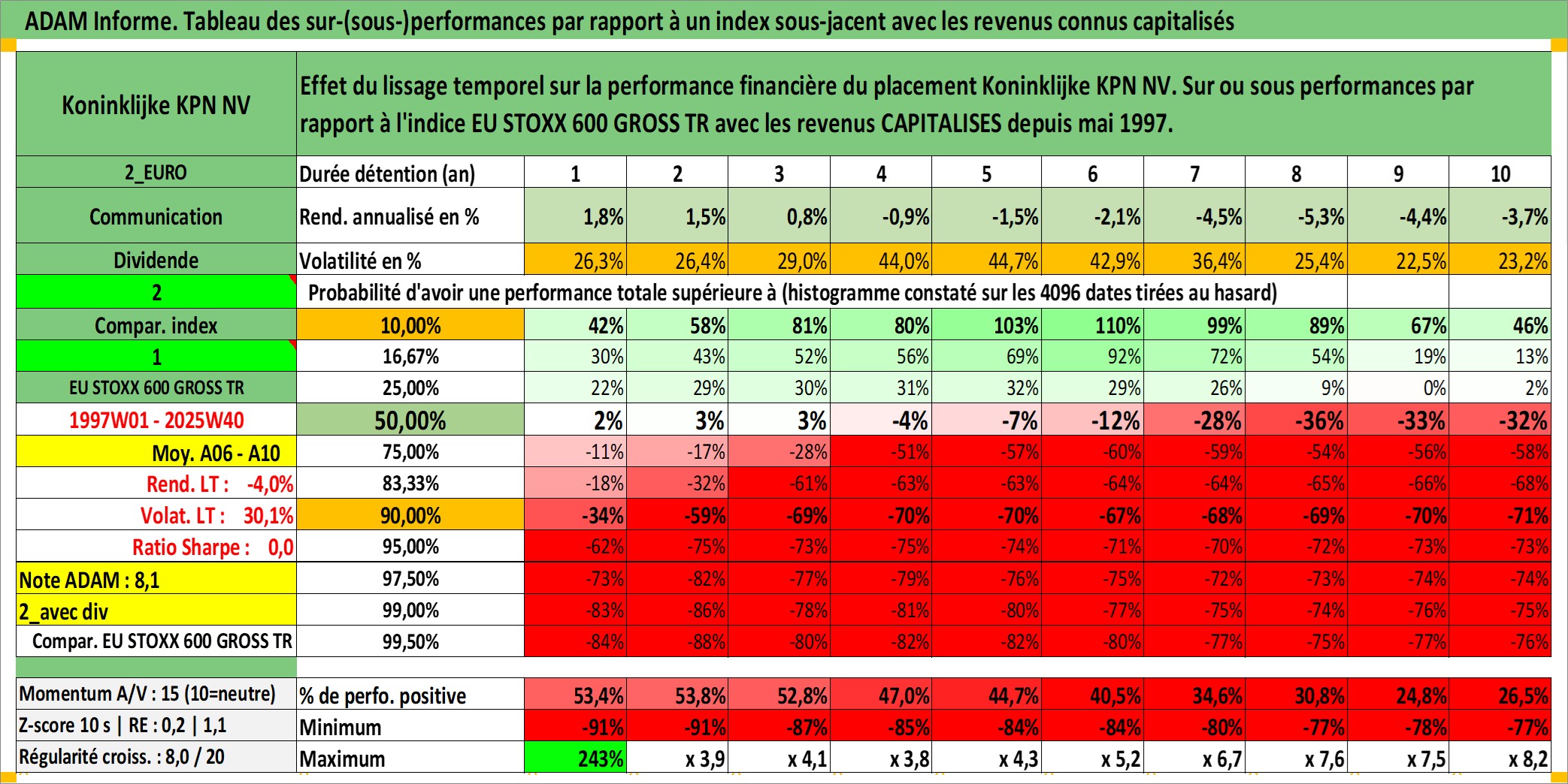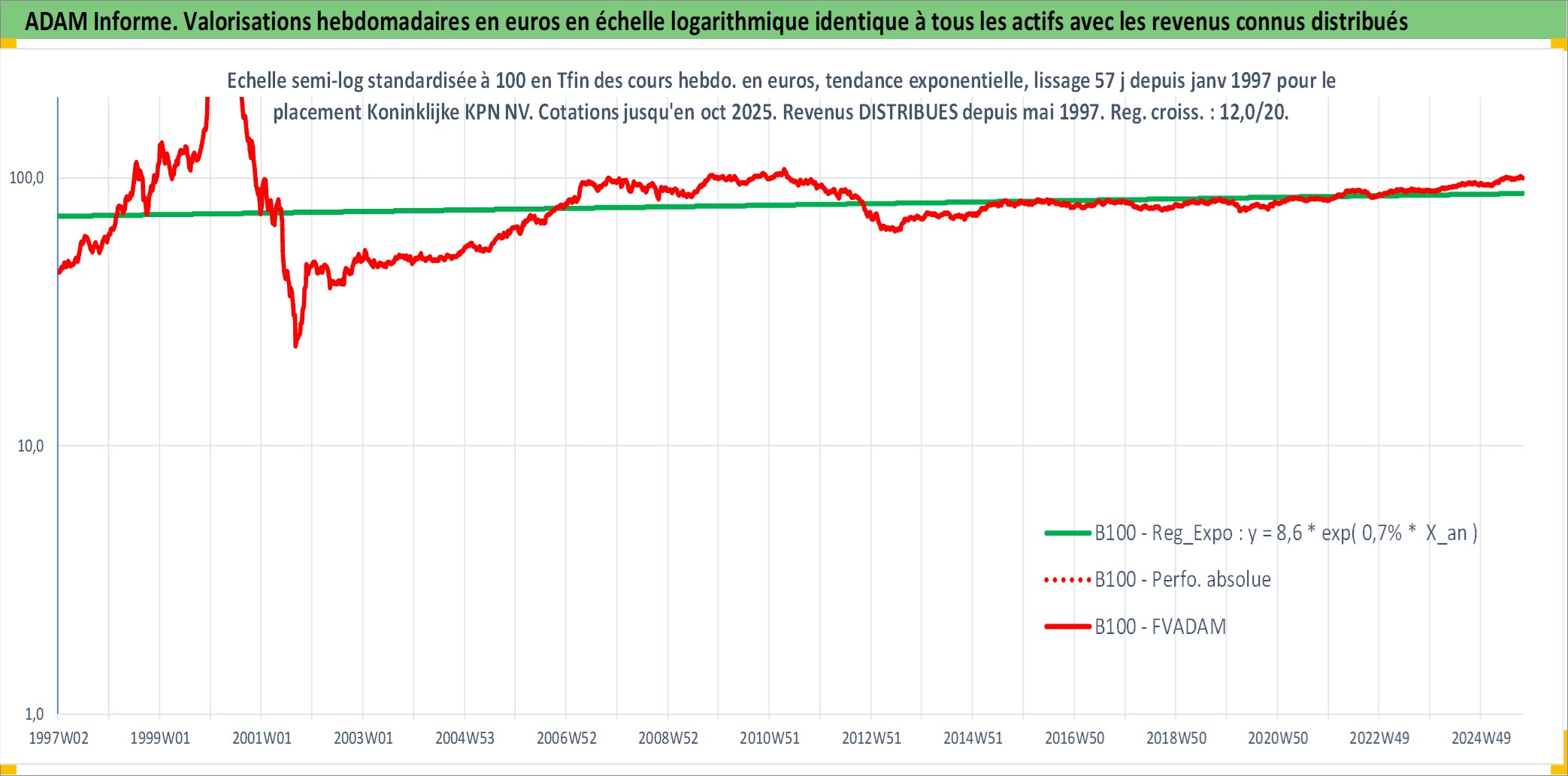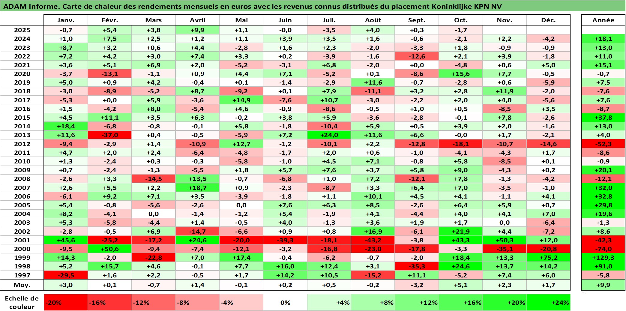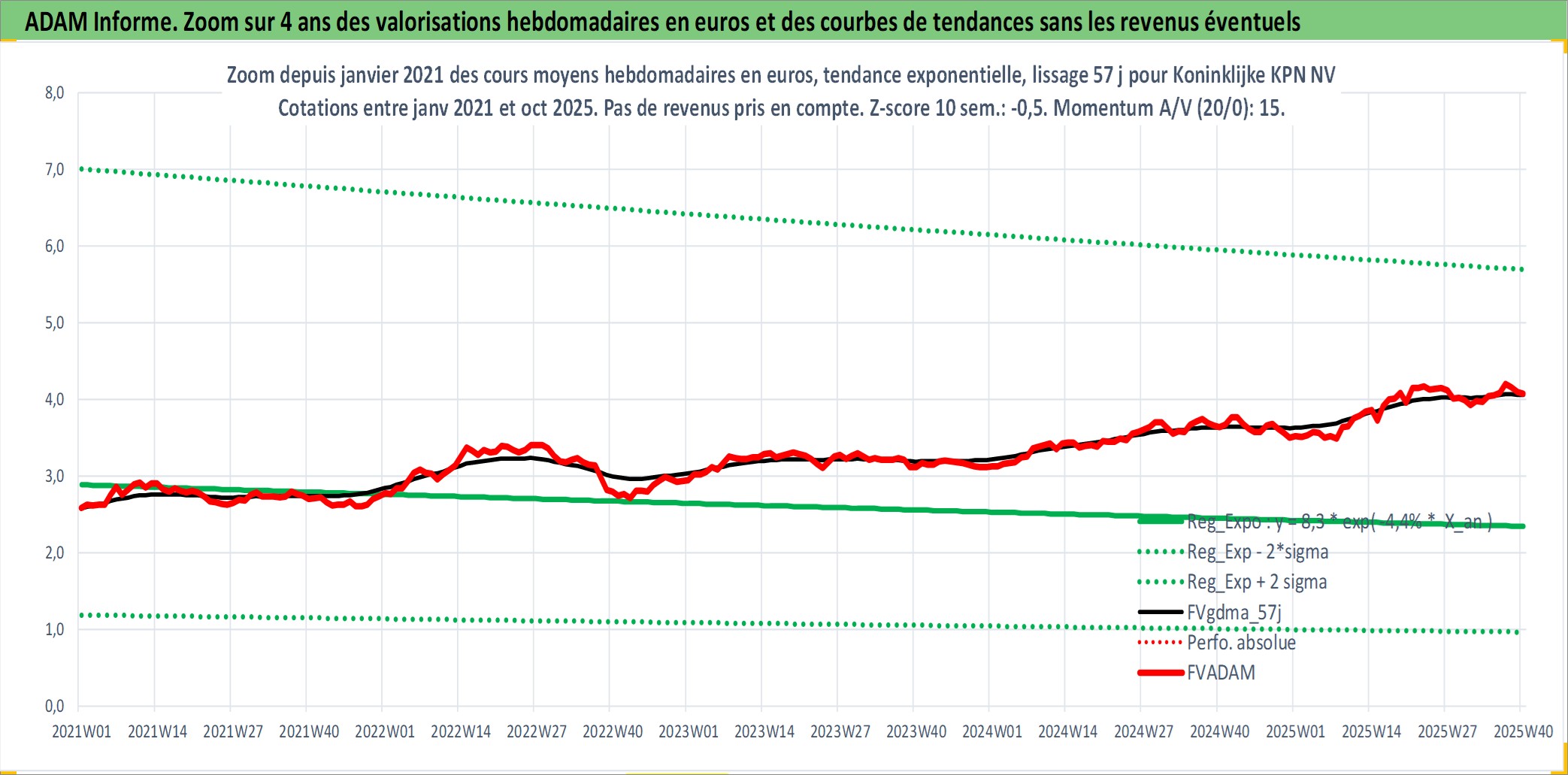 Site dédié aux investisseursPage dédiée sur site financeAnalyse des valorisations hebdomadaires de l'action Koninklijke KPN NV. Cet actif est cote en EUR. Les valorisations couvrent les semaines 1997W01 a 2025W40. Les revenus de cet actif financier sont pris en compte depuis la semaine 1997W19. La note globale ESG de cet actif est estimee a 11.0 (apres rebasage entre 0 et 20).