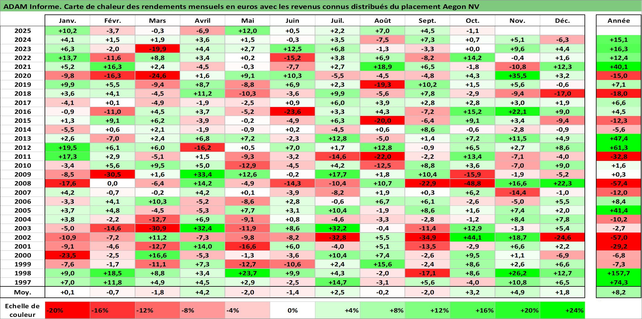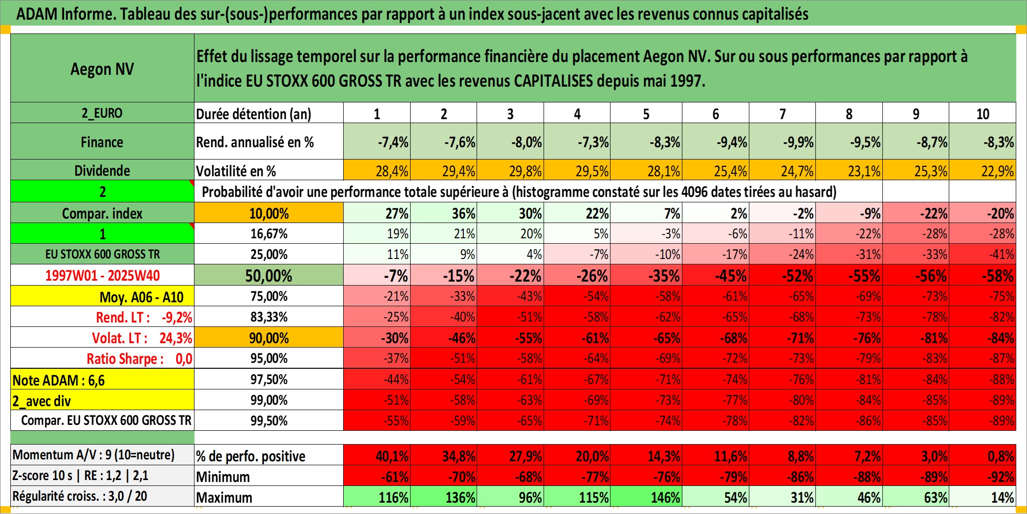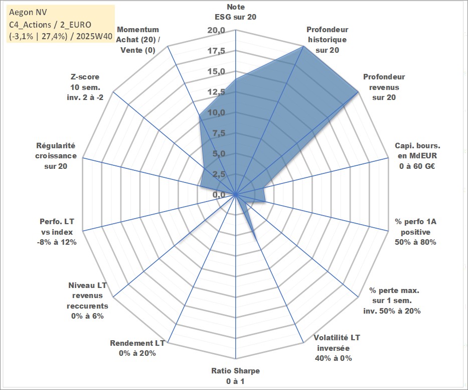 Site dédié aux investisseursPage dédiée sur site financeAnalyse des valorisations hebdomadaires de l'action Aegon NV. Cet actif est cote en EUR. Les valorisations couvrent les semaines 1997W01 a 2025W40. Les revenus de cet actif financier sont pris en compte depuis la semaine 1997W20. La note globale ESG de cet actif est estimee a 14.0 (apres rebasage entre 0 et 20).
