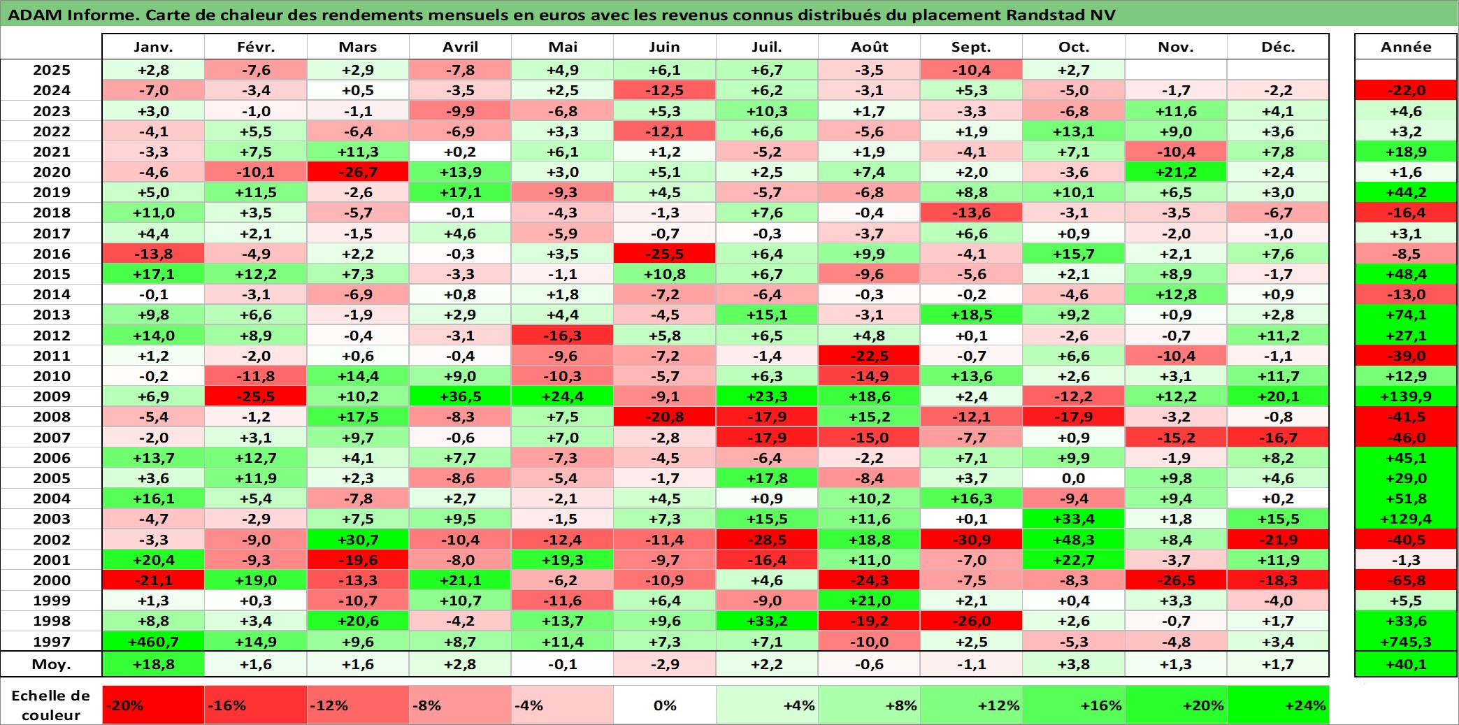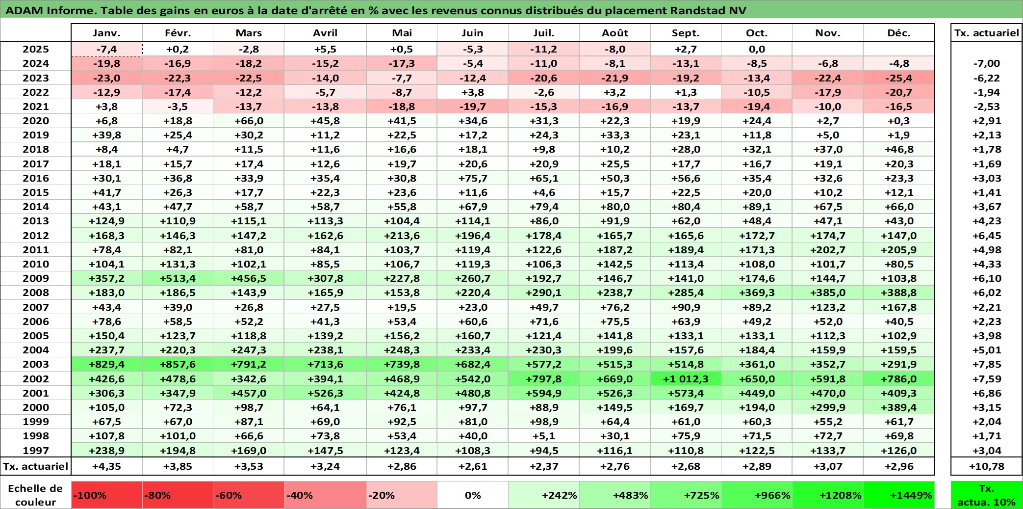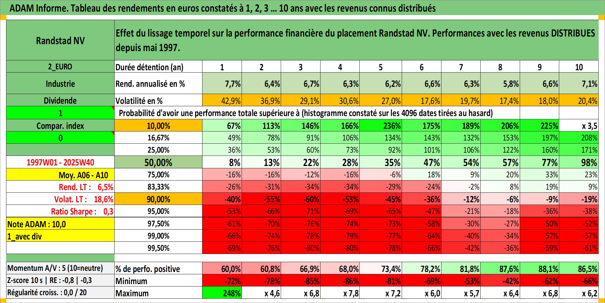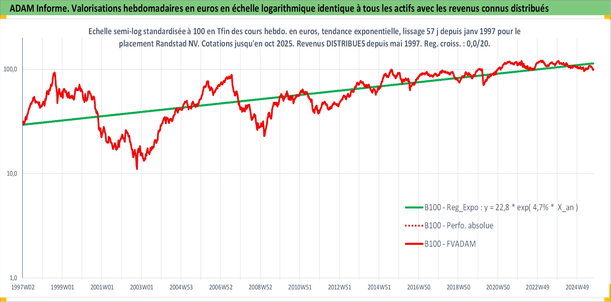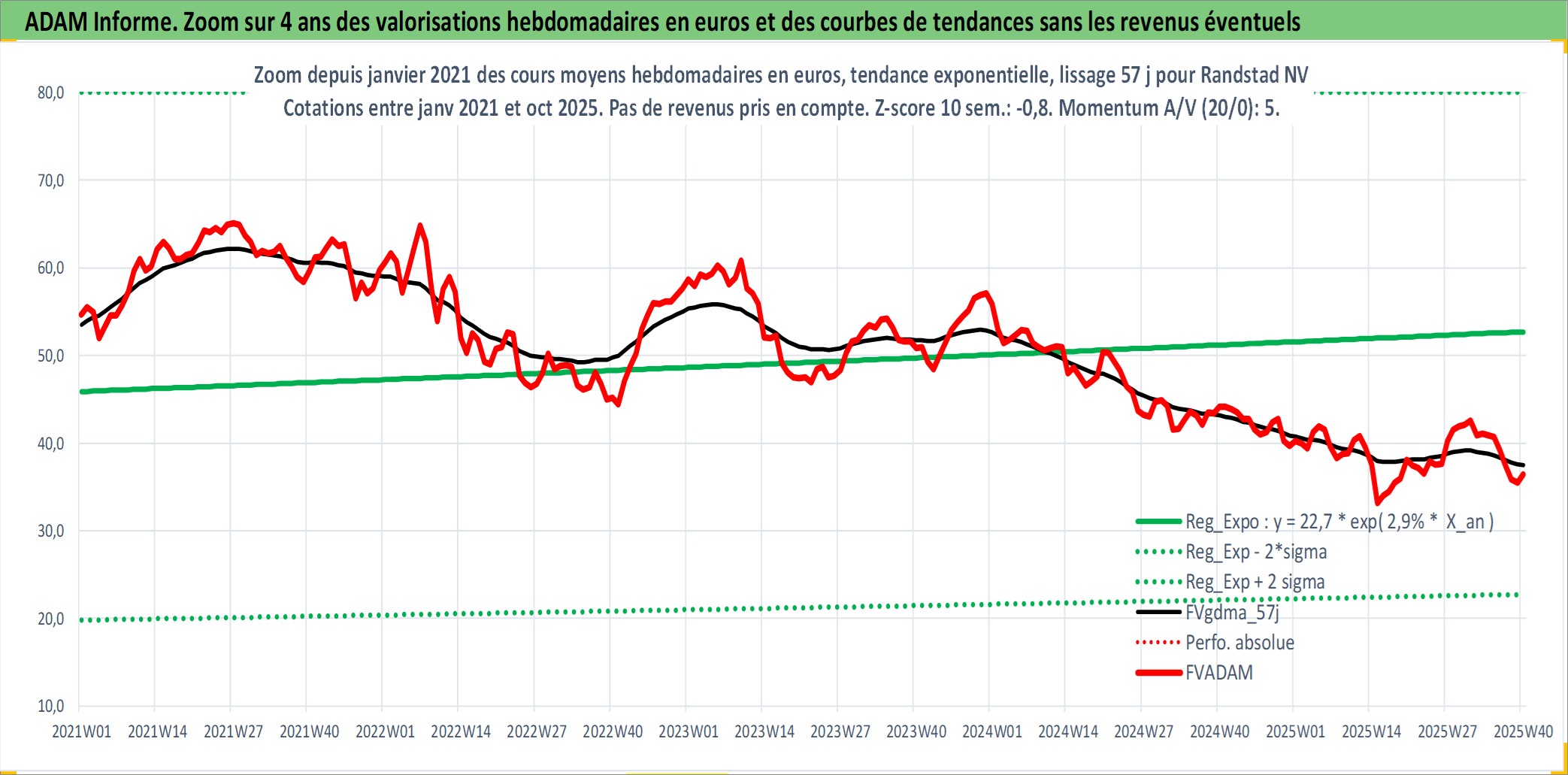 Site dédié aux investisseursPage dédiée sur site financeAnalyse des valorisations hebdomadaires de l'action Randstad NV. Cet actif est cote en EUR. Les valorisations couvrent les semaines 1997W01 a 2025W40. Les revenus de cet actif financier sont pris en compte depuis la semaine 1997W21. La note globale ESG de cet actif est estimee a 16.0 (apres rebasage entre 0 et 20).