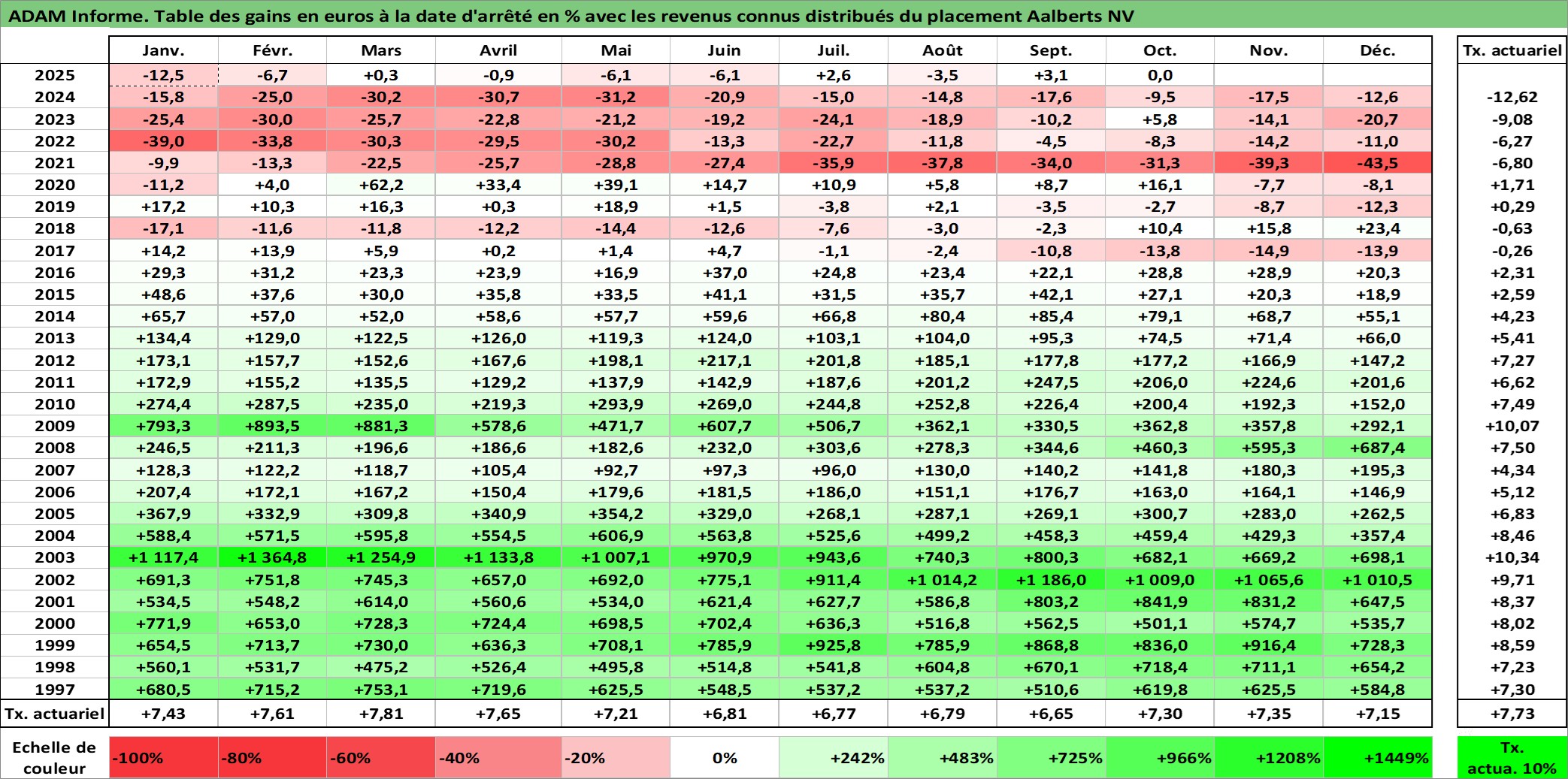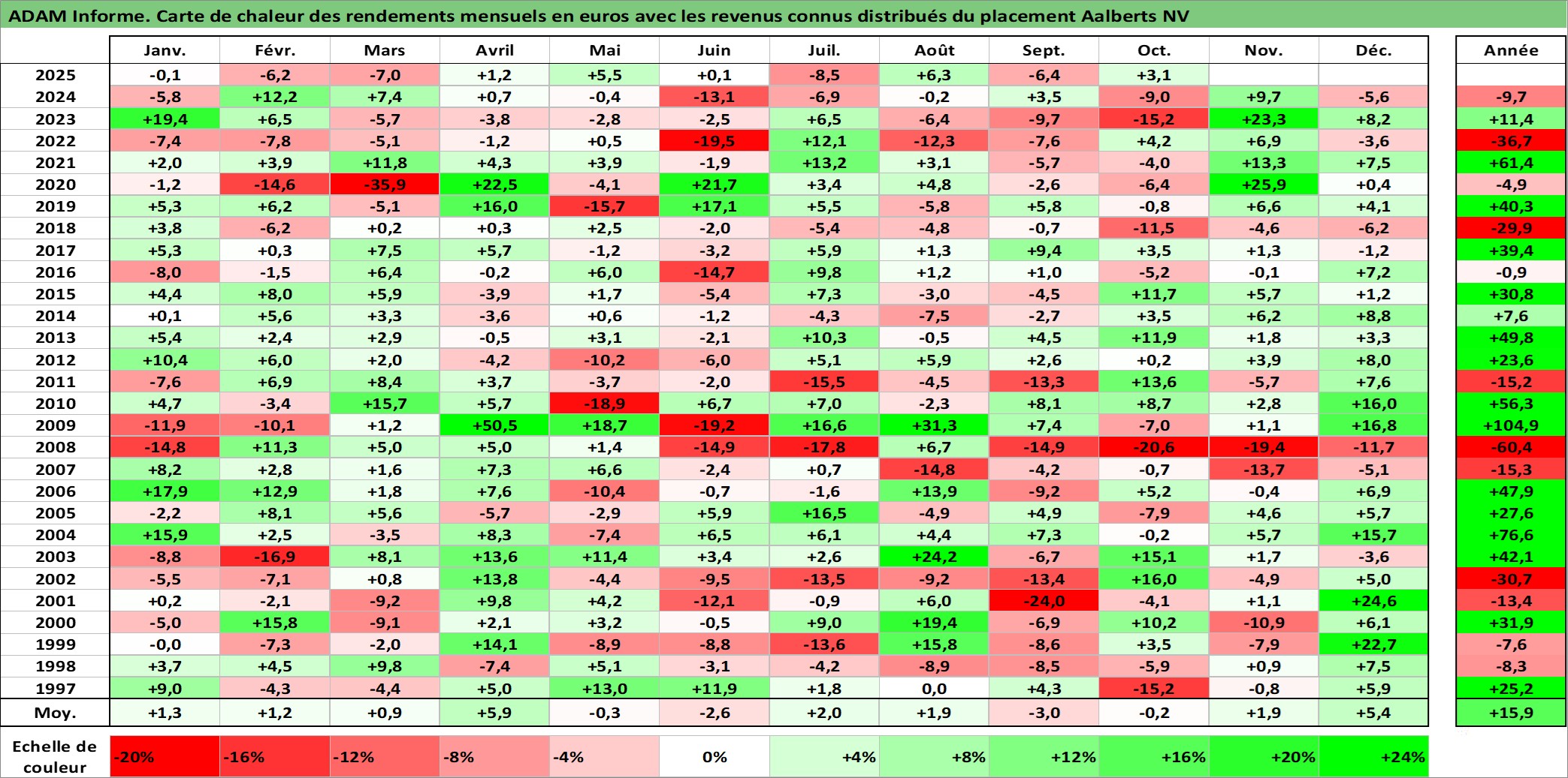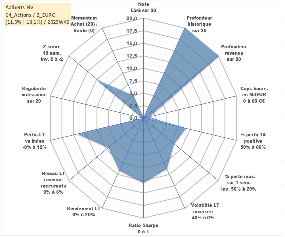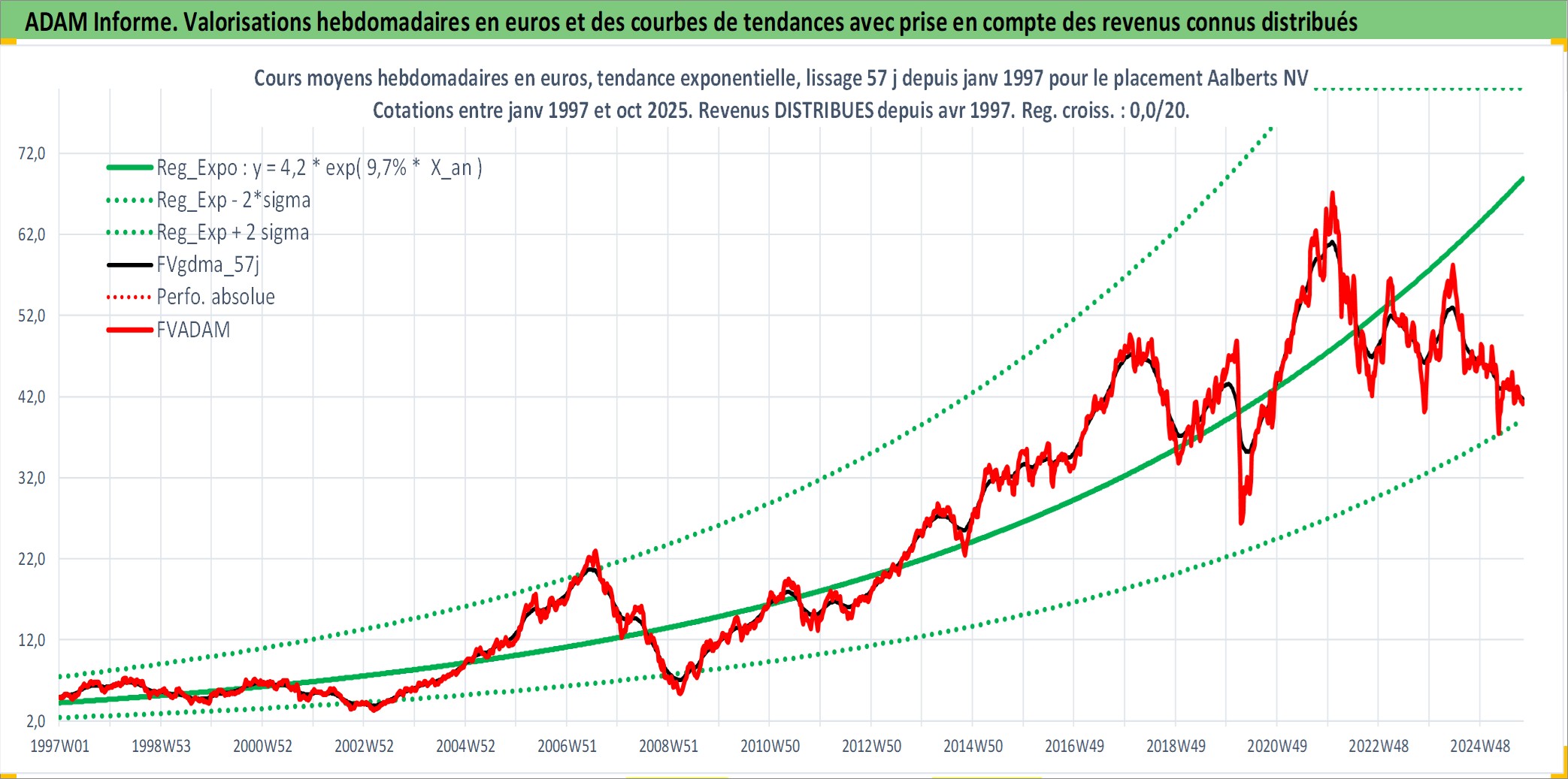 Site dédié aux investisseursPage dédiée sur site financeAnalyse des valorisations hebdomadaires de l'action Aalberts NV. Cet actif est cote en EUR. Les valorisations couvrent les semaines 1997W01 a 2025W40. Les revenus de cet actif financier sont pris en compte depuis la semaine 1997W16. La note ESG de cet actif n'est pas connue.