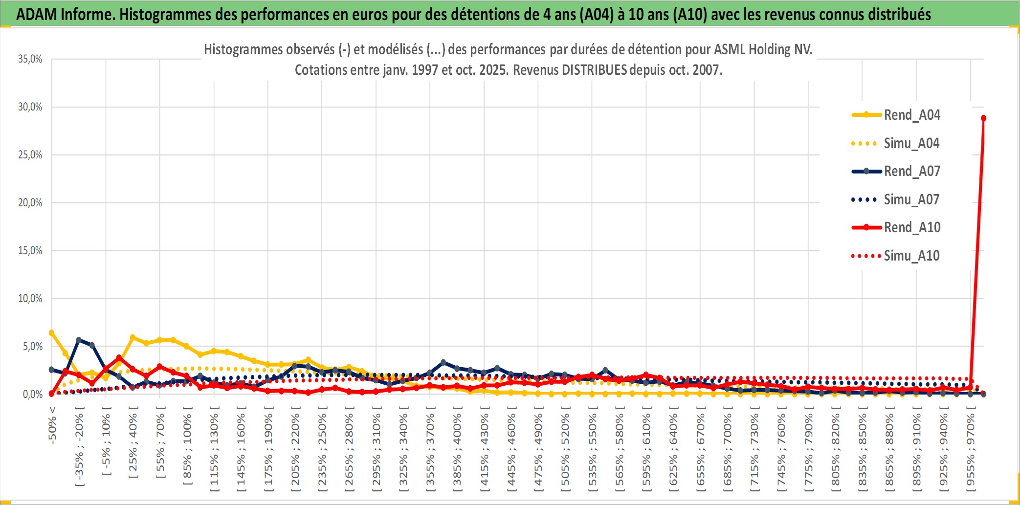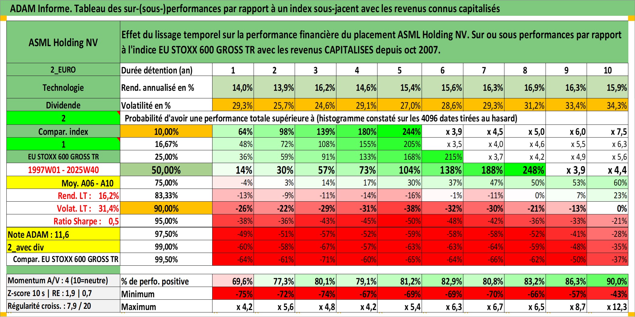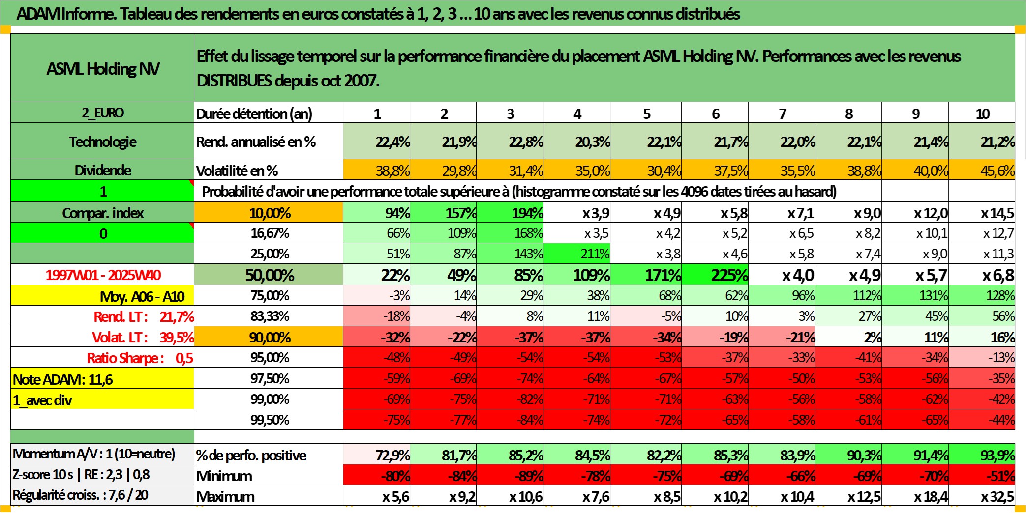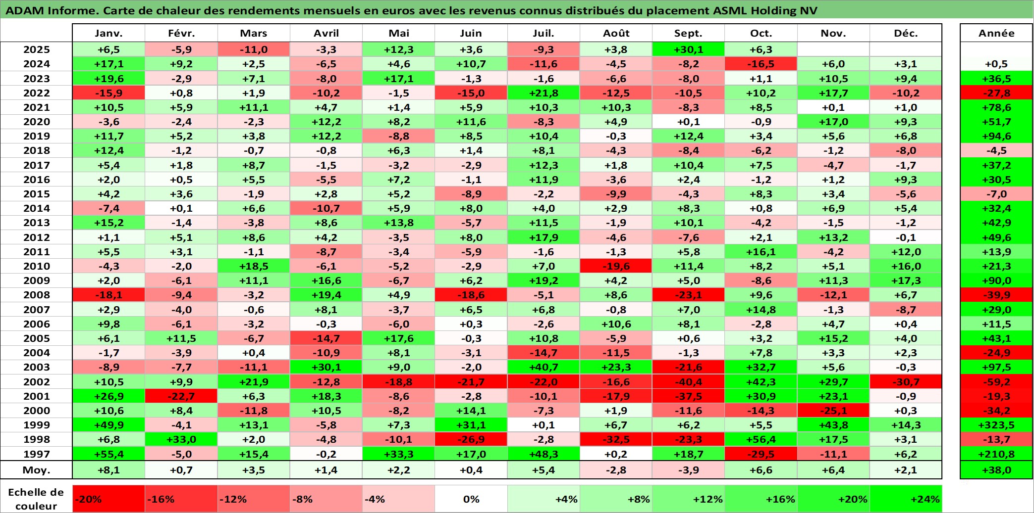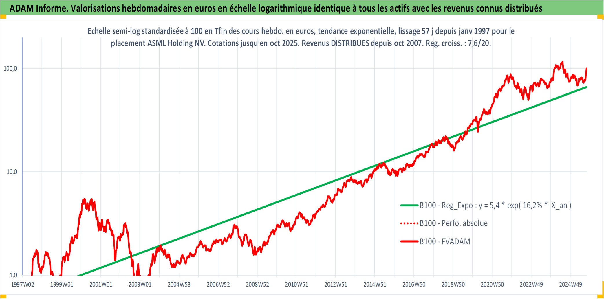 Site dédié aux investisseursPage dédiée sur site financeAnalyse des valorisations hebdomadaires de l'action ASML Holding NV. Cet actif est cote en EUR. Les valorisations couvrent les semaines 1997W01 a 2025W40. Les revenus de cet actif financier sont pris en compte depuis la semaine 2007W40. La note globale ESG de cet actif est estimee a 16.0 (apres rebasage entre 0 et 20).