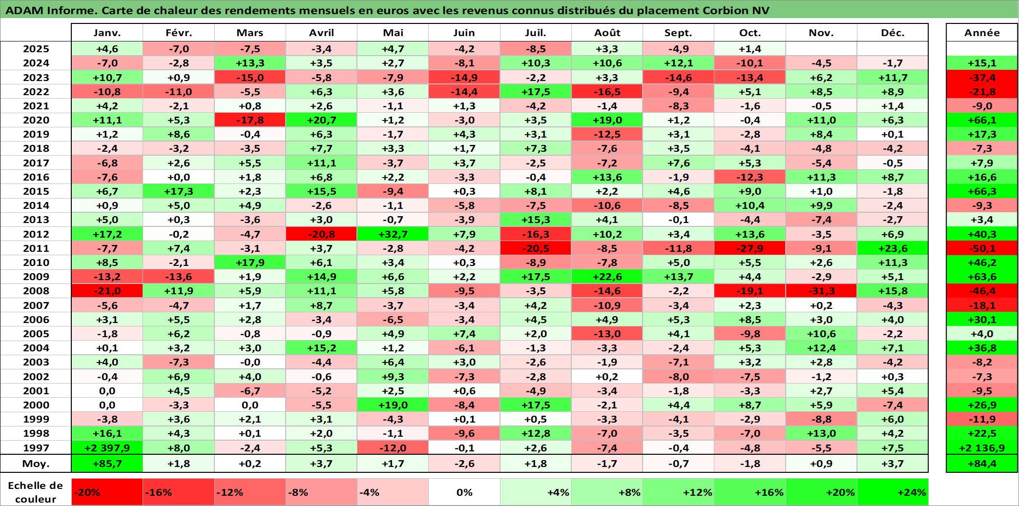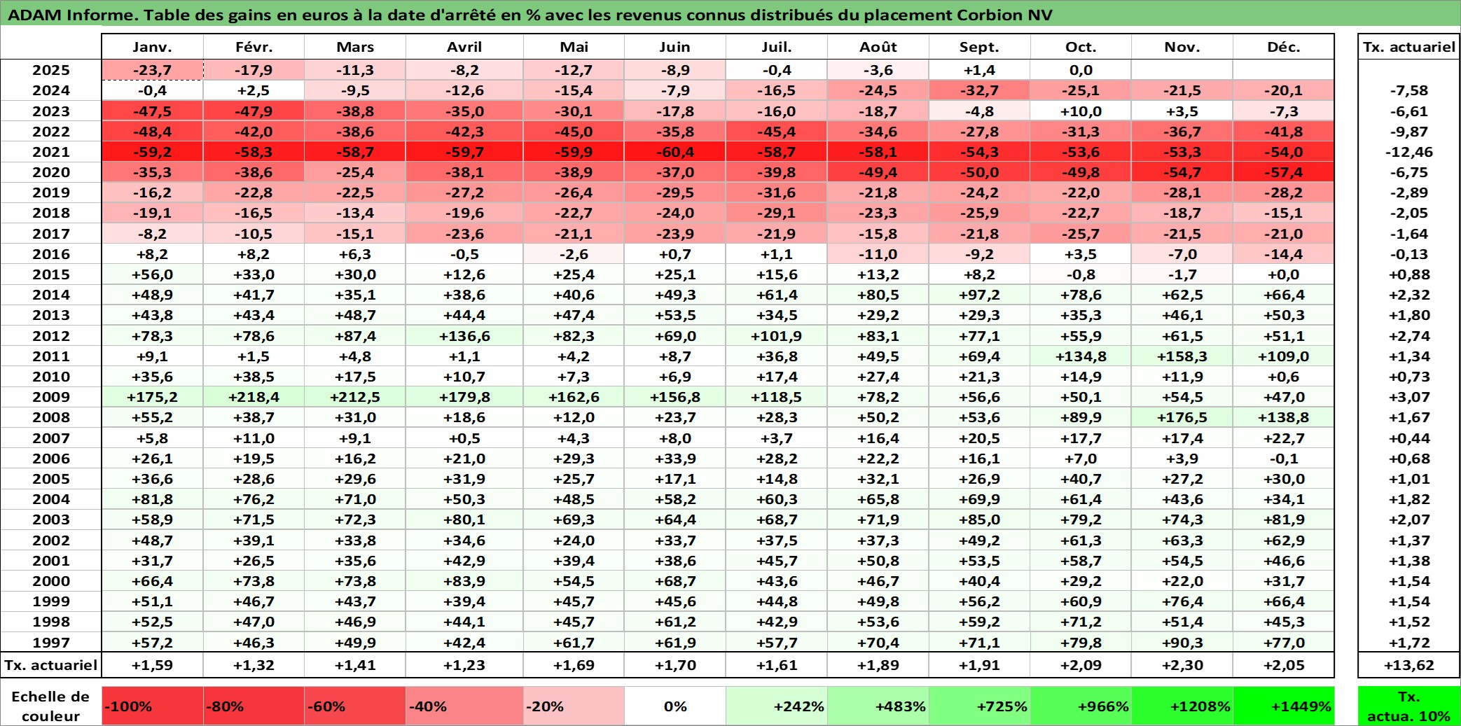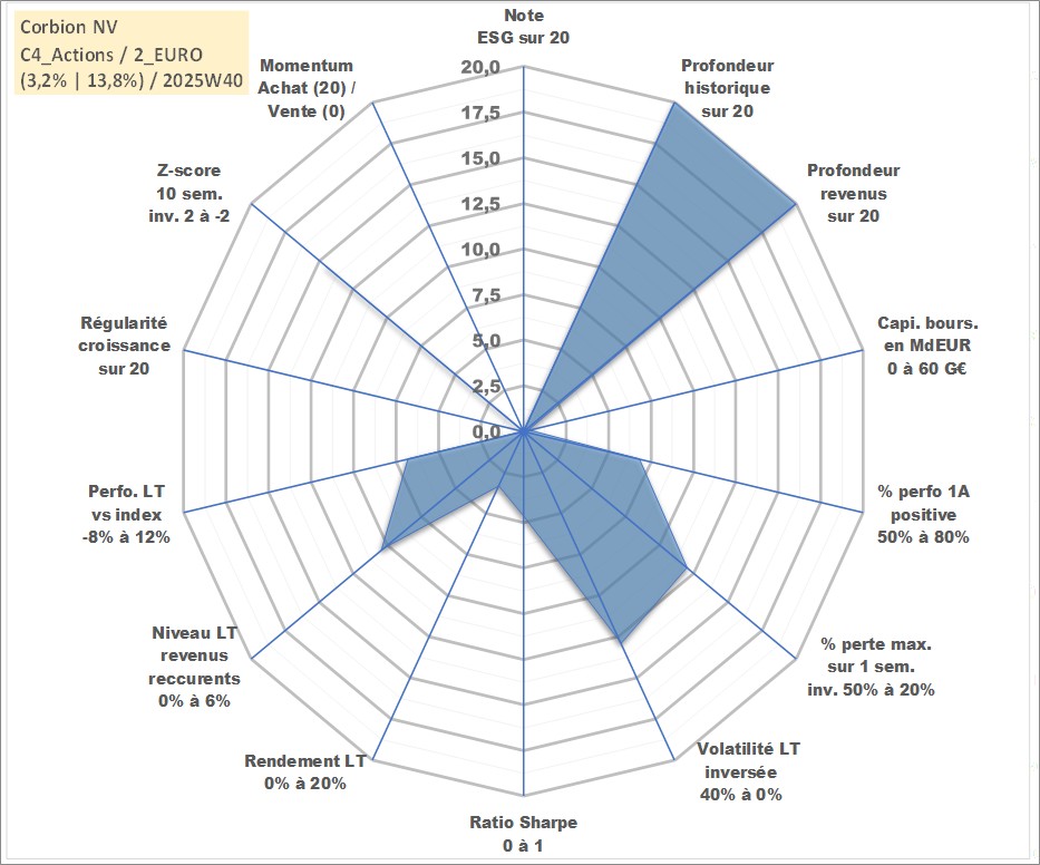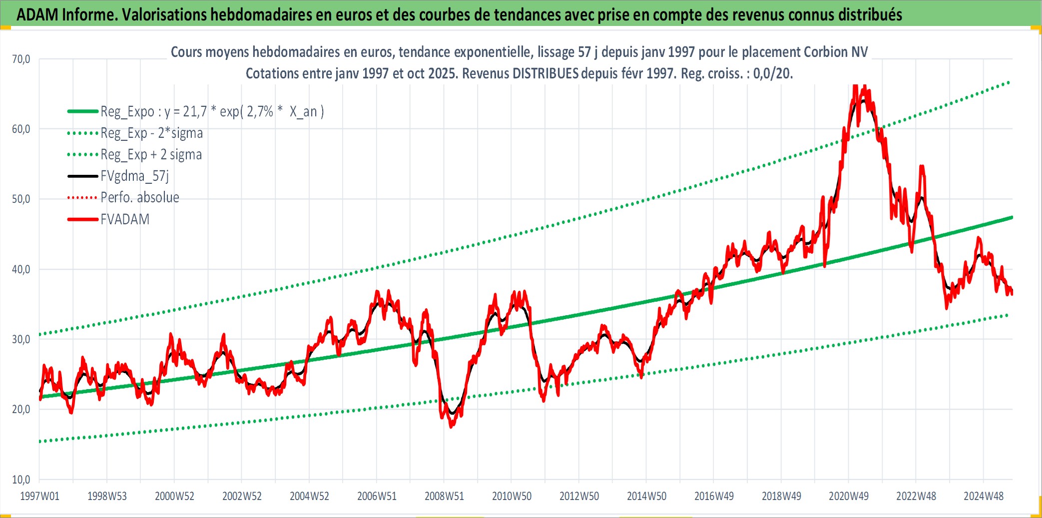 Site dédié aux investisseursPage dédiée sur site financeAnalyse des valorisations hebdomadaires de l'action Corbion NV. Cet actif est cote en EUR. Les valorisations couvrent les semaines 1997W01 a 2025W40. Les revenus de cet actif financier sont pris en compte depuis la semaine 1997W08. La note ESG de cet actif n'est pas connue.
