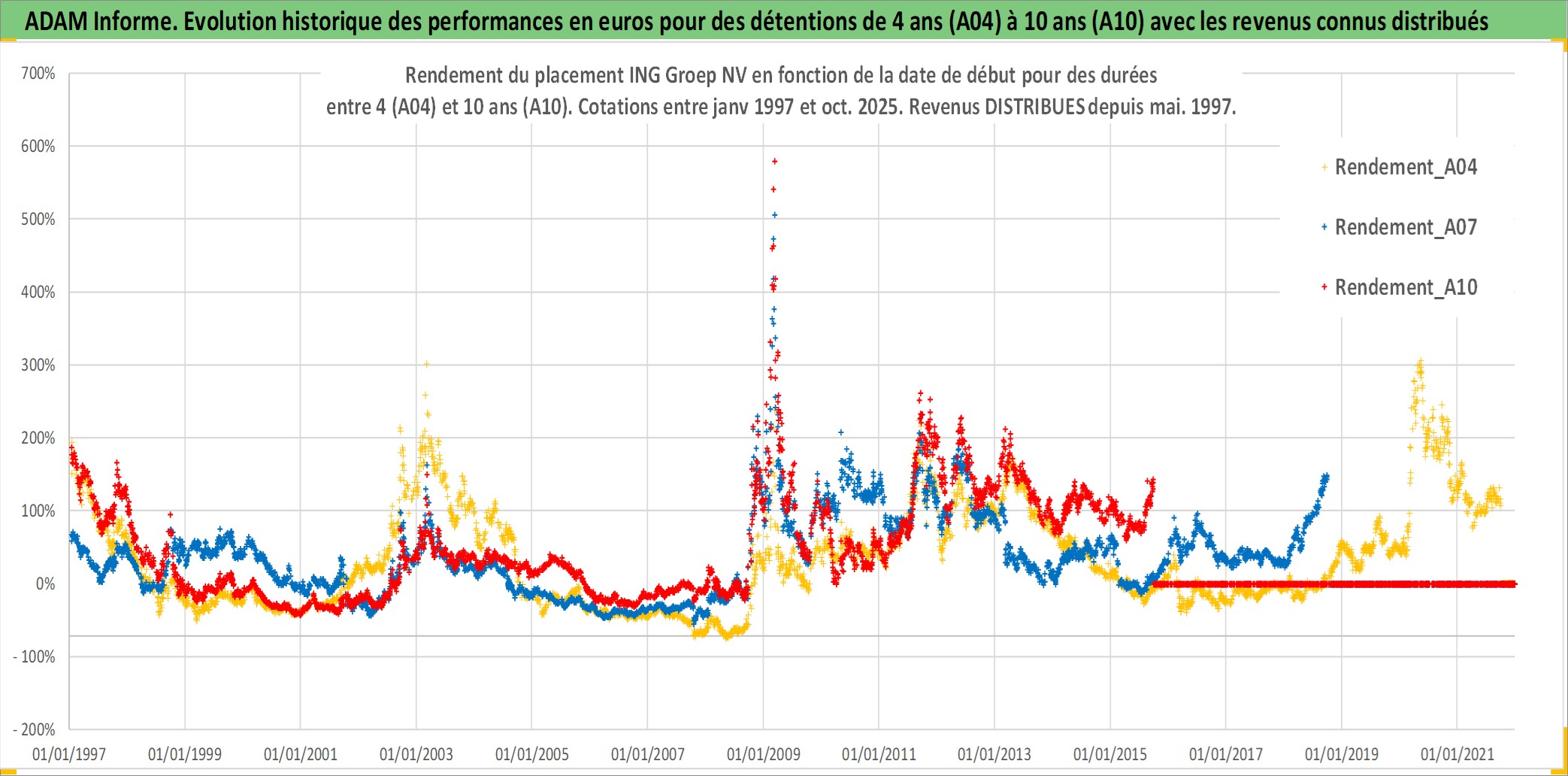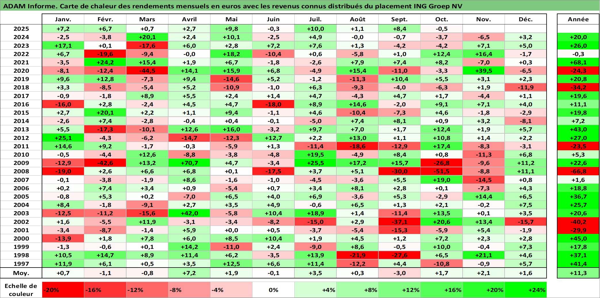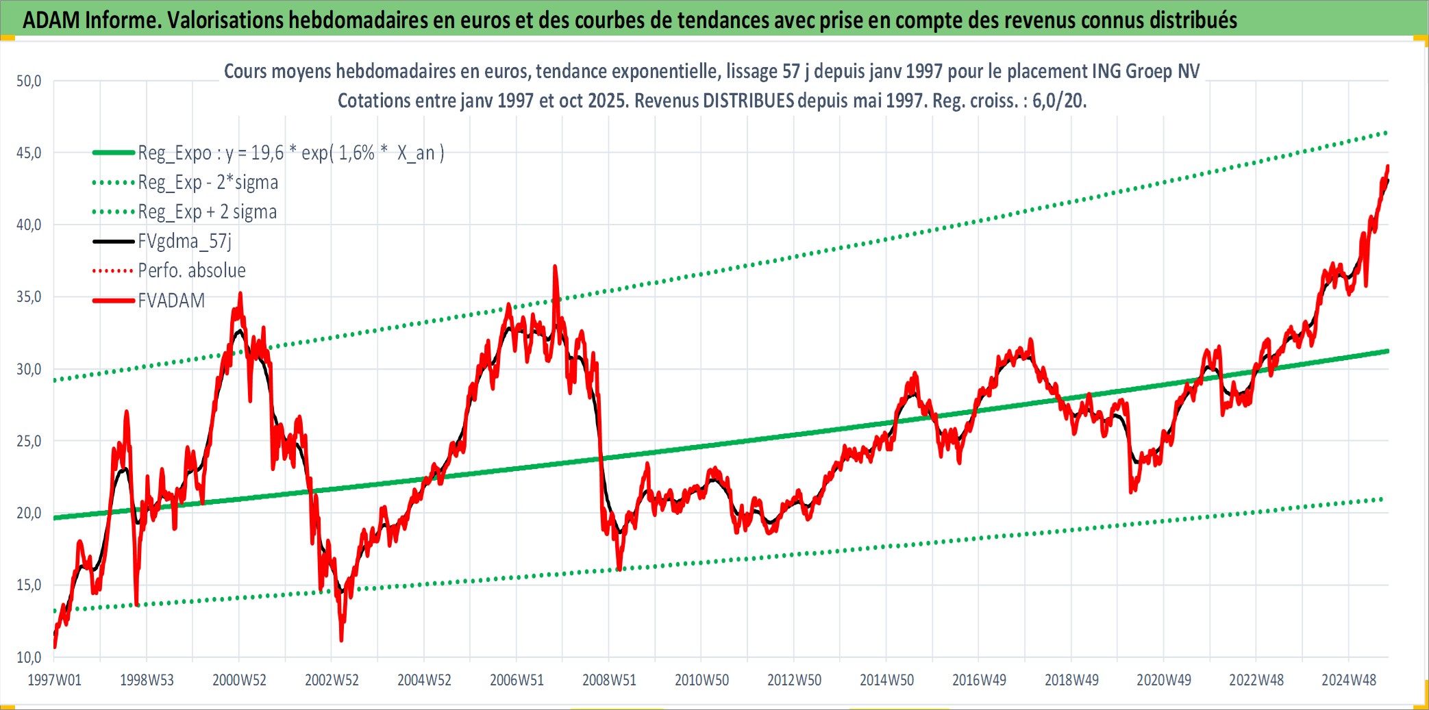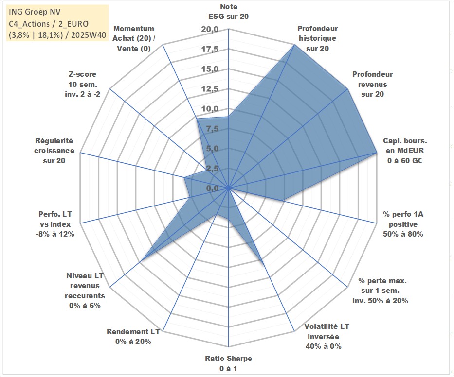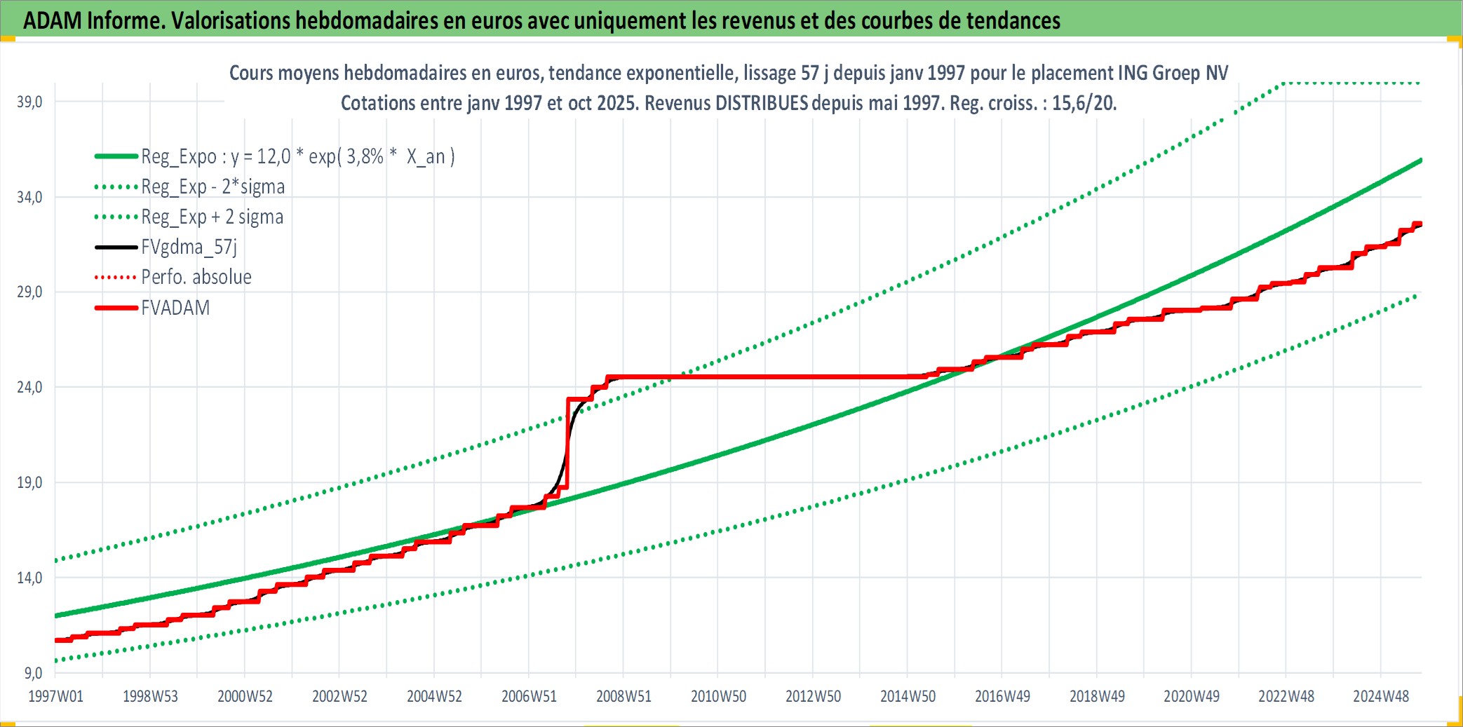 Site dédié aux investisseursPage dédiée sur site financeAnalyse des valorisations hebdomadaires de l'action ING Groep NV. Cet actif est cote en EUR. Les valorisations couvrent les semaines 1997W01 a 2025W40. Les revenus de cet actif financier sont pris en compte depuis la semaine 1997W19. La note globale ESG de cet actif est estimee a 9.0 (apres rebasage entre 0 et 20).