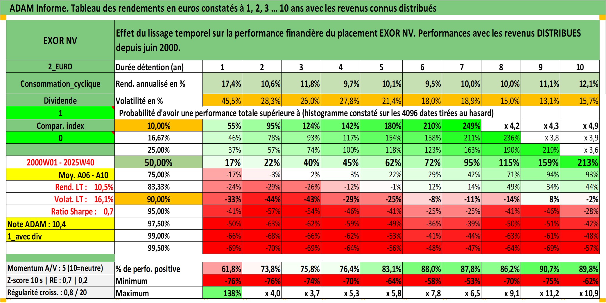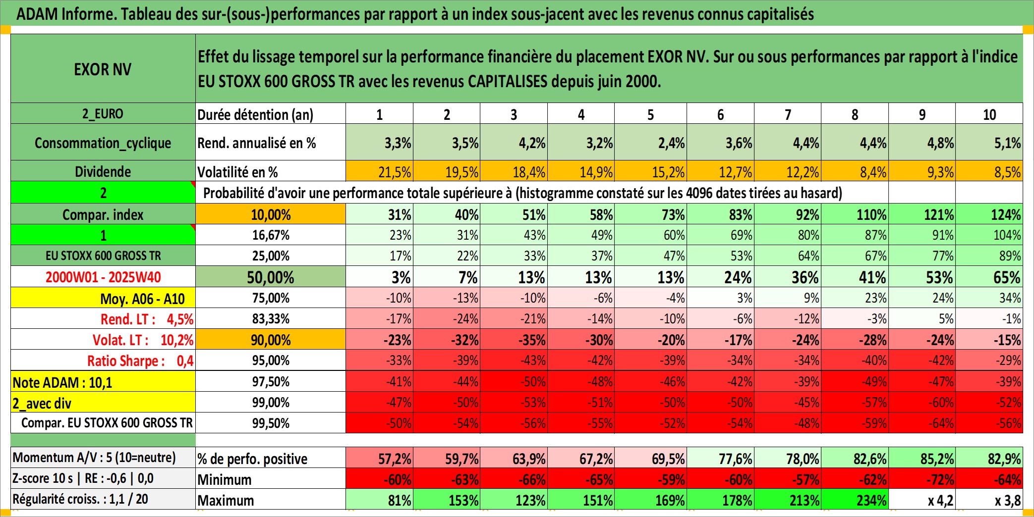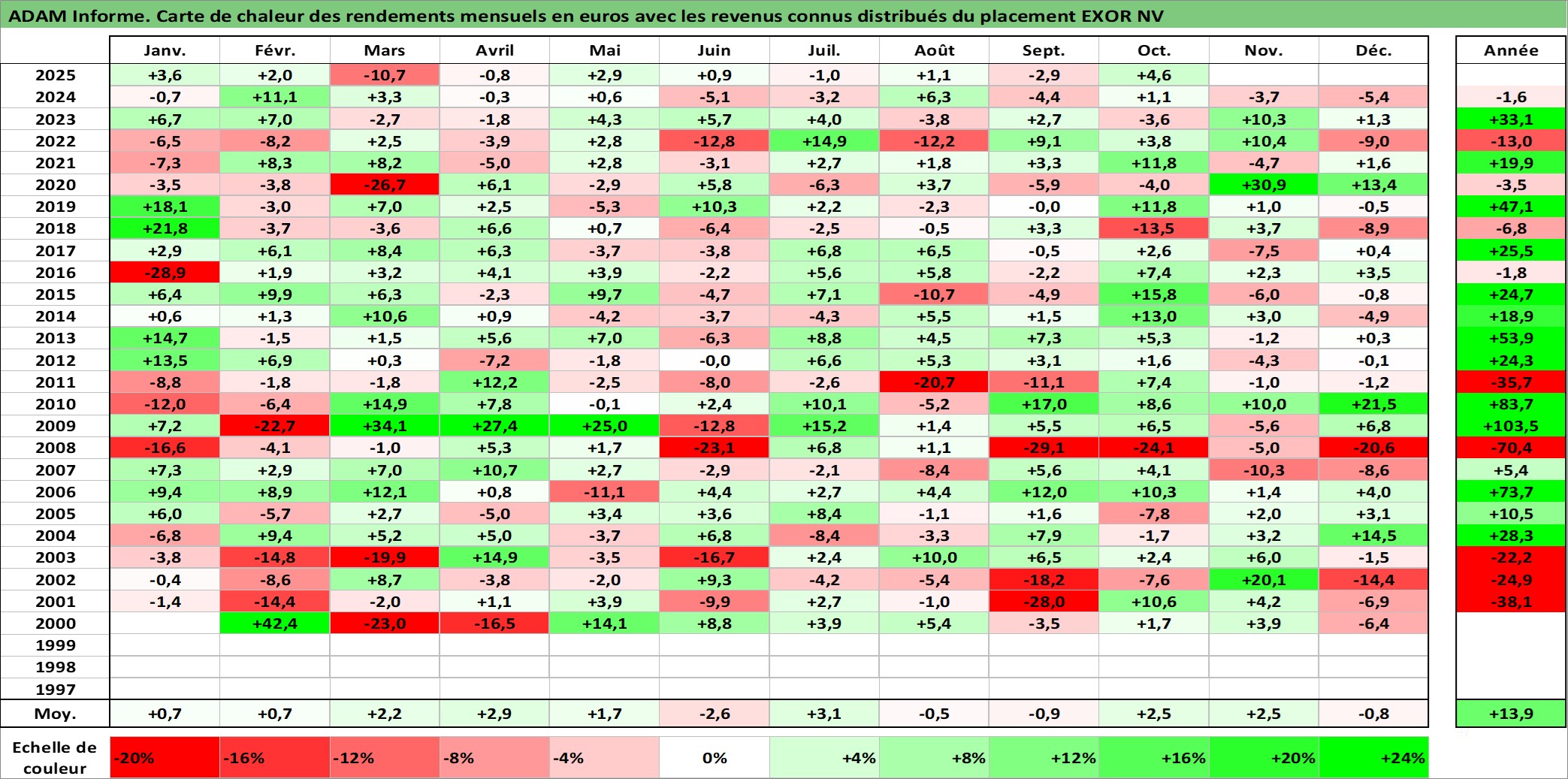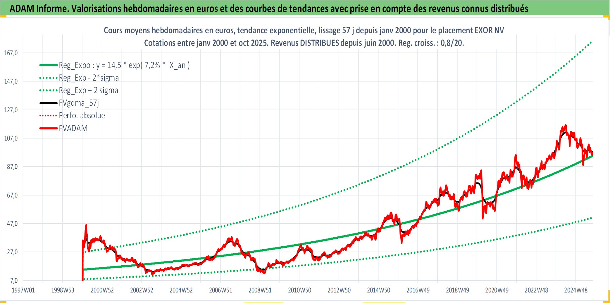 Site dédié aux investisseursPage dédiée sur site financeAnalyse des valorisations hebdomadaires de l'action EXOR NV. Cet actif est cote en EUR. Les valorisations couvrent les semaines 2000W01 a 2025W40. Les revenus de cet actif financier sont pris en compte depuis la semaine 2000W25. La note globale ESG de cet actif est estimee a 15.0 (apres rebasage entre 0 et 20).
